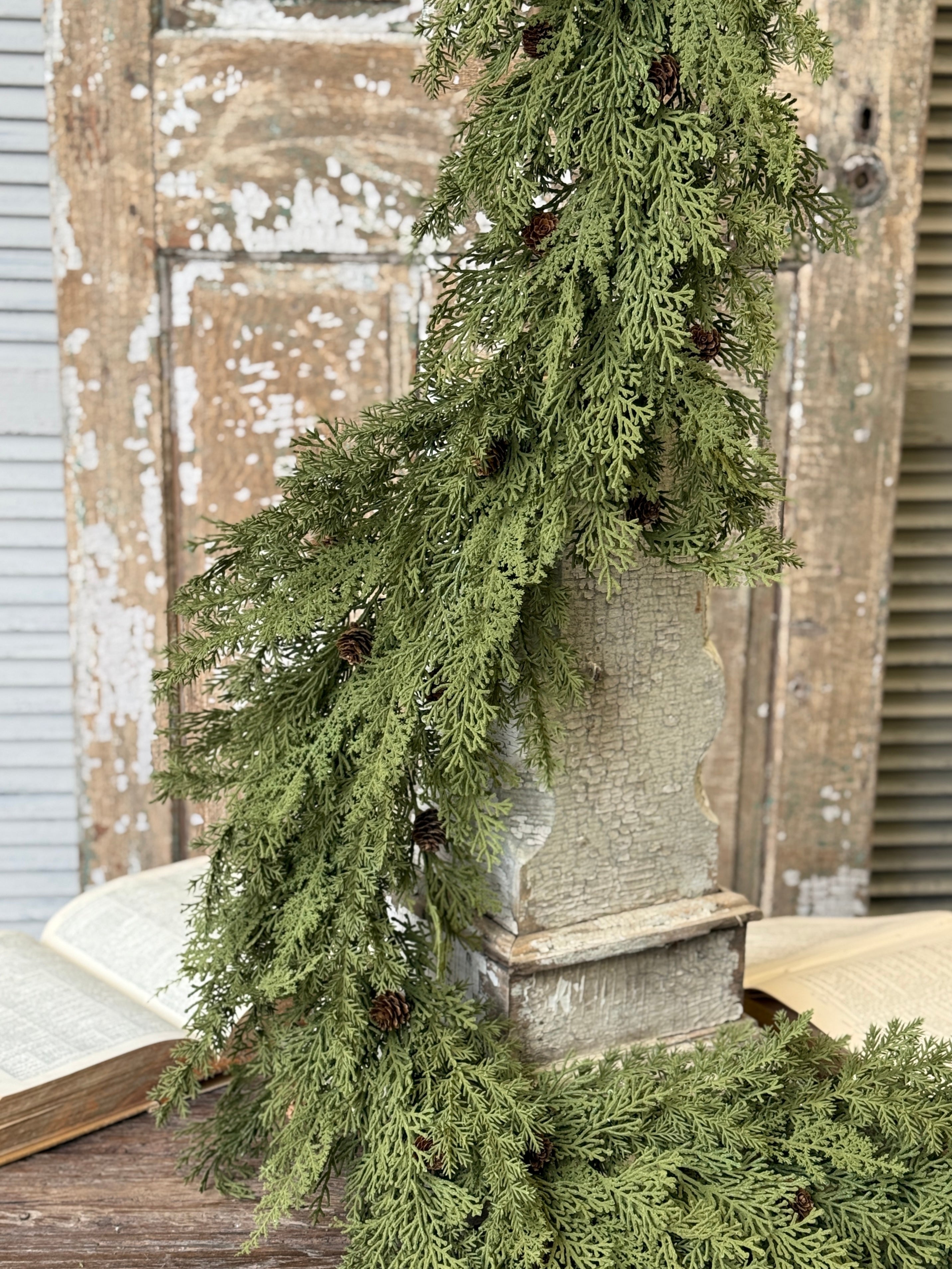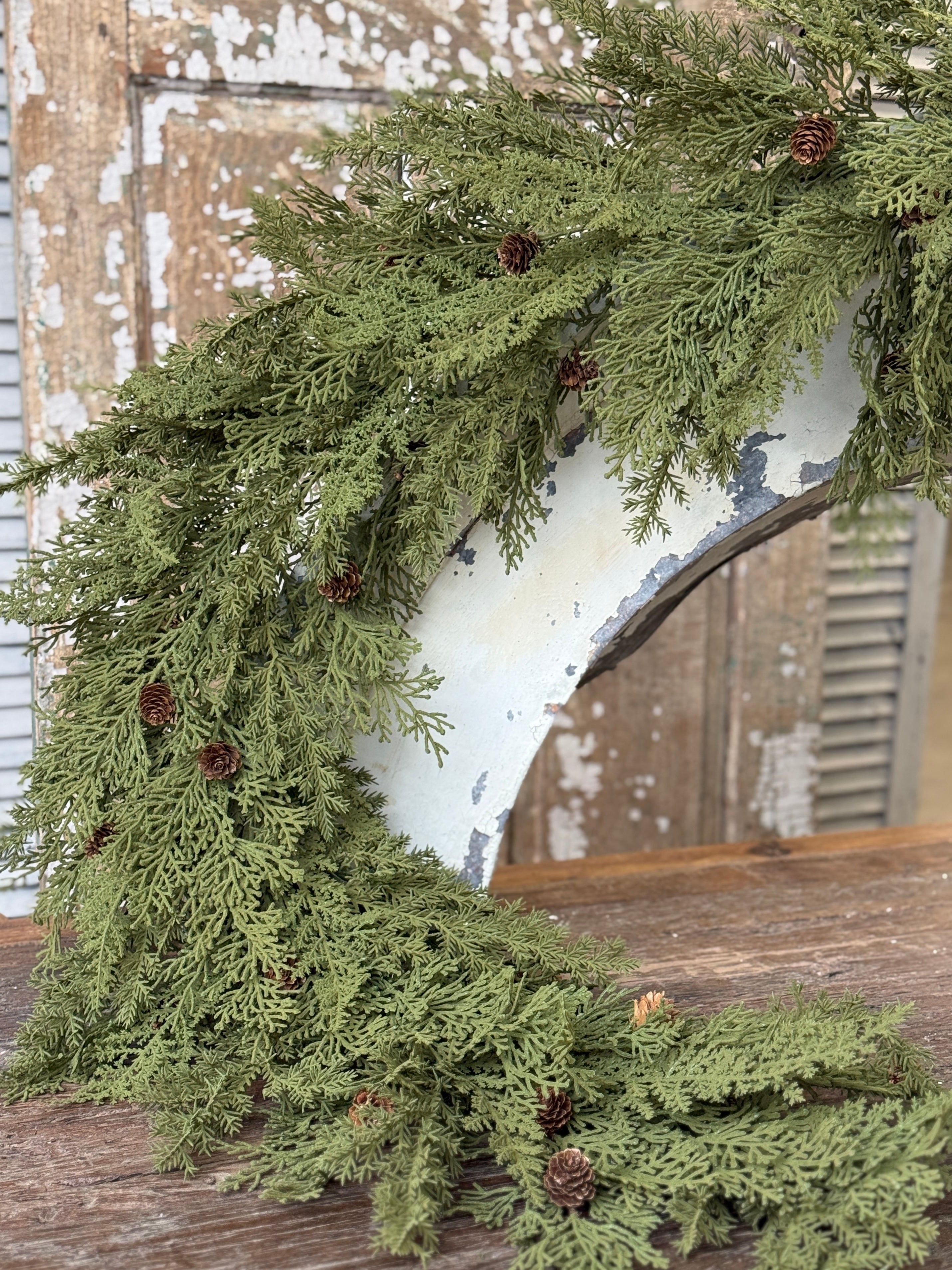 The Sentiment Cedar is a textural bounty of mixed greenery featuring broad leaved foliage dashed with natural pine cones and topped with a lightly flocked finish.