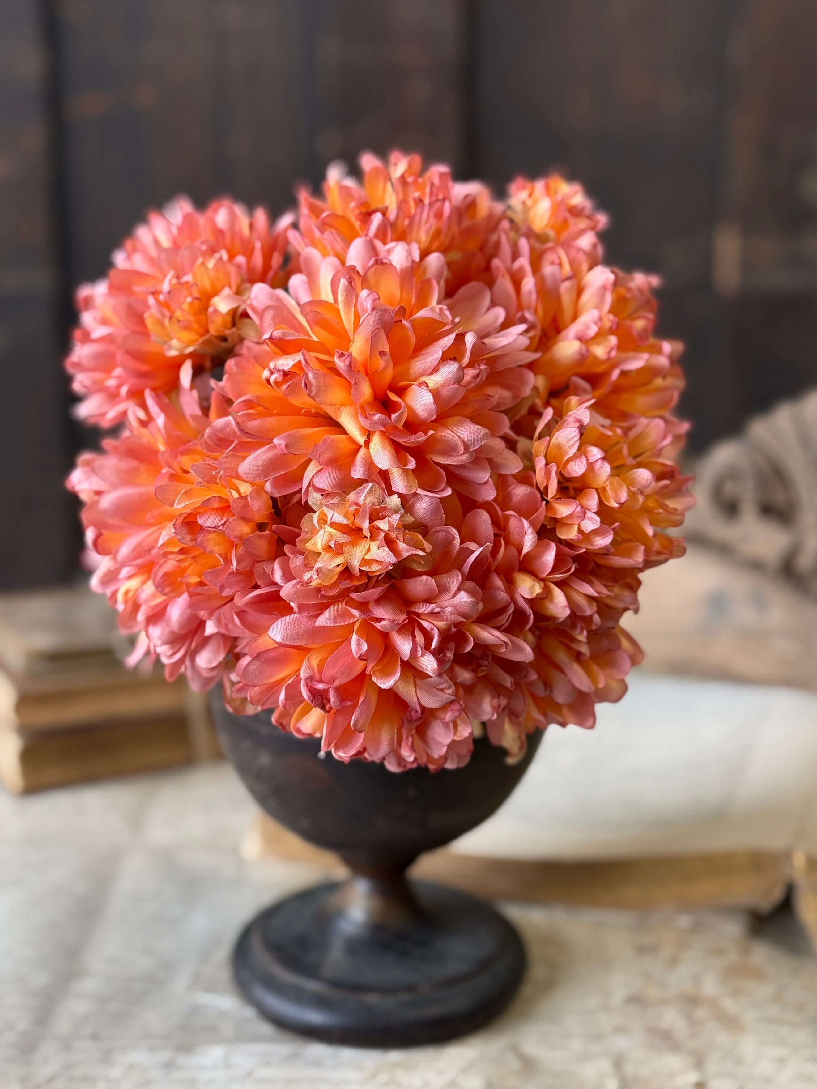 Showy stems of blooms in gorgeous colorways add a wonderful element of height to vignettes. Petals have a lovely undulating edge that gives them a fabulously textured look. Available in four colors, each sold separately.
