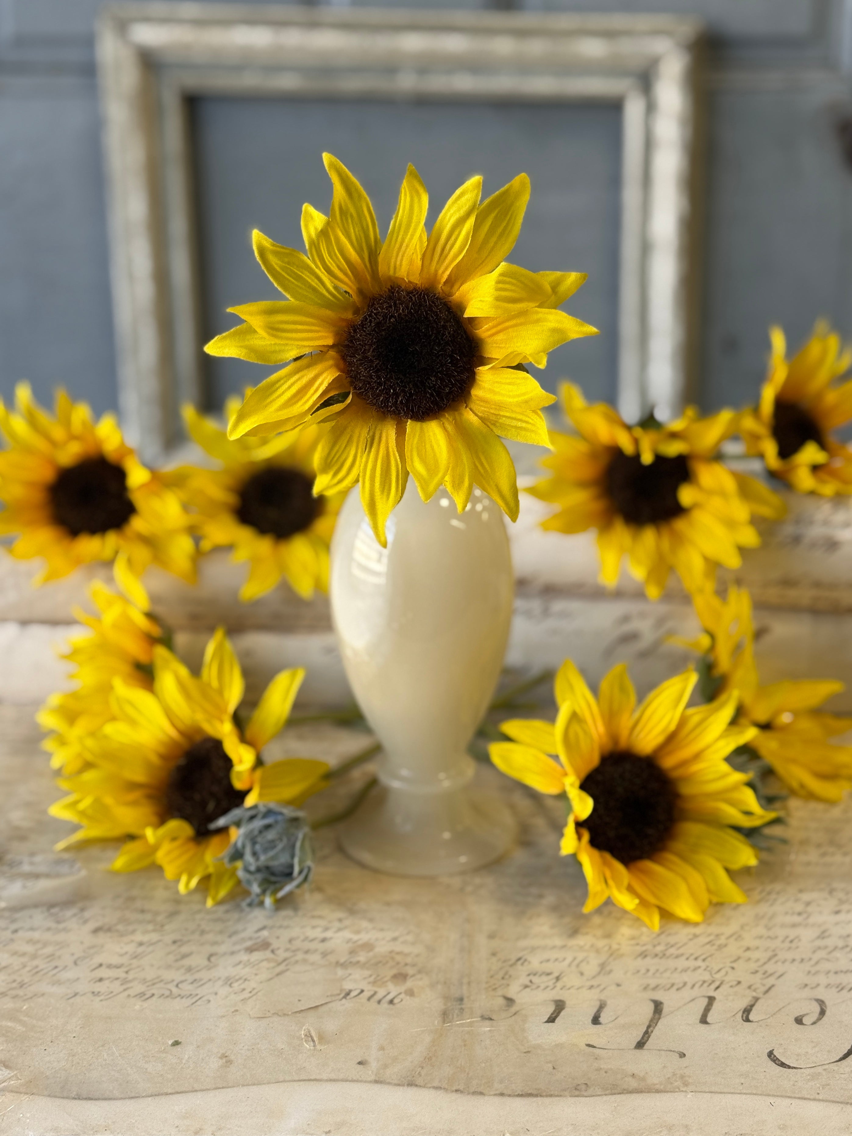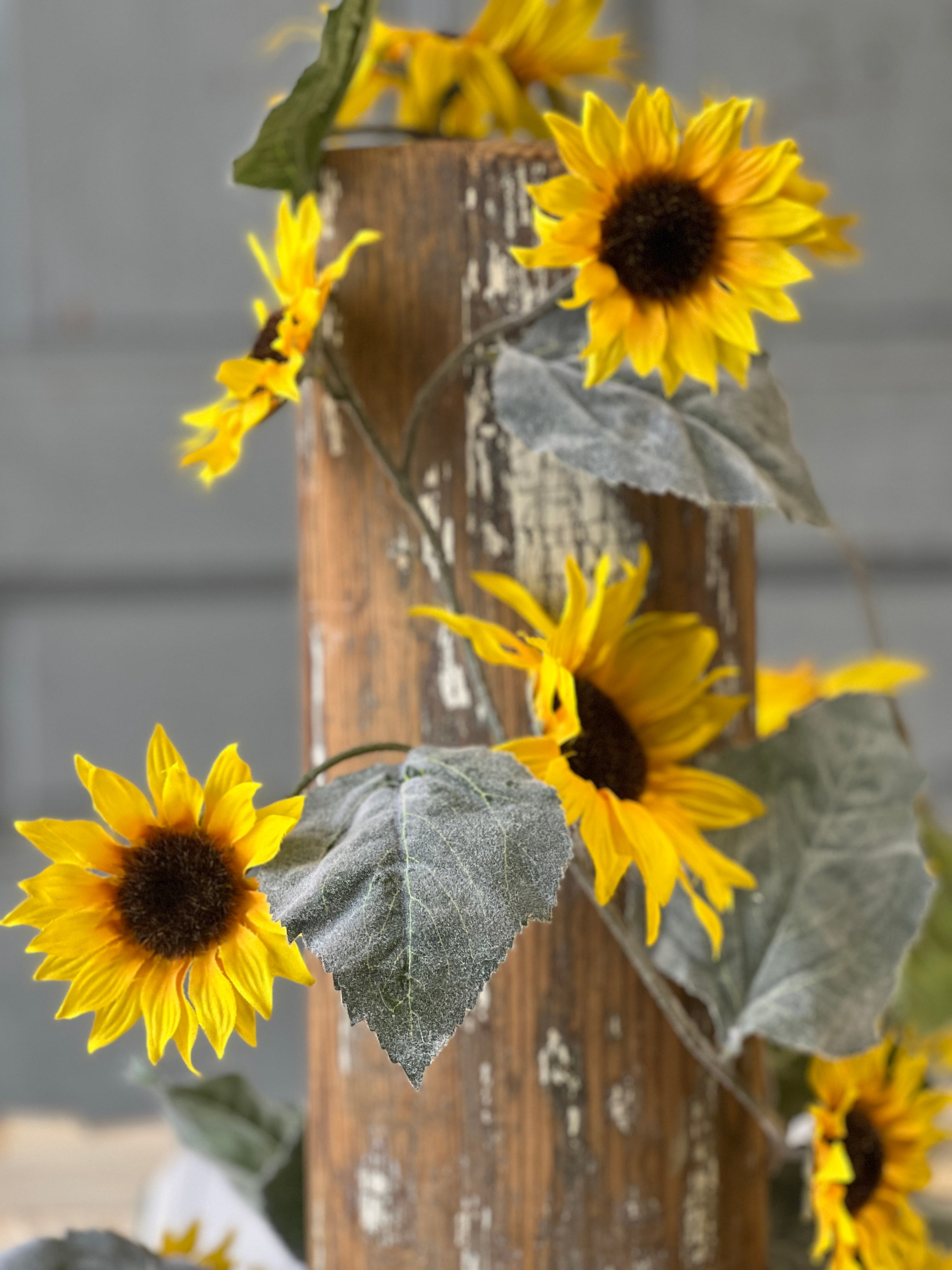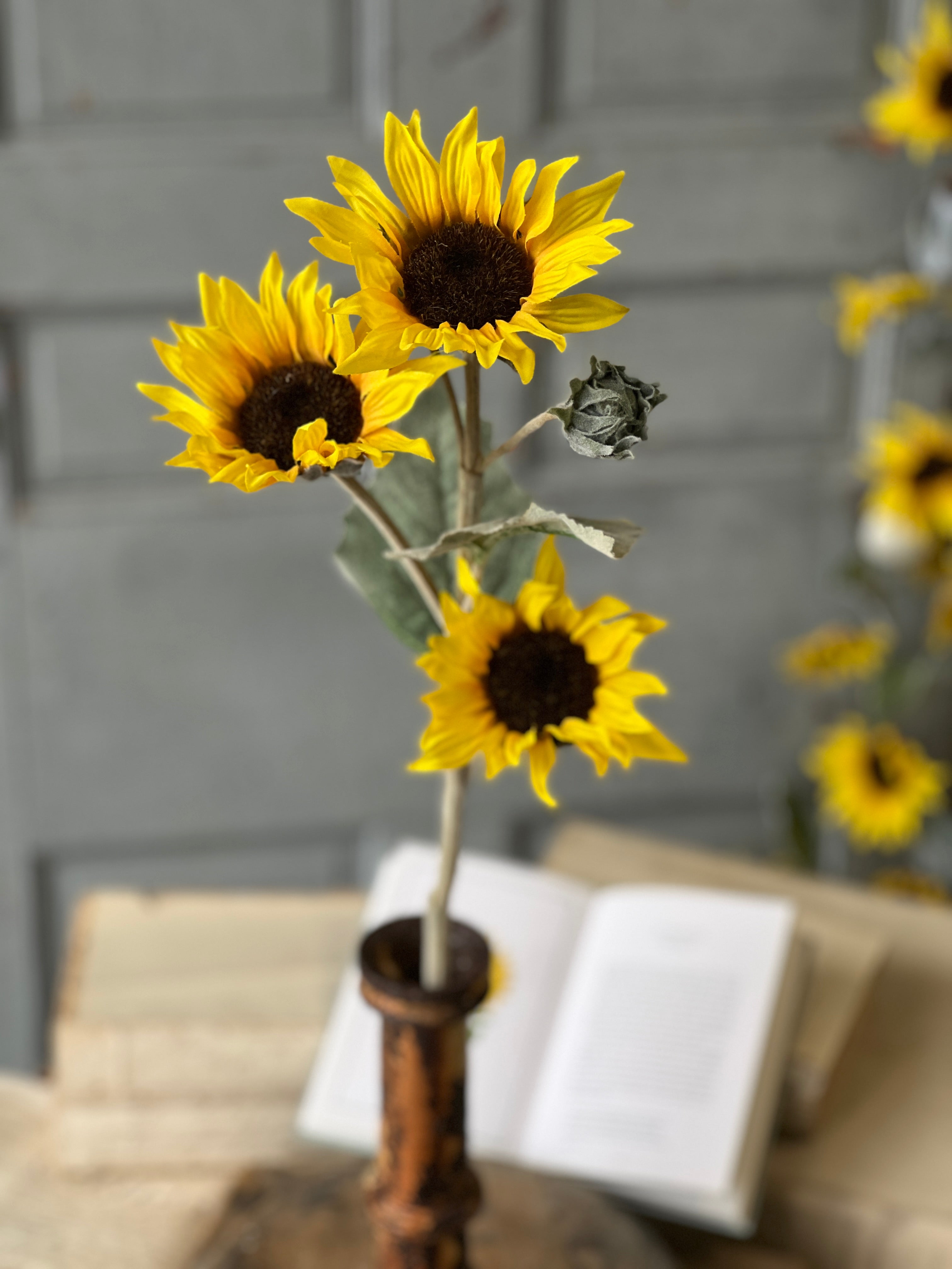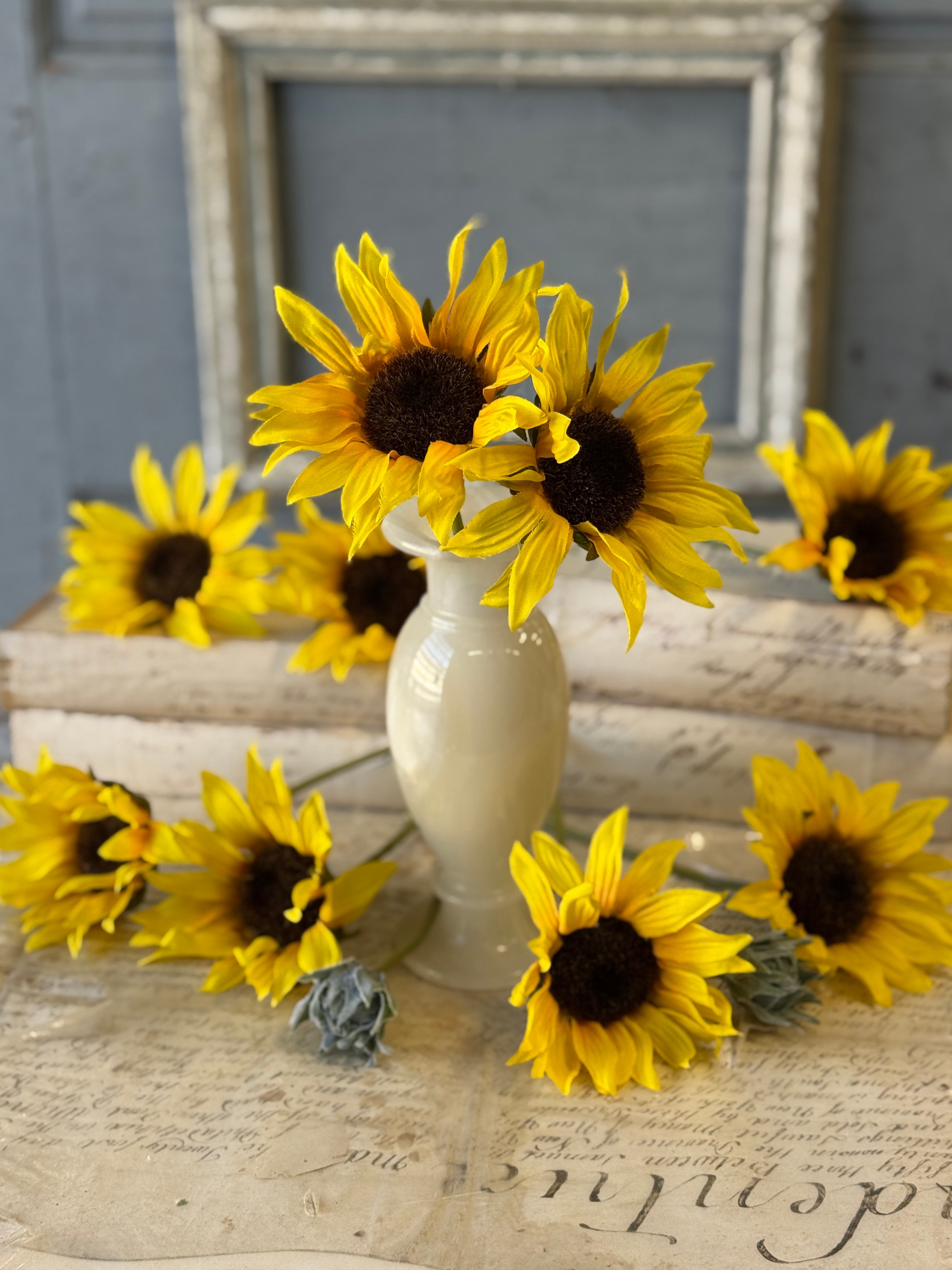Beguiling blooms with textured petals and showy centers deliver a ray a sunshine wherever they are displayed. Flocked leaves and buds only add to the charm of this collection. Each bundle contains 11 stems bound with a raffia tie.