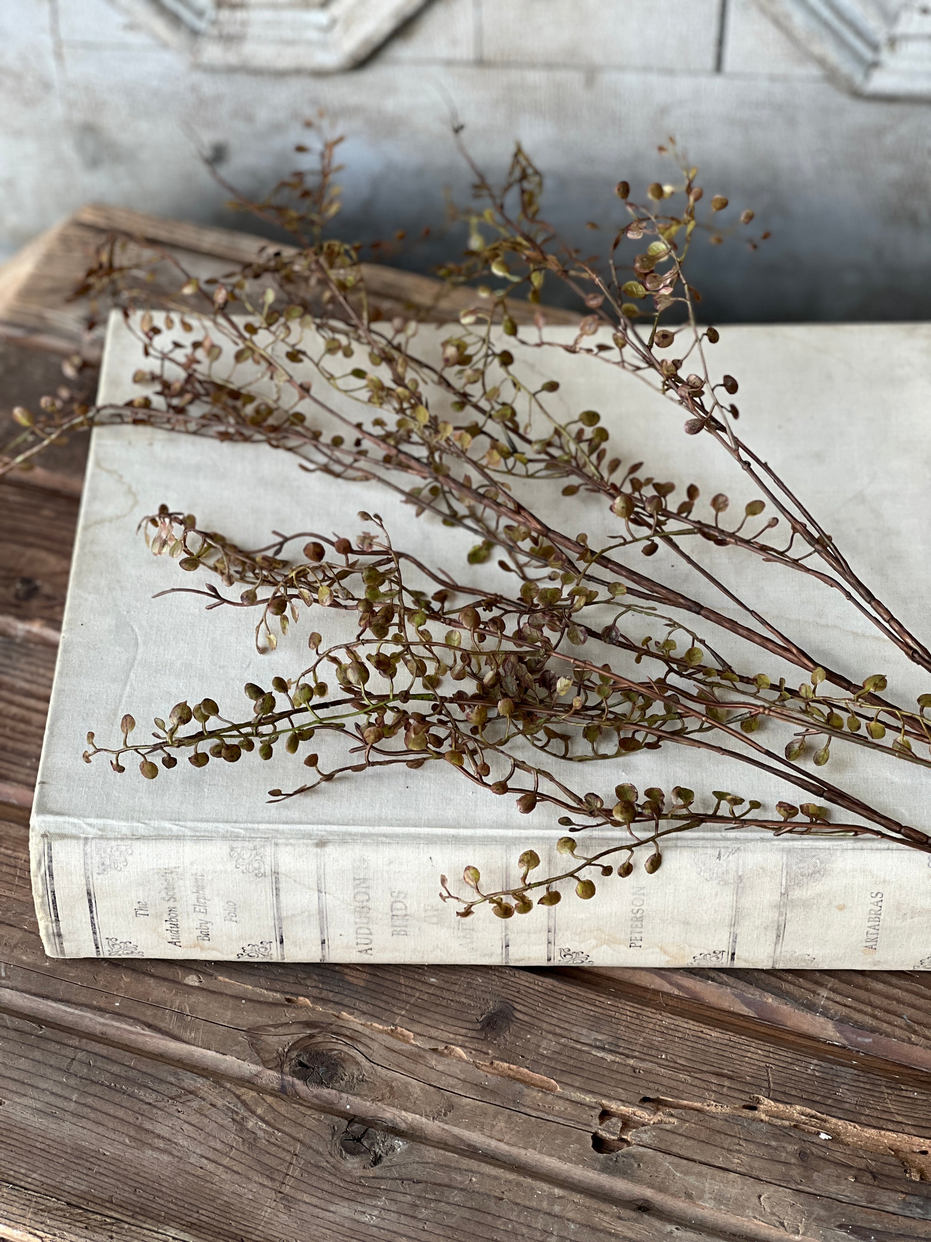 Spear shaped leaves in shifting tones with a mottled effect are peppered with small decorative sprigs and trailing tendrils. The Burlington Leaves brings a punch of color and texture to any display and is sure to become a new transitional favorite!