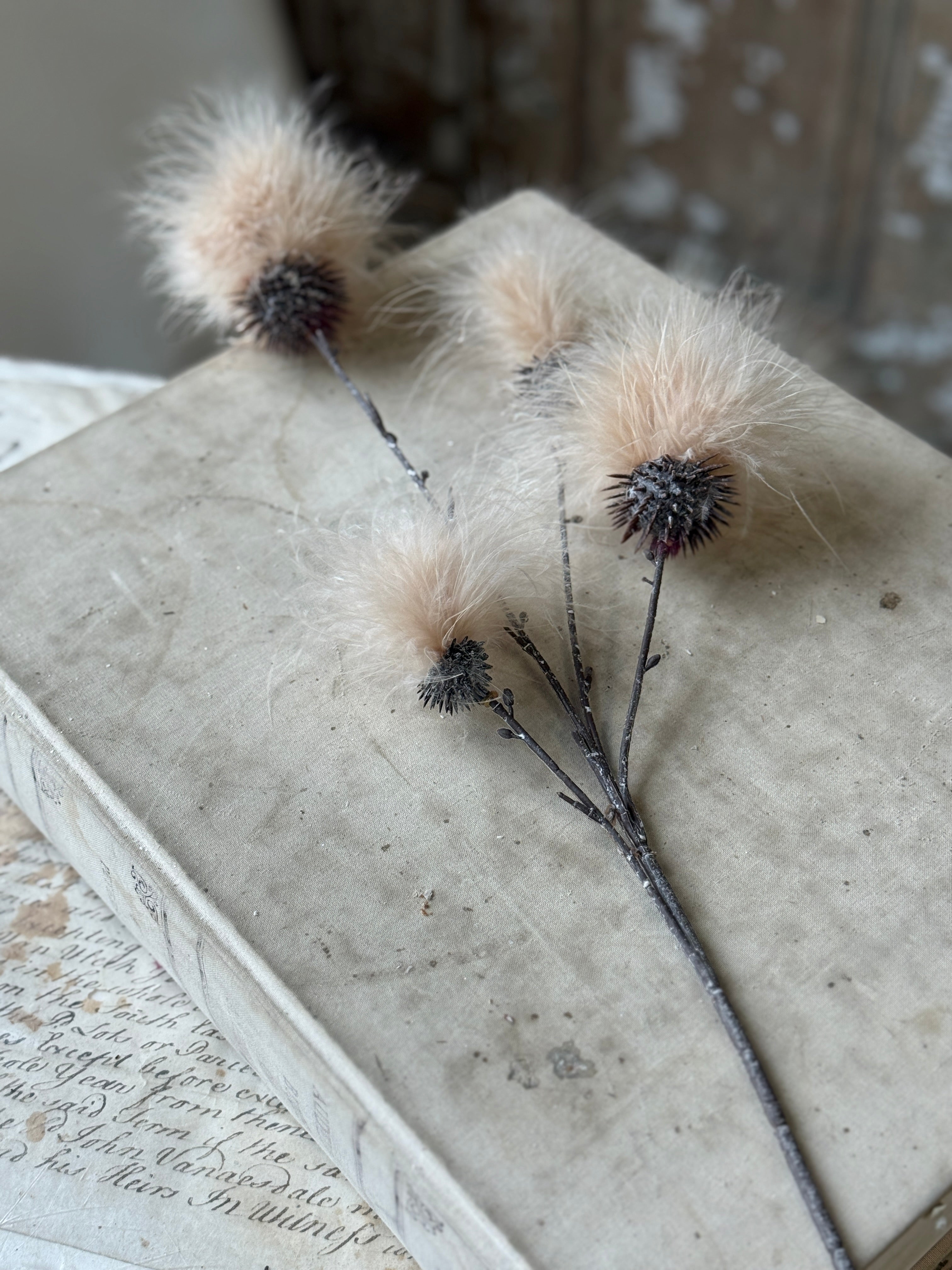 Stems topped with spiky orbs add a wonderful note of whimsy to vignettes. Would pair easily with other florals. Available in four colors, each sold separately.