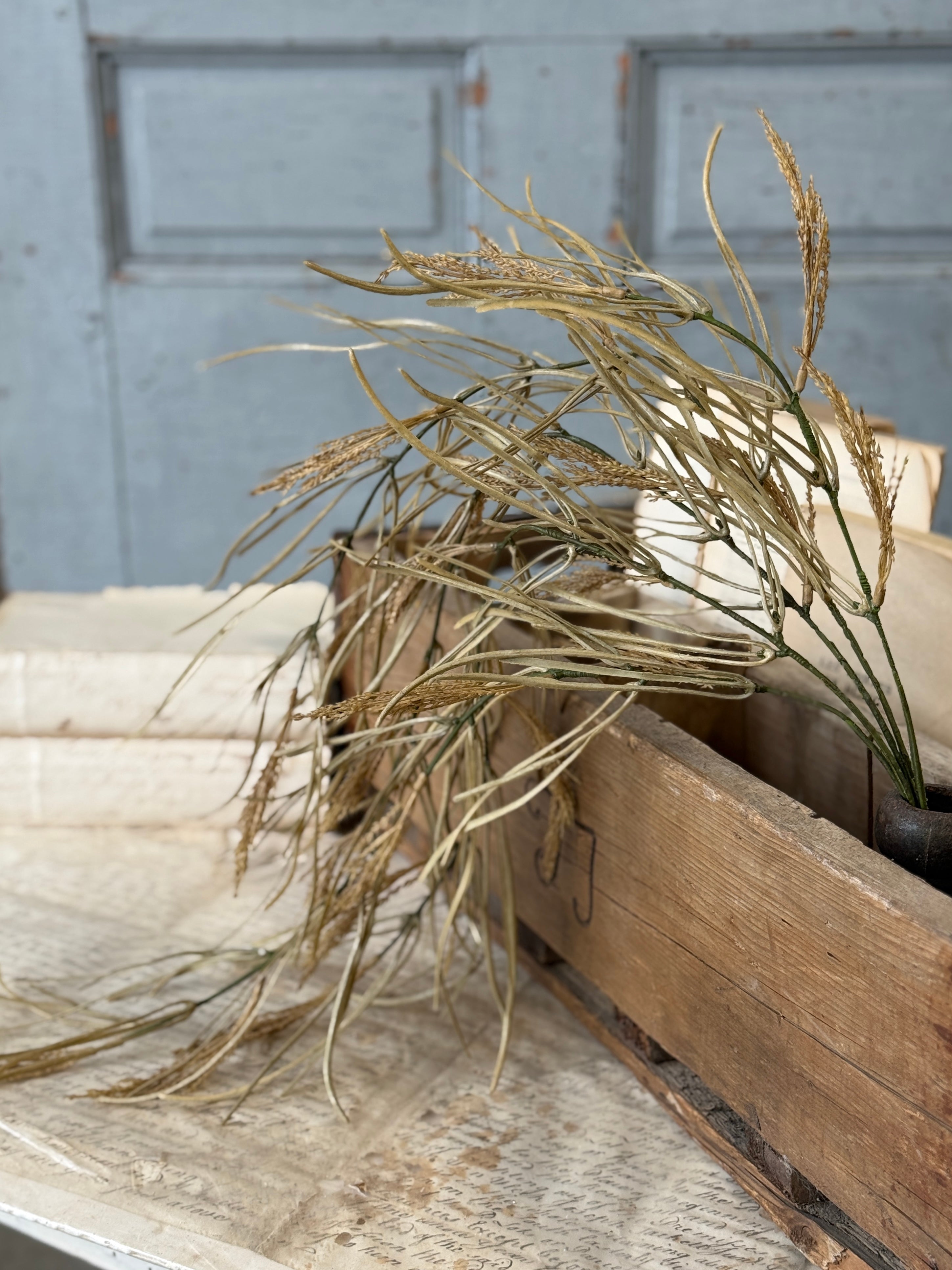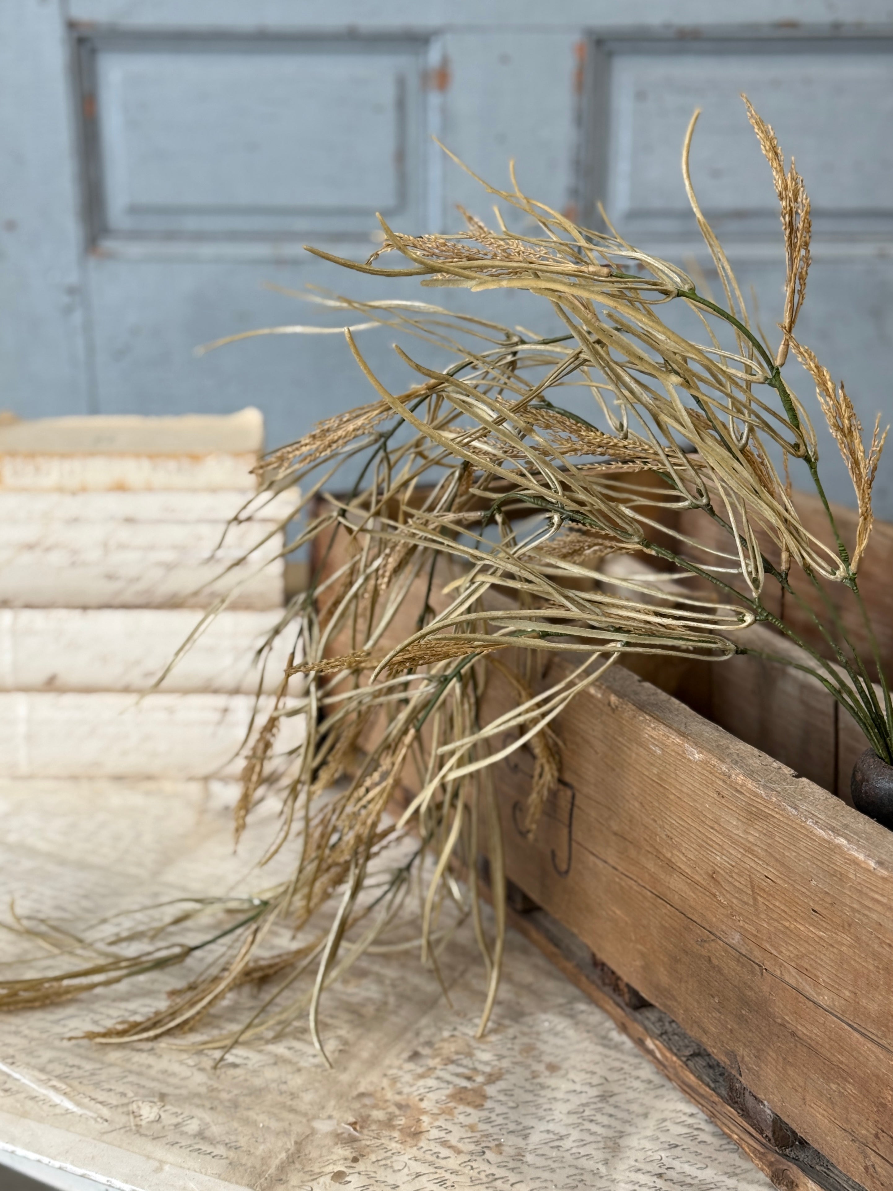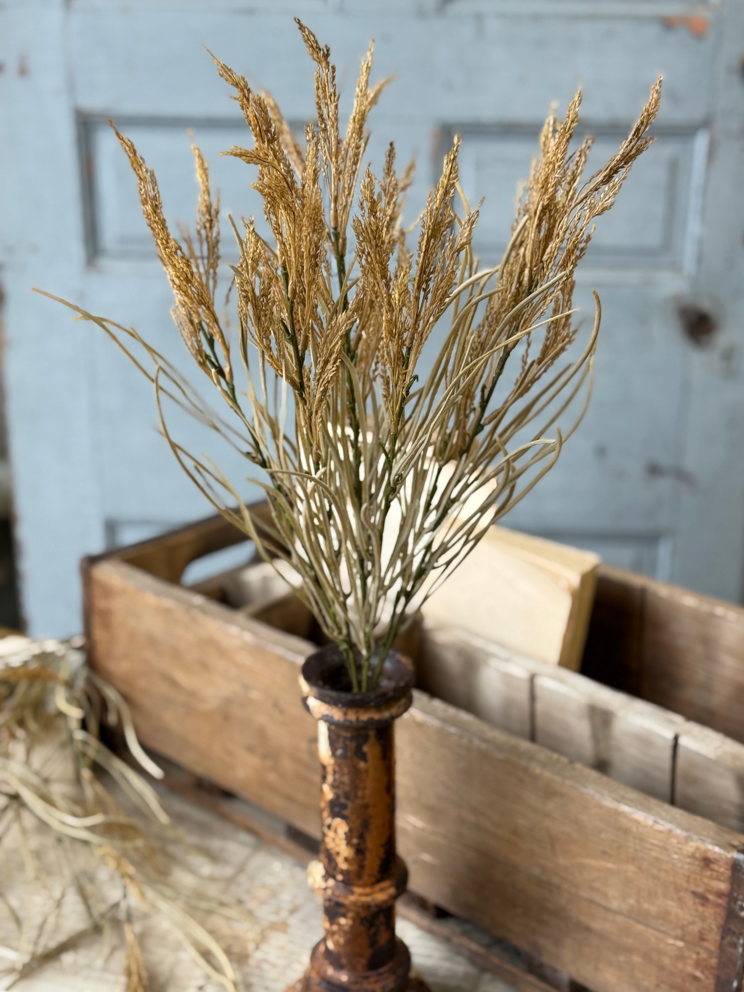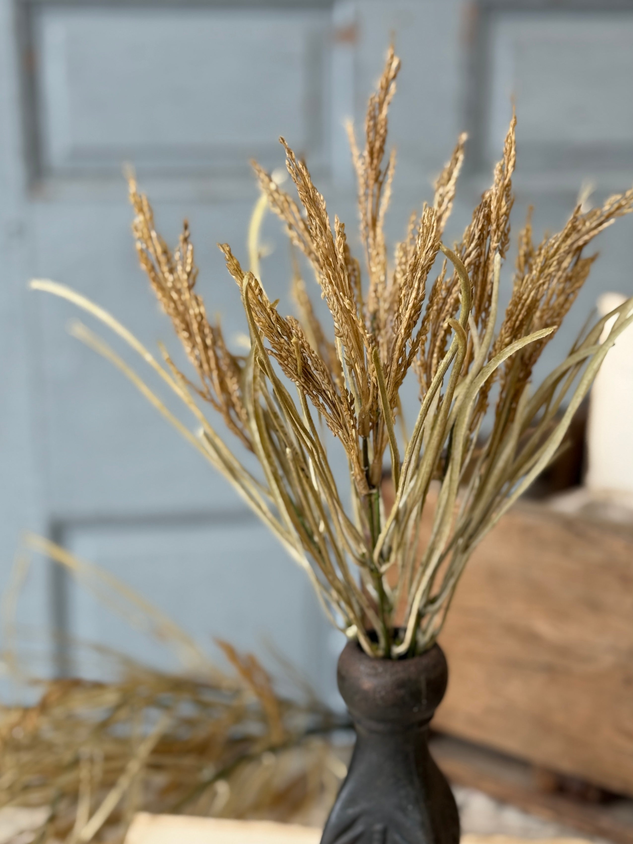 The Wheaten Waves collection delivers a seasonal punch of texture to all of your displays! Pretty wheat-like shoots top stalks accented with tendrils of pretty foliage.