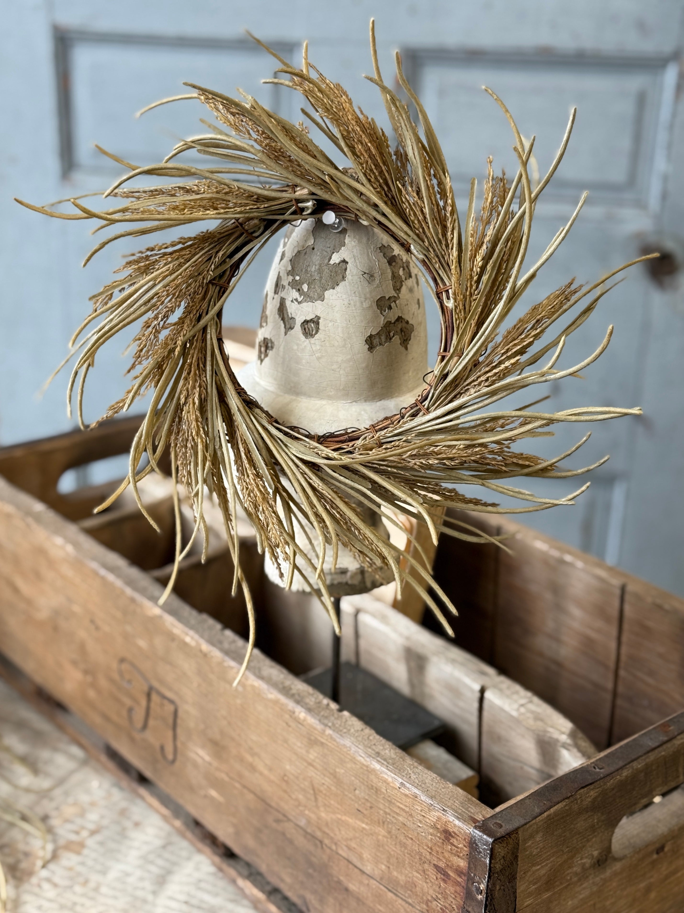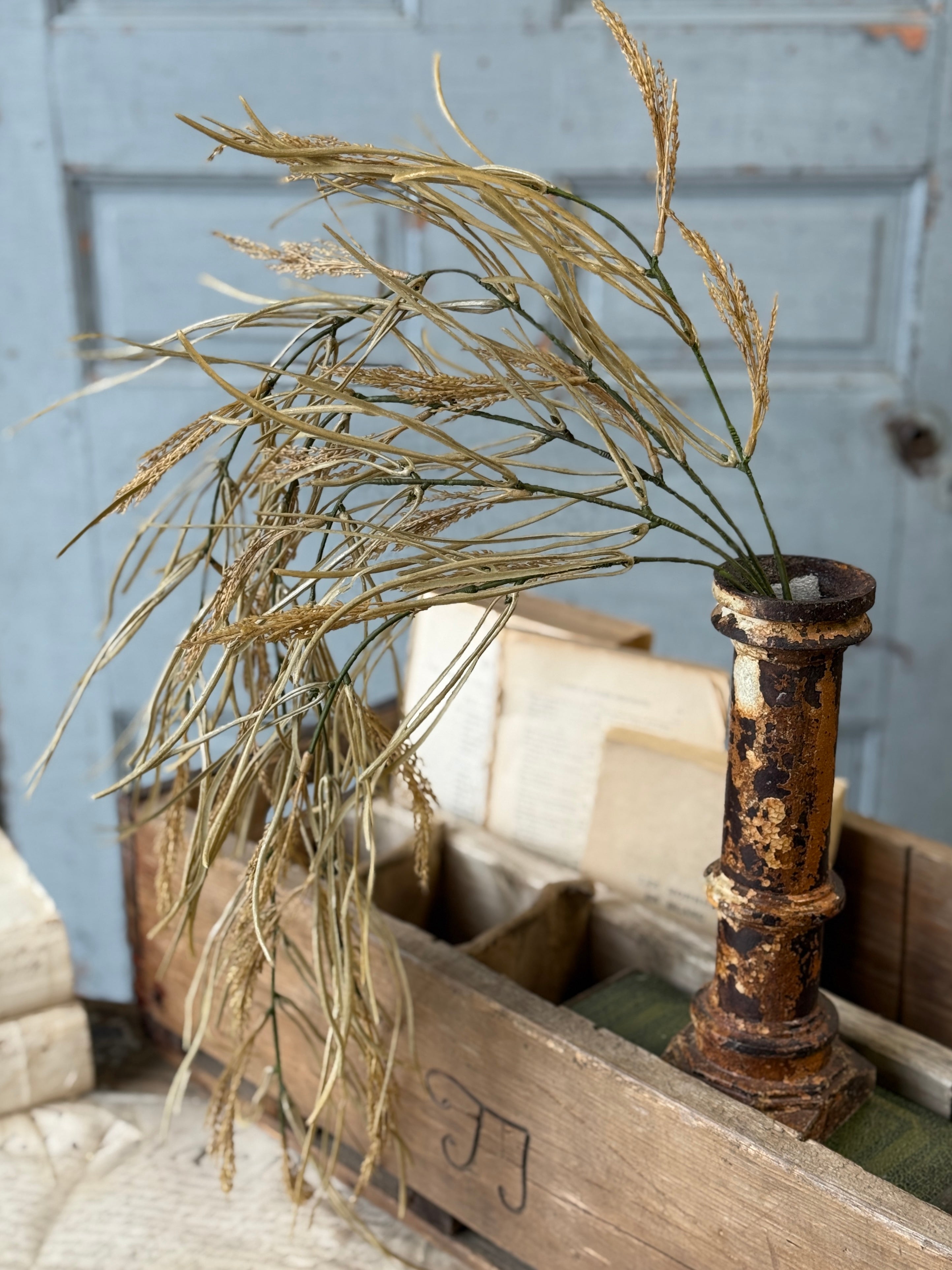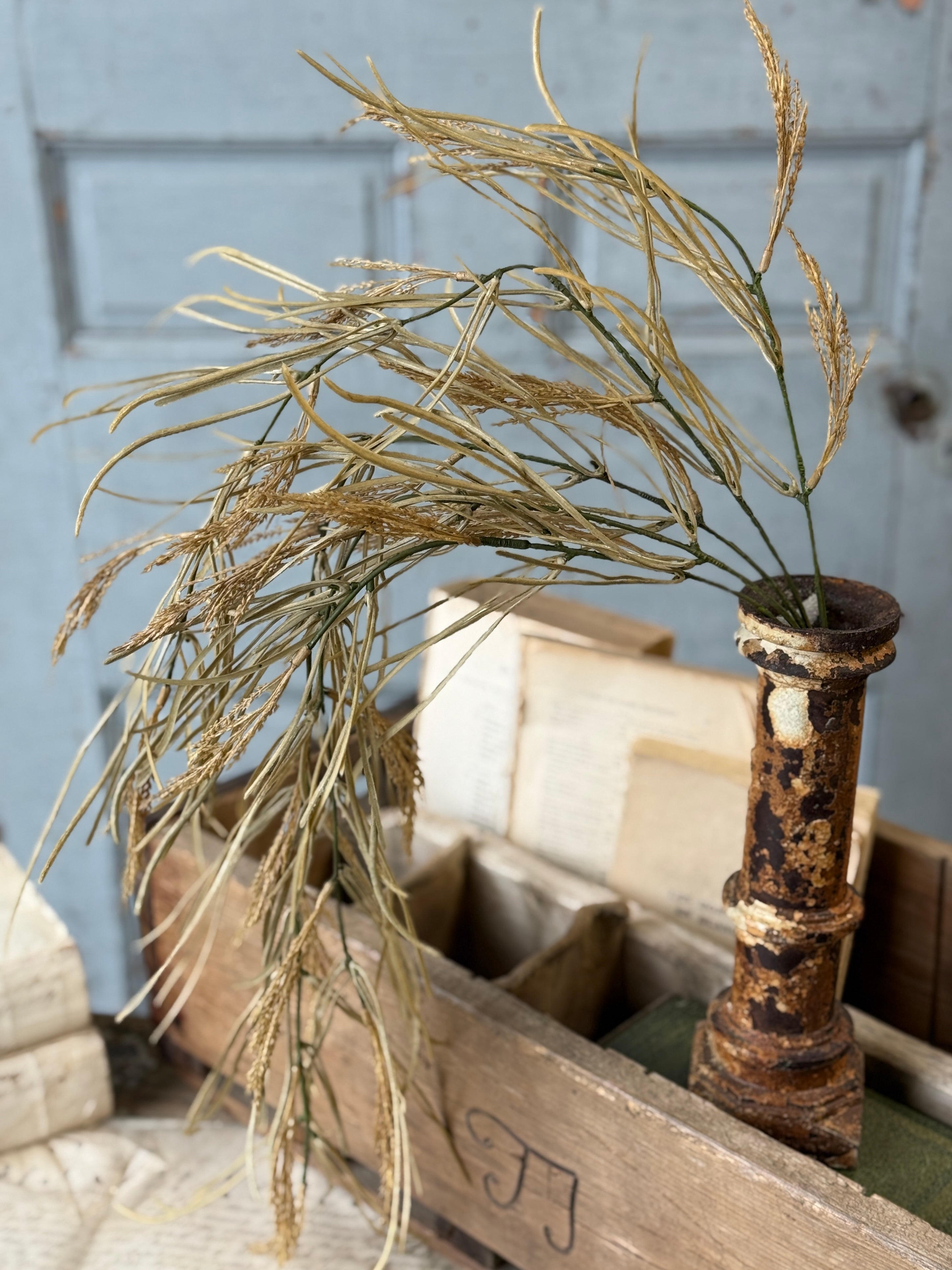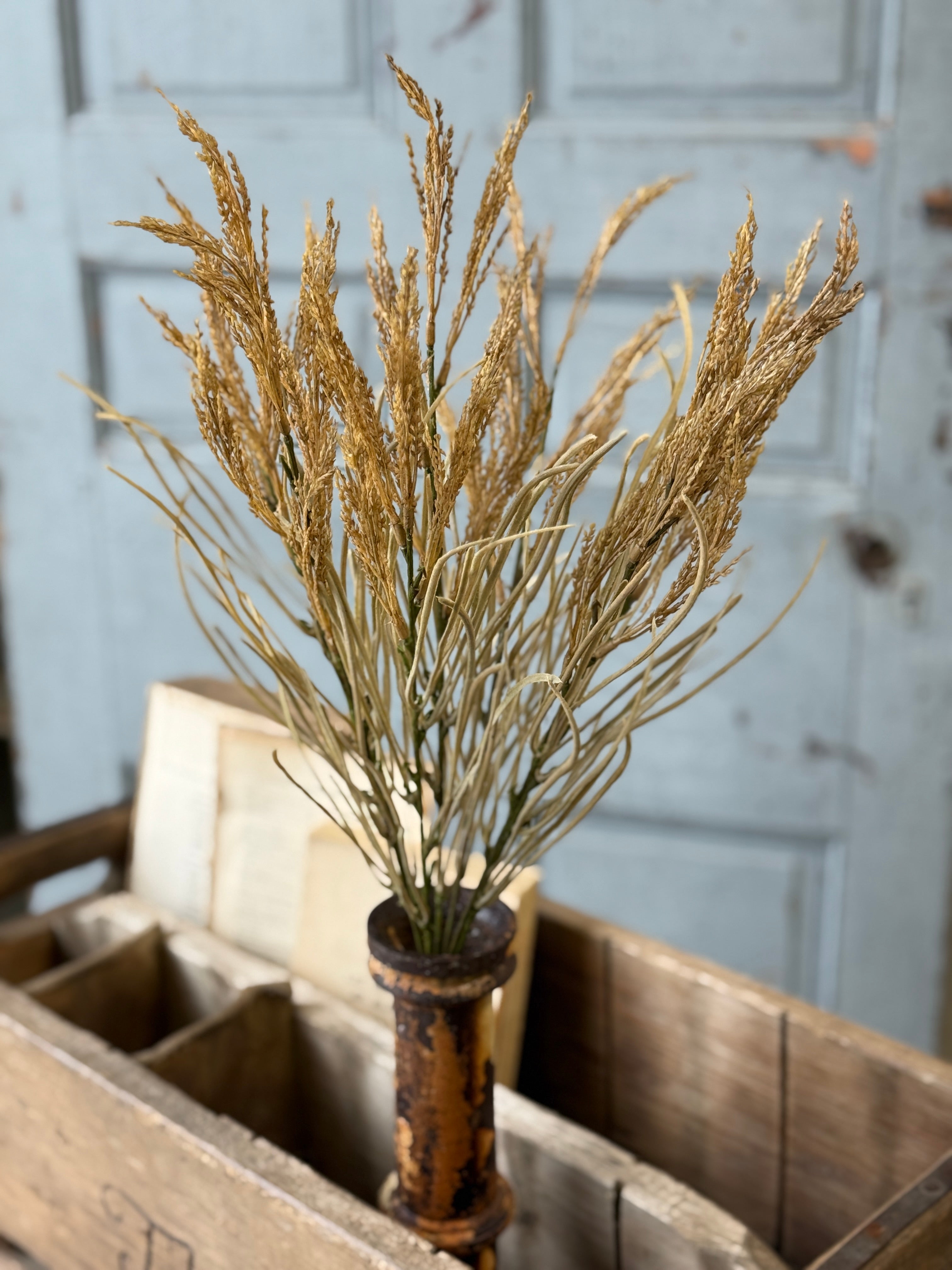 The Wheaten Waves collection delivers a seasonal punch of texture to all of your displays! Pretty wheat-like shoots top stalks accented with tendrils of pretty foliage.