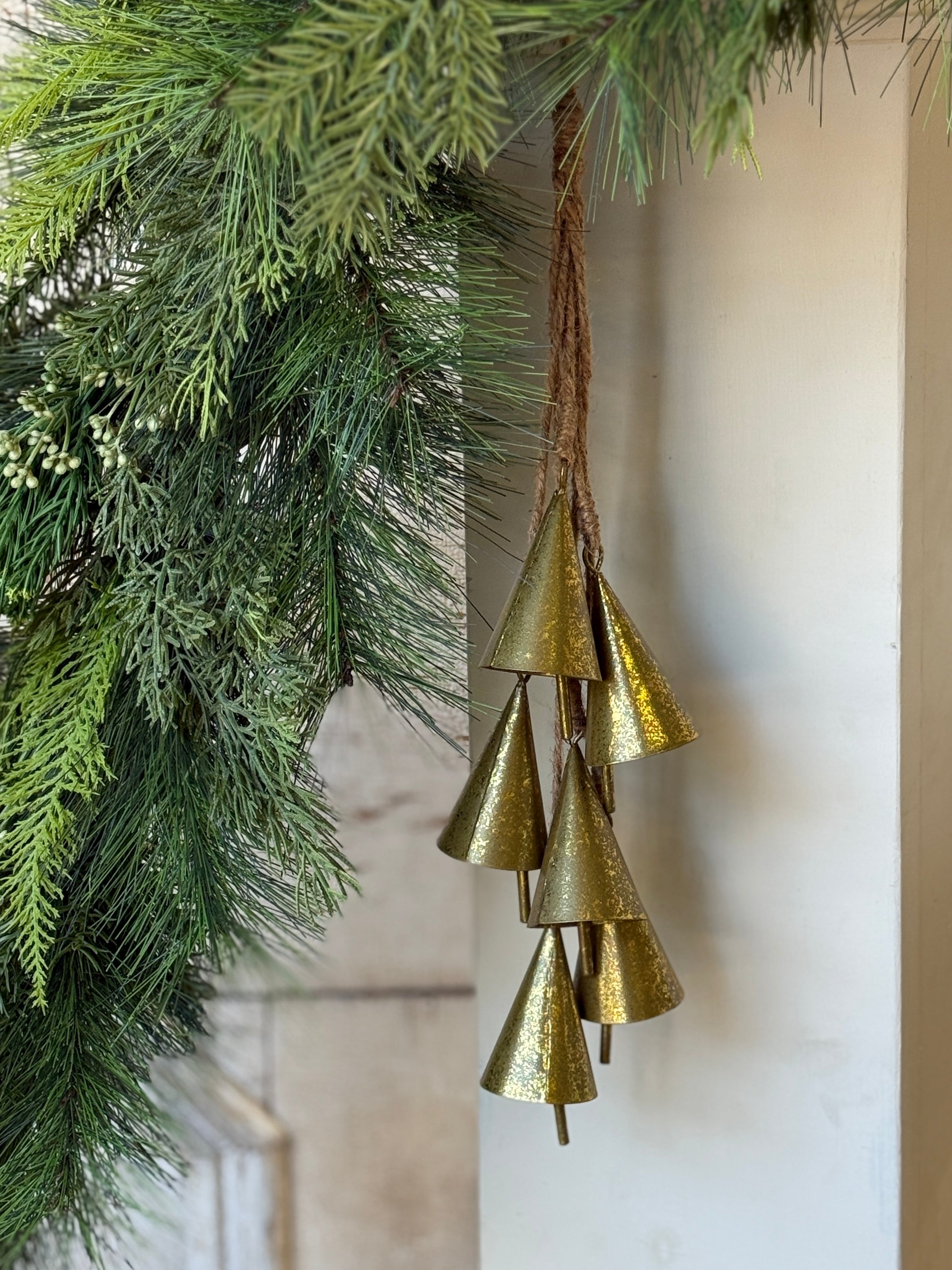 Brass toned bells with a beautiful hammered finish ring in the season and are accented with mixed greenery, pine cones and a dash of glitter.