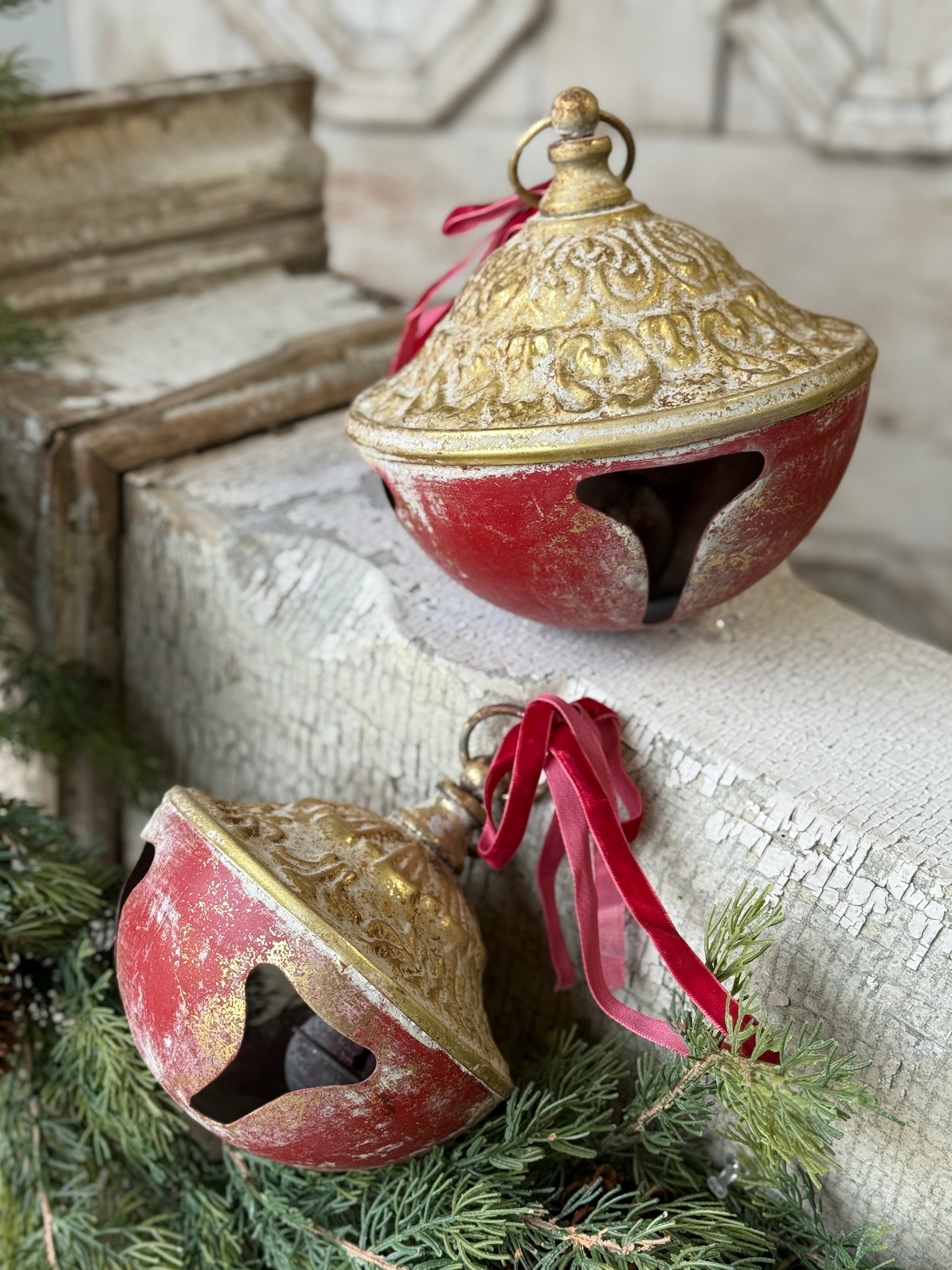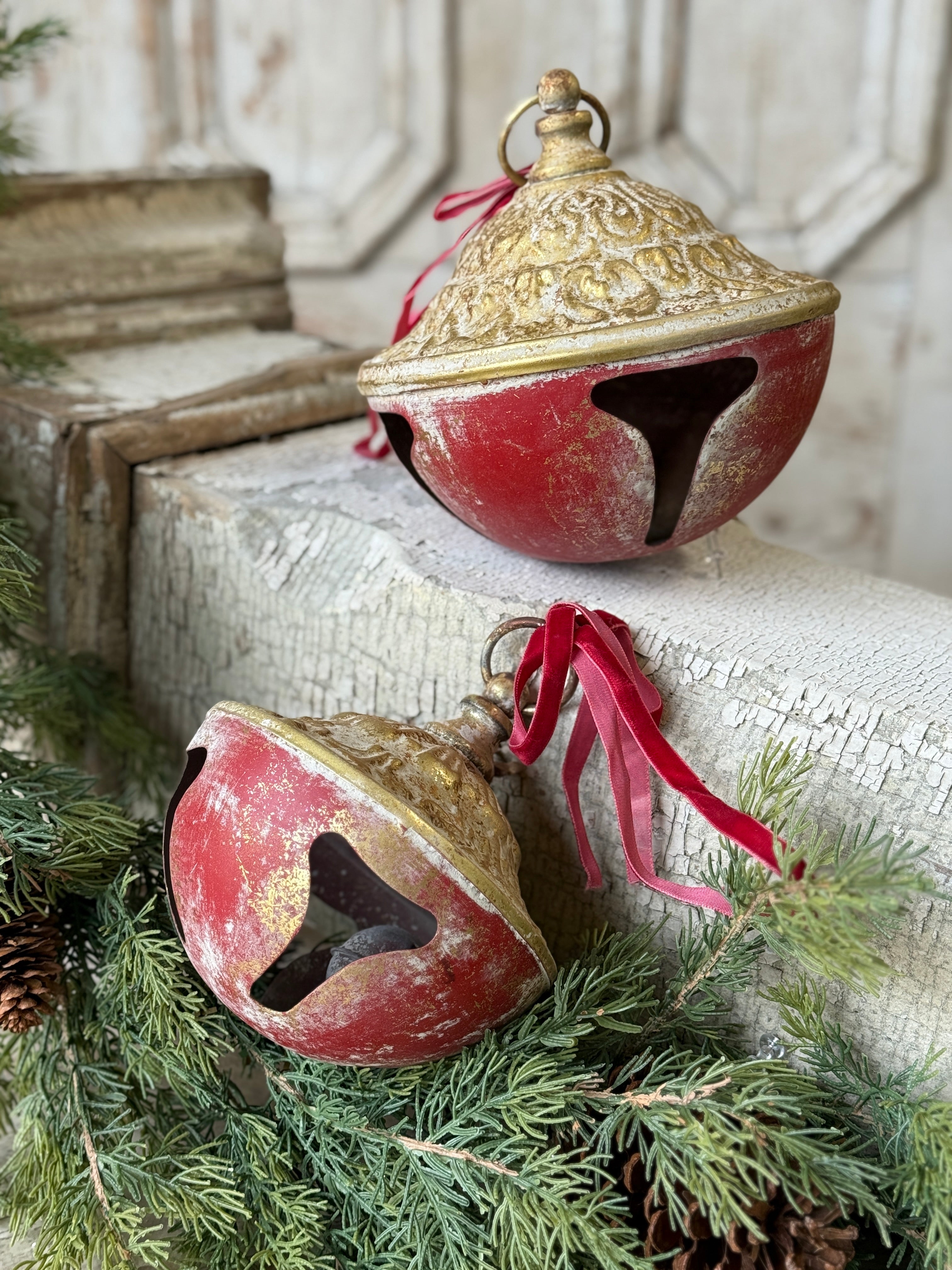 Shiny bells with the most alluringly distressed patina make a resounding statement anywhere they are displayed. Features three different sizes of bells: 6", 5.5" & 4.75" height.
