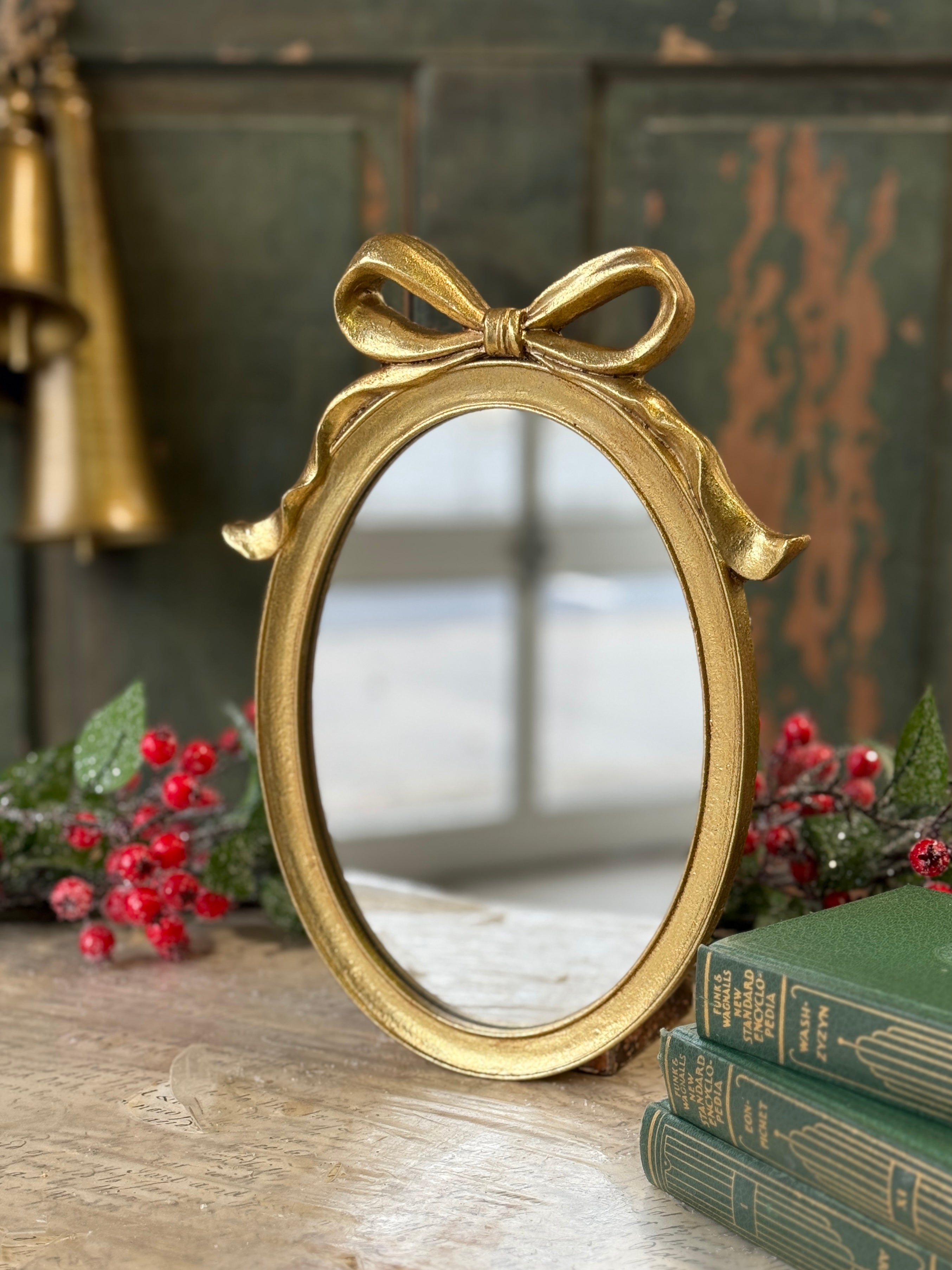 The Charmed Reflection Mirror is just that; may all the things it reflect be as lovely as it is with its gilded finish and swooping bow.