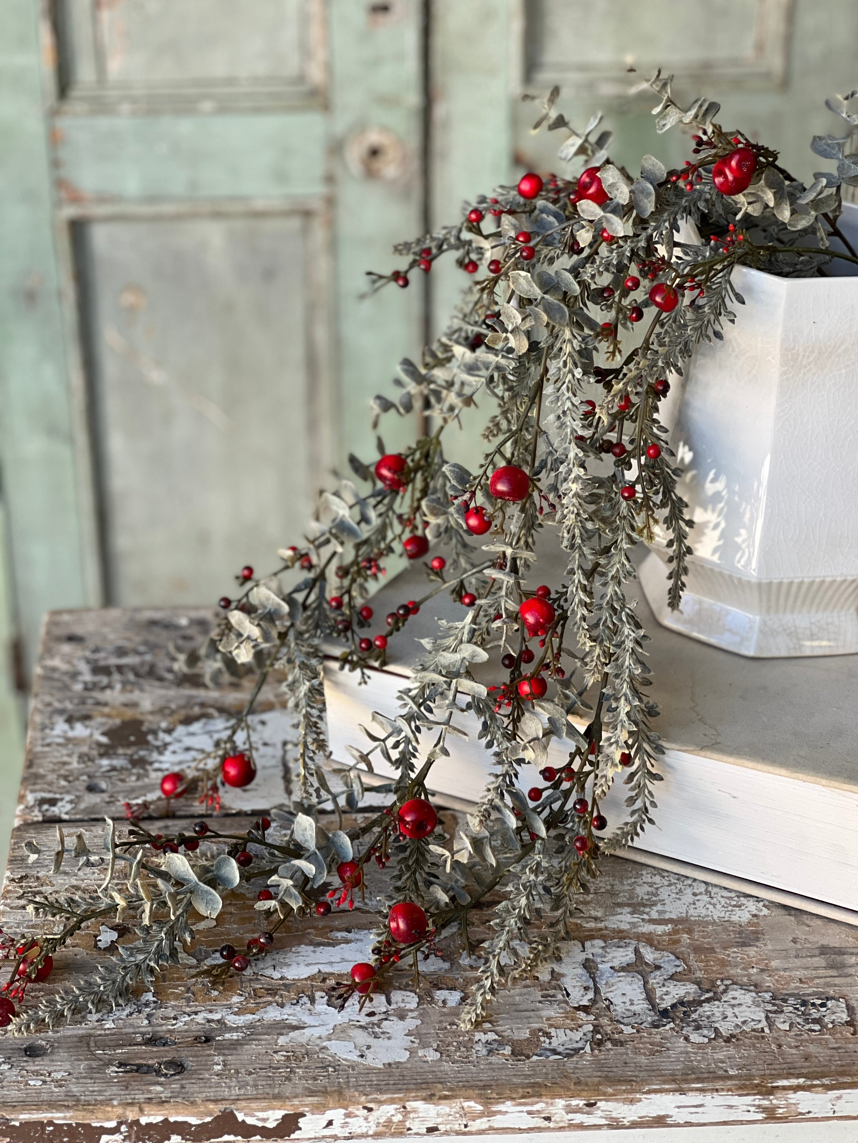 Dusky eucalyptus foliage with showy red berries and a splash of small orbs creates a collection that is as charming as it is versatile.