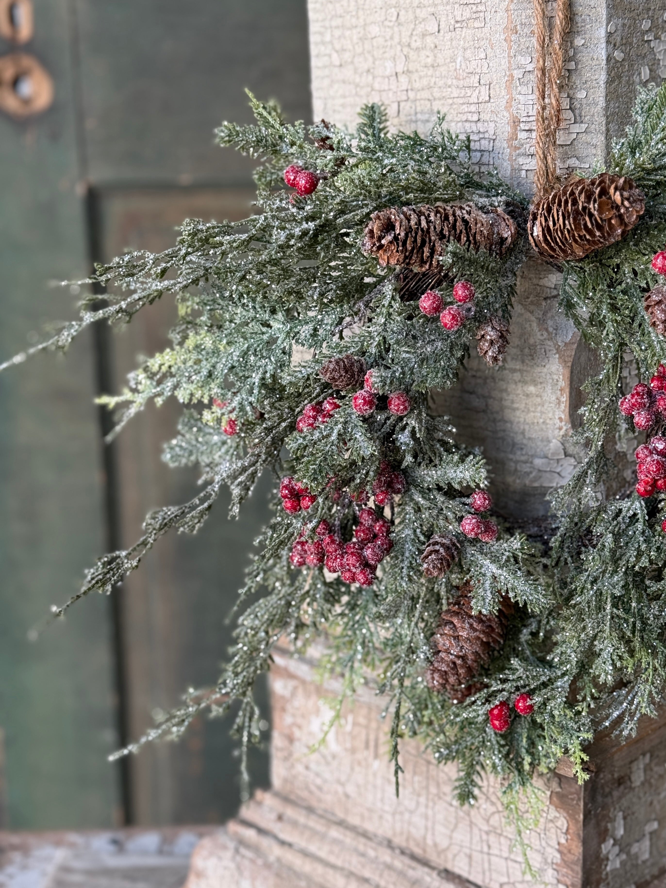 A stunning collection that is sure to become a long running favorite, the Divinity Berry Cedar is one that draws attention. With its glittering mixed greenery dashed with snow, berry clusters and peppered with pine cones, this collection has it all!