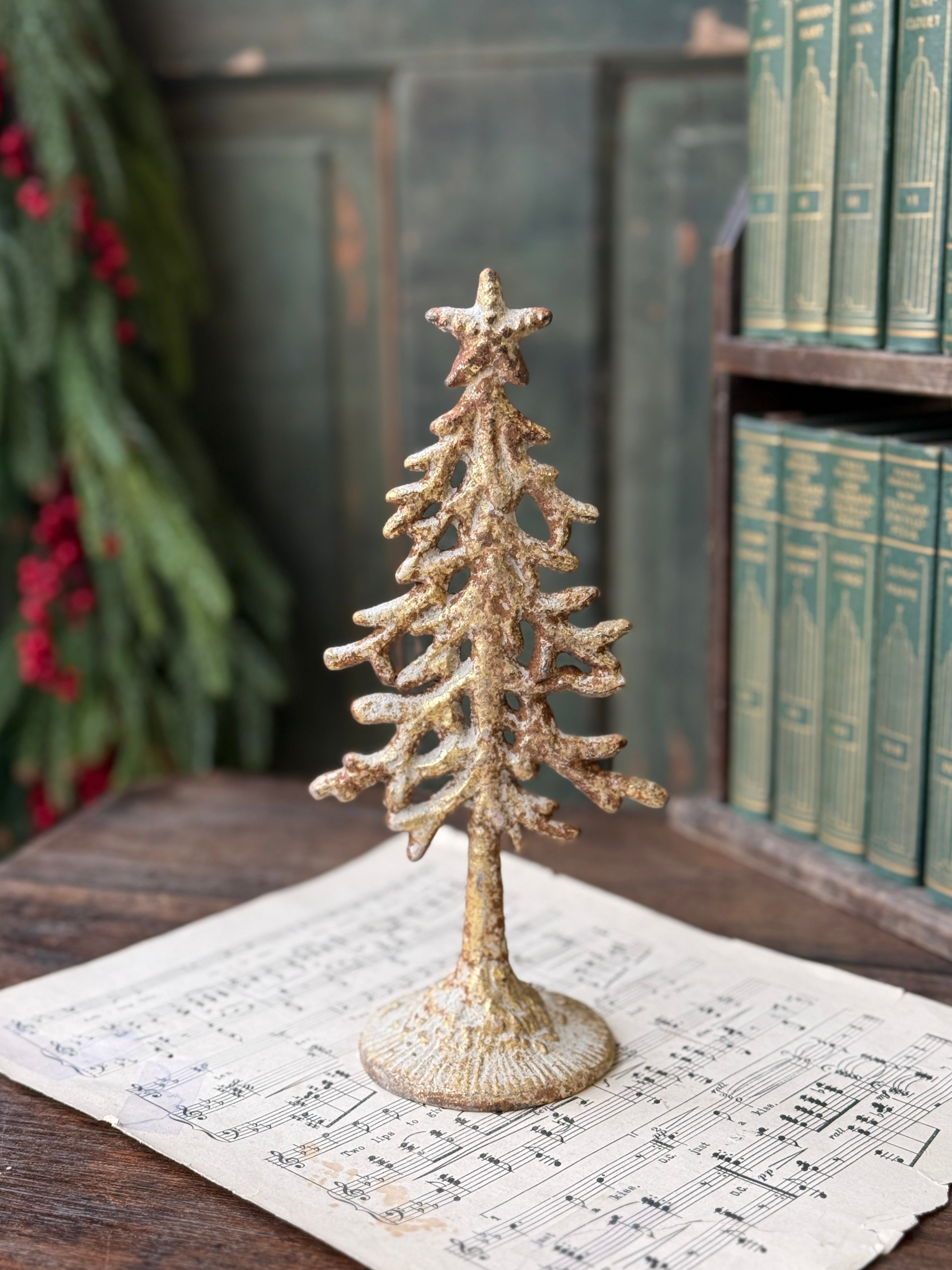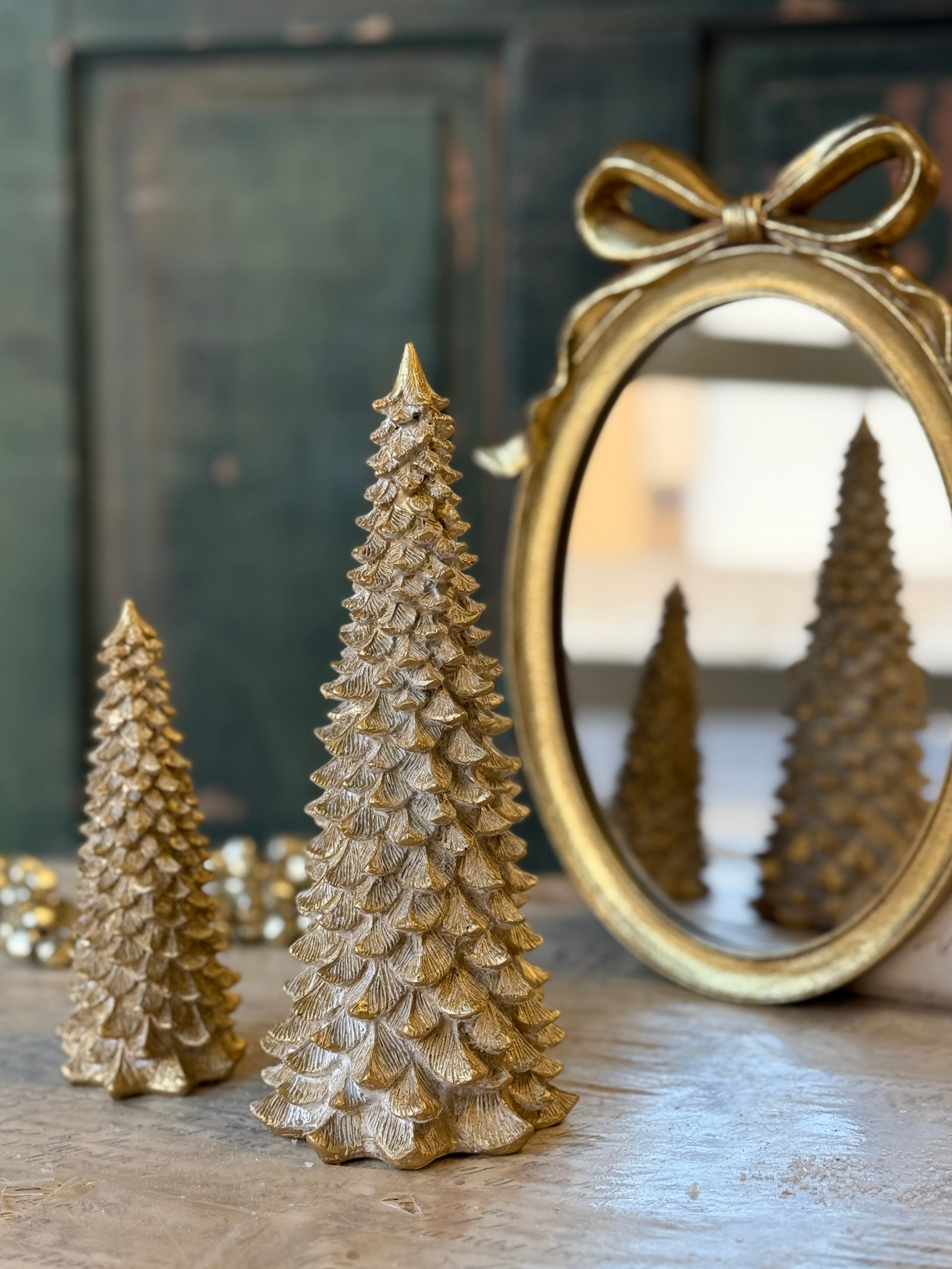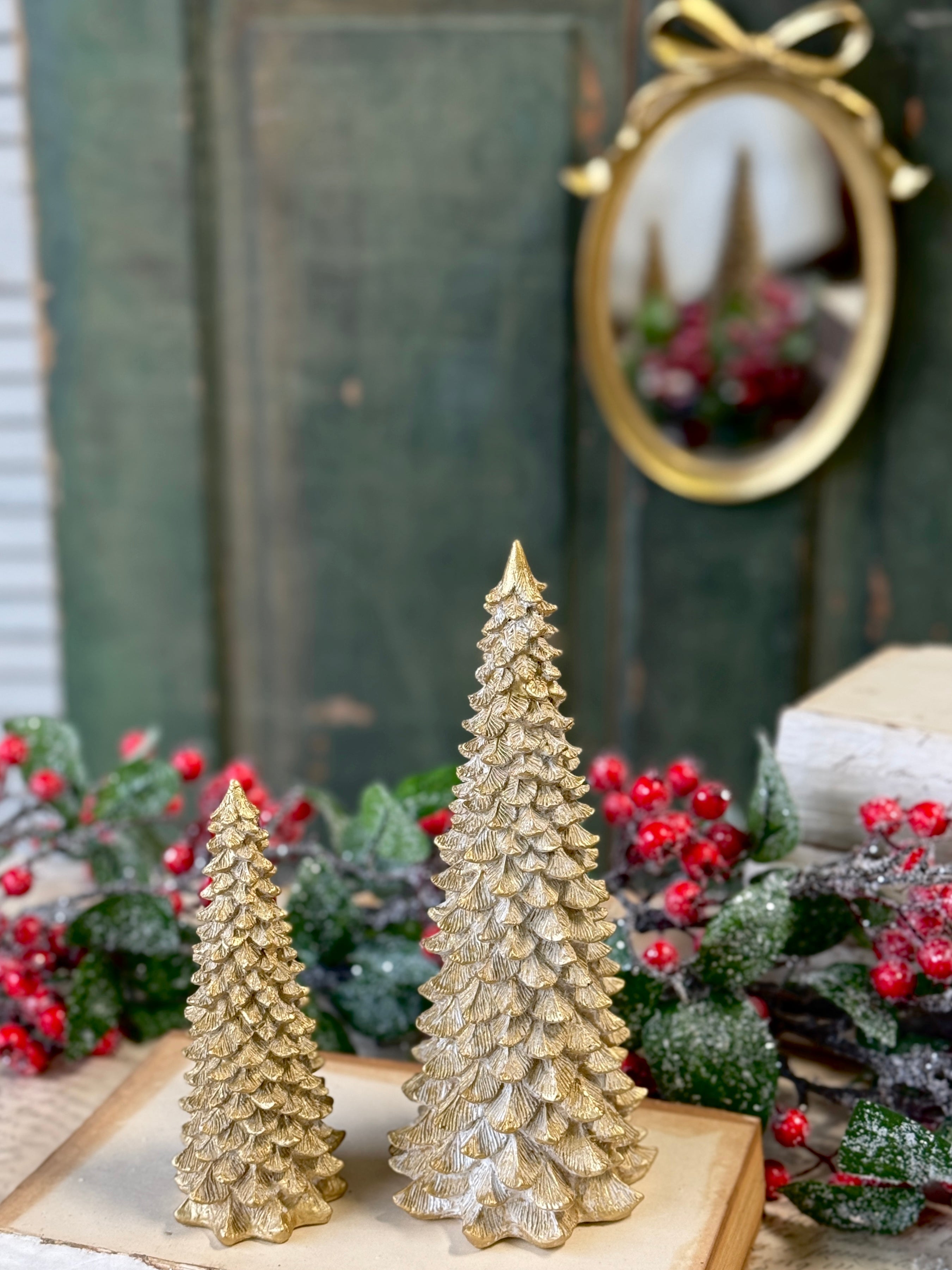 The Gilded Tidings Trees are perfectly imperfect with their unique silhouette topped with a distressed finish that allows their gilded undertone to show through. Their stature allows them to grace most any shelf or space and their finishing makes them infinitely versatile. Available in two sizes, each sold separately.