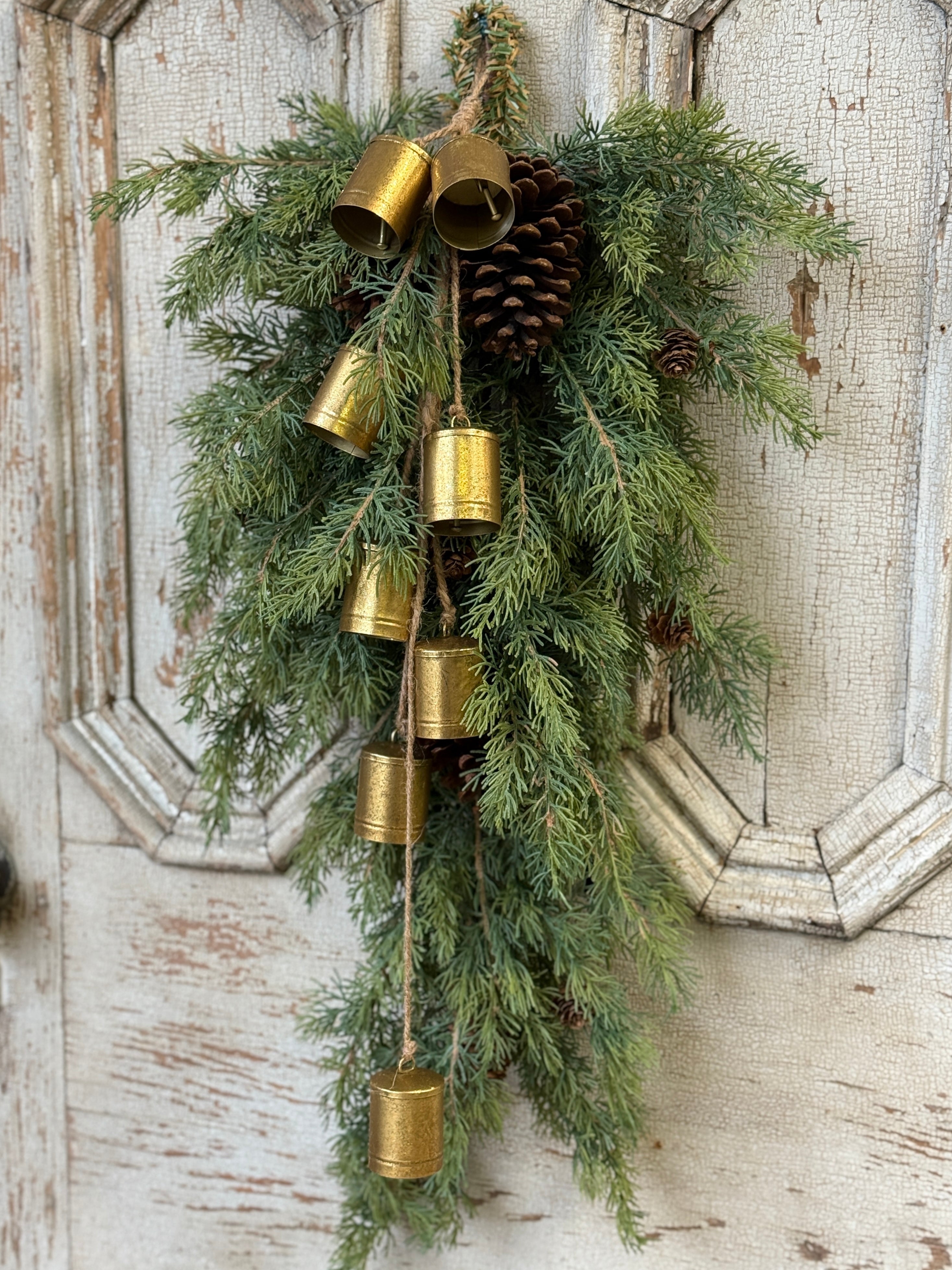 A sparkling eucalyptus collection with sprigs of cedar, small pine cones, and beautiful gold bells with a distressed finish (see detail shot).