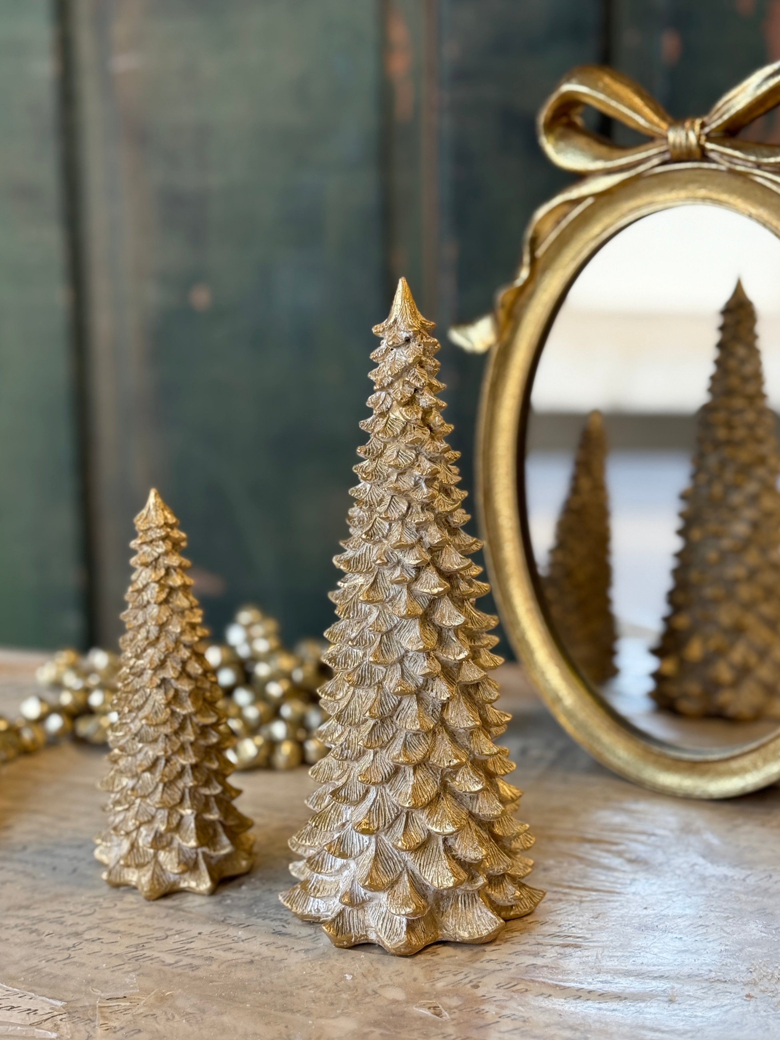 The Gilded Firs bring a regal note to vignettes with their stylized boughs and beautiful texture. Available in three sizes, each sold separately.