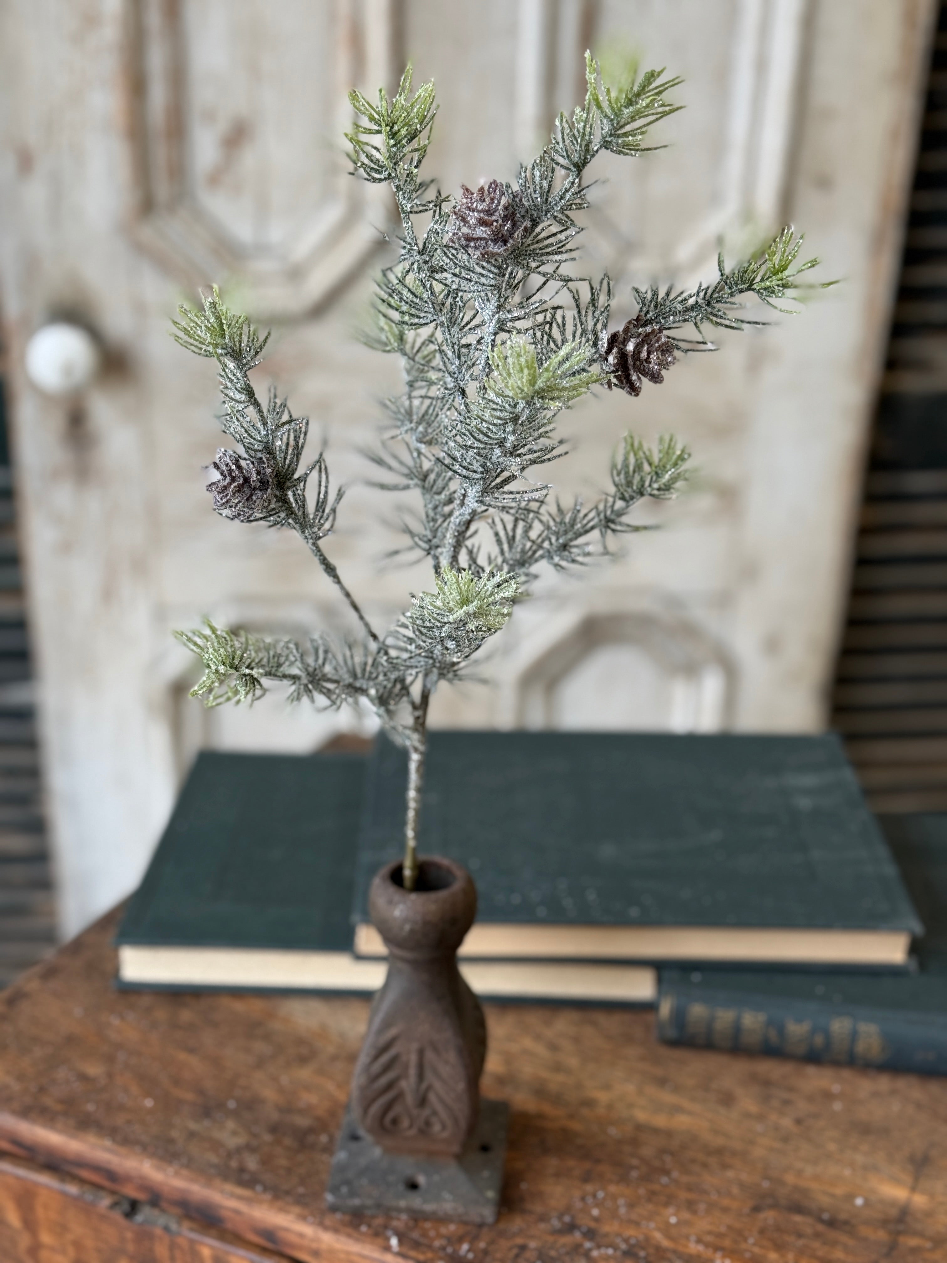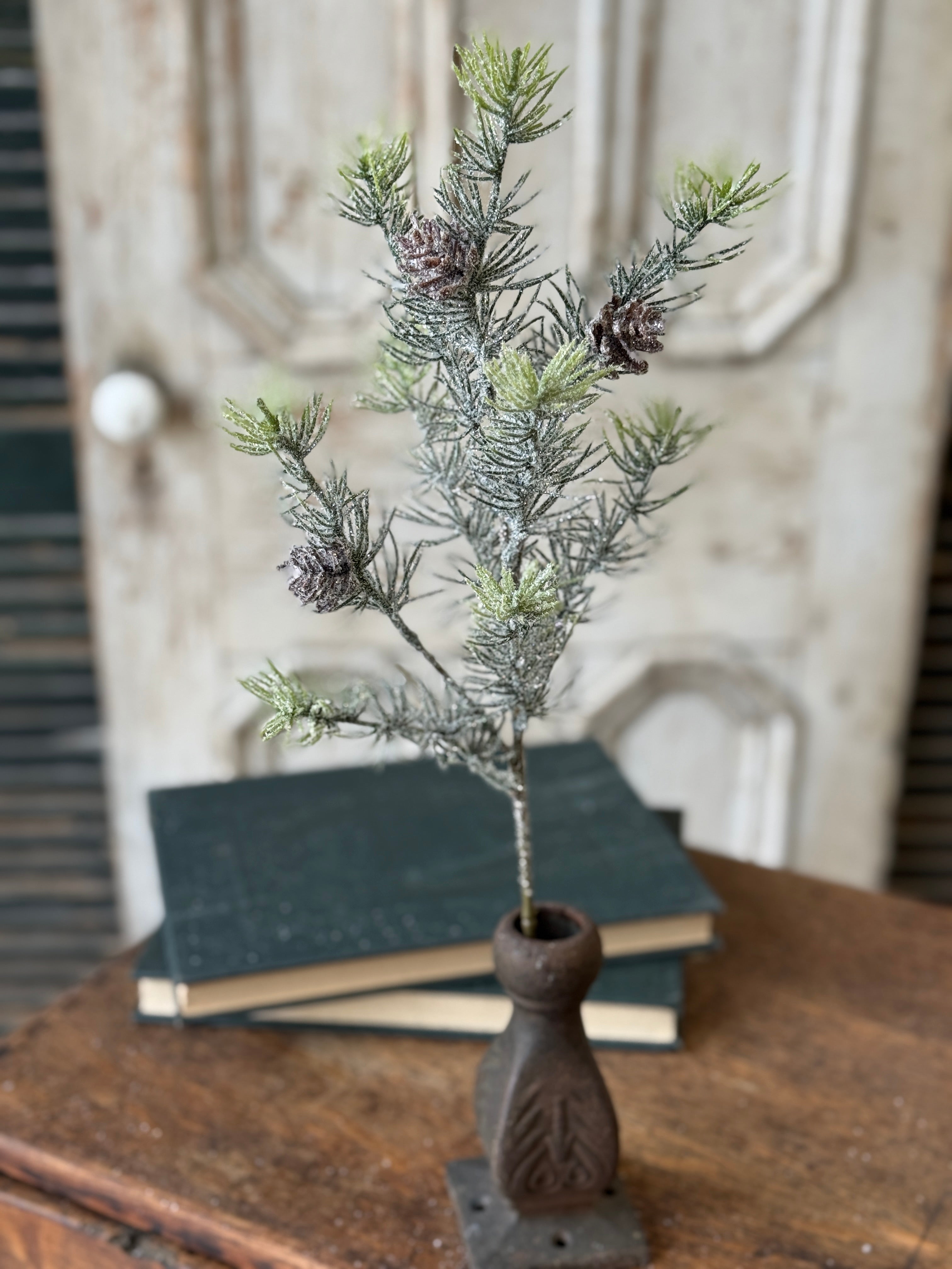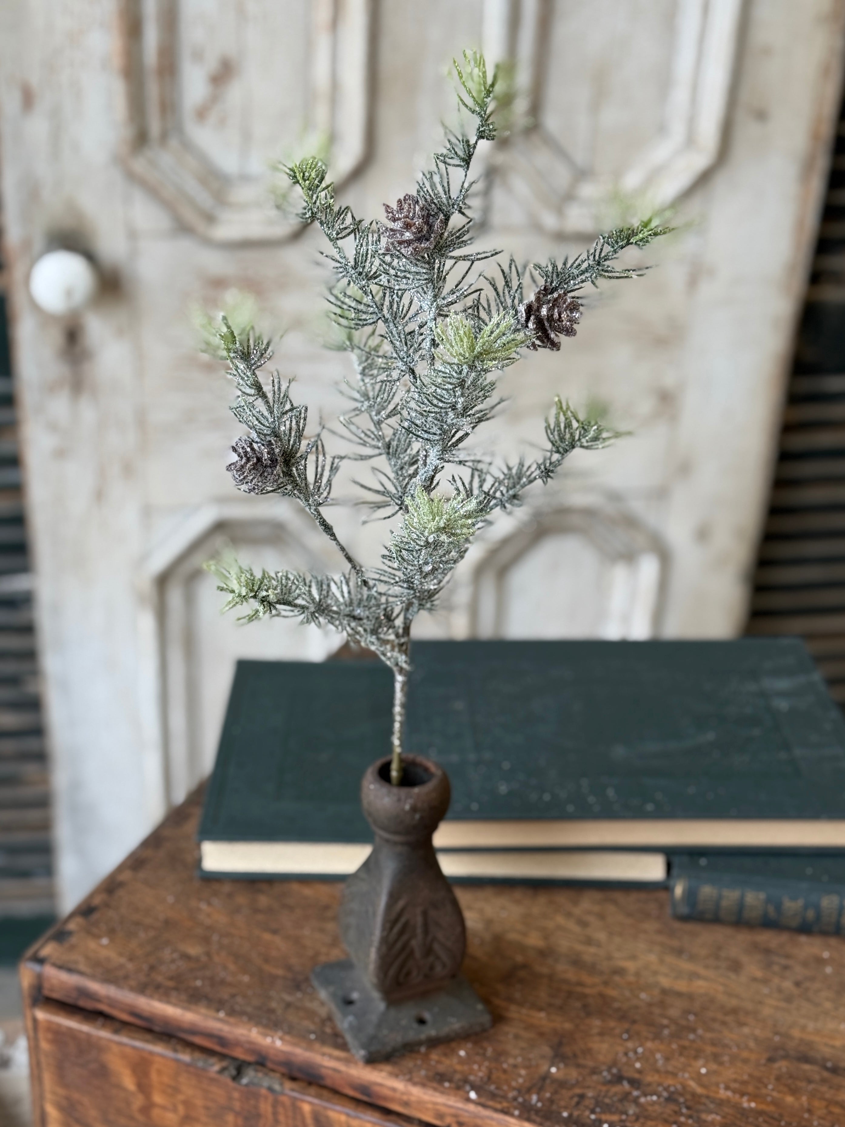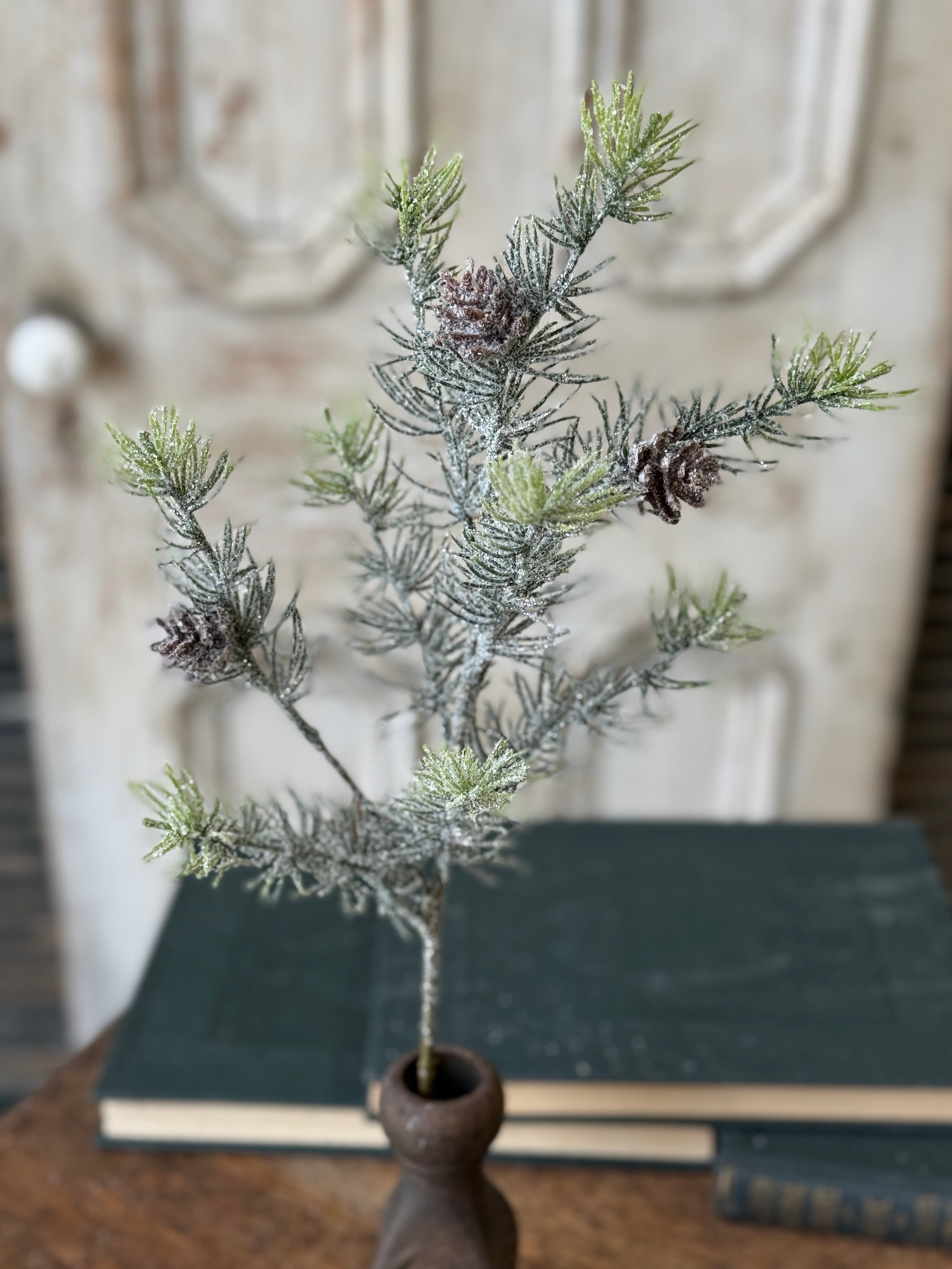 A wintery collection of spruce peppered with small granules of snow and dashed with petite pine cones.