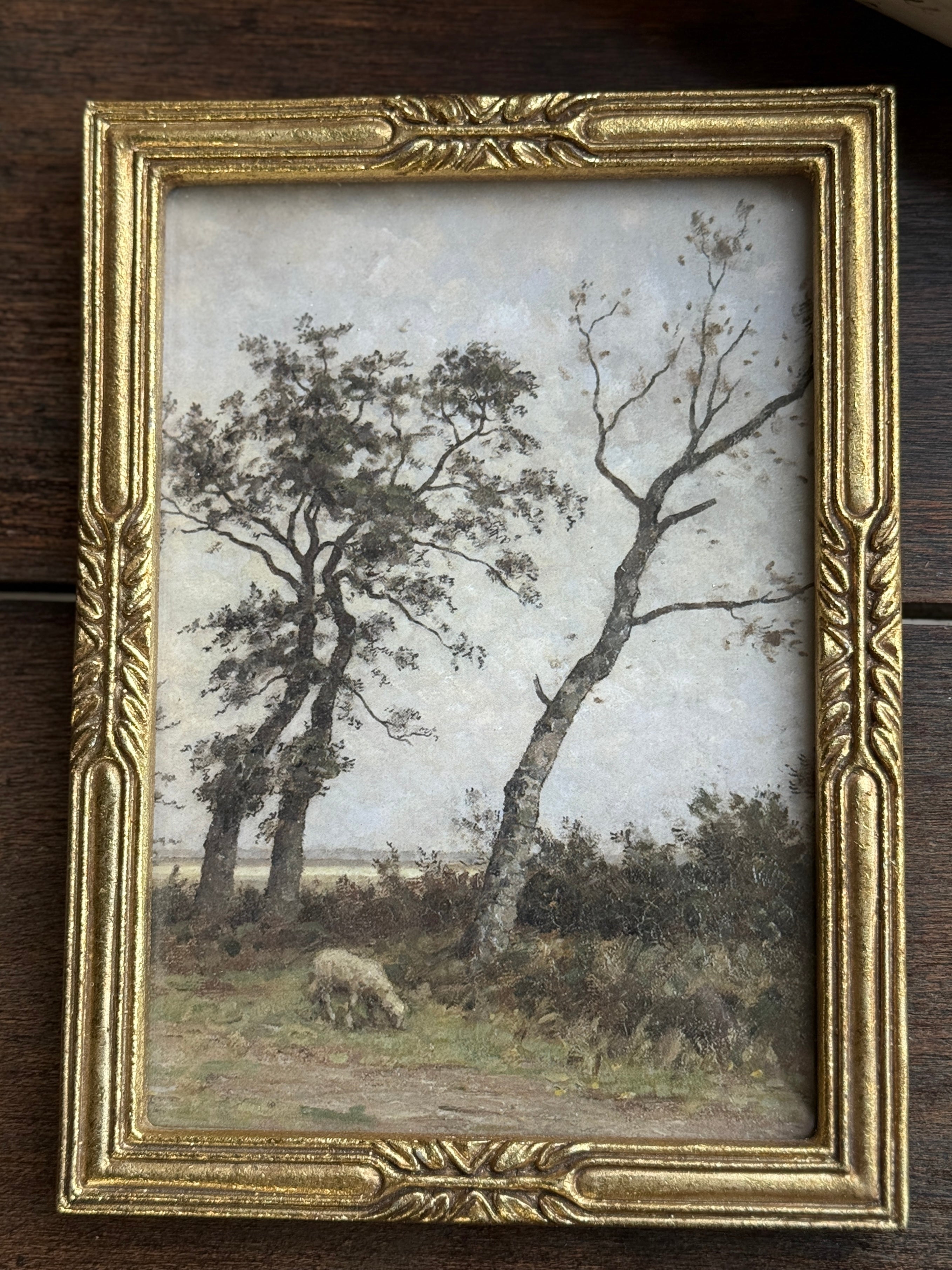 Add a wonderful artistic touch to displays and vignettes with this bucolic scene in a charming gold toned frame with lovely detailed accents.
