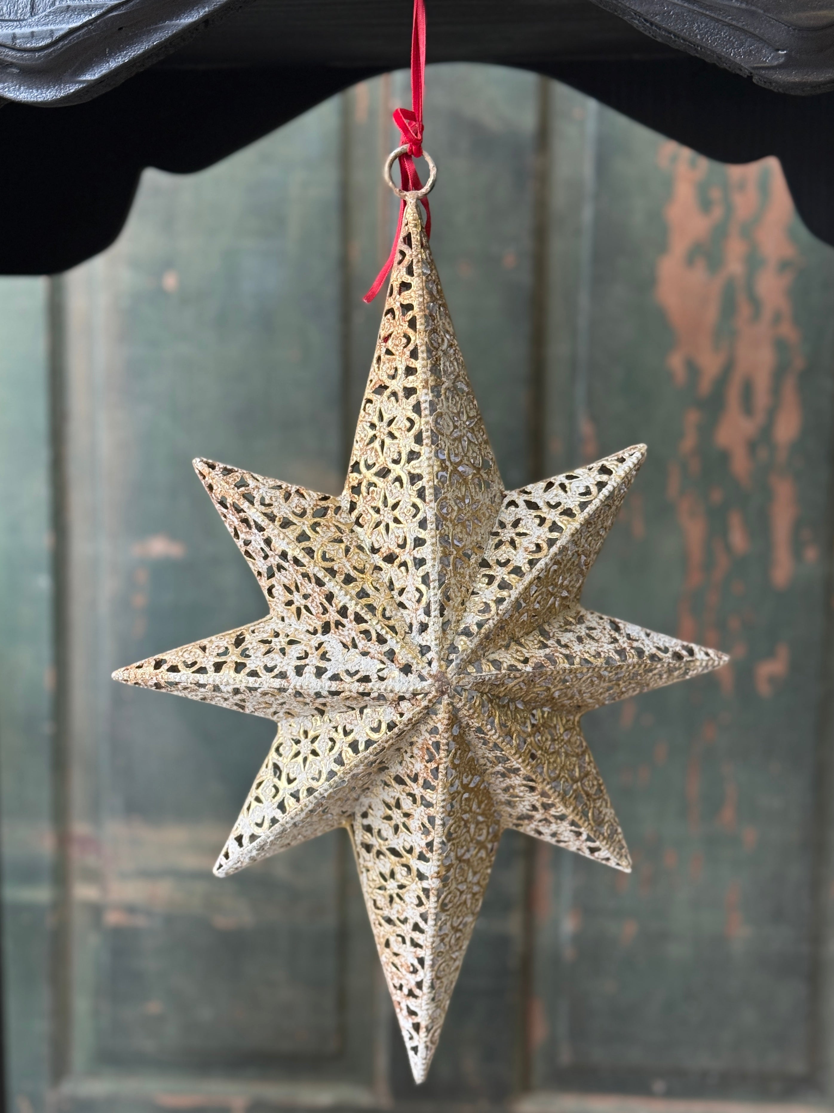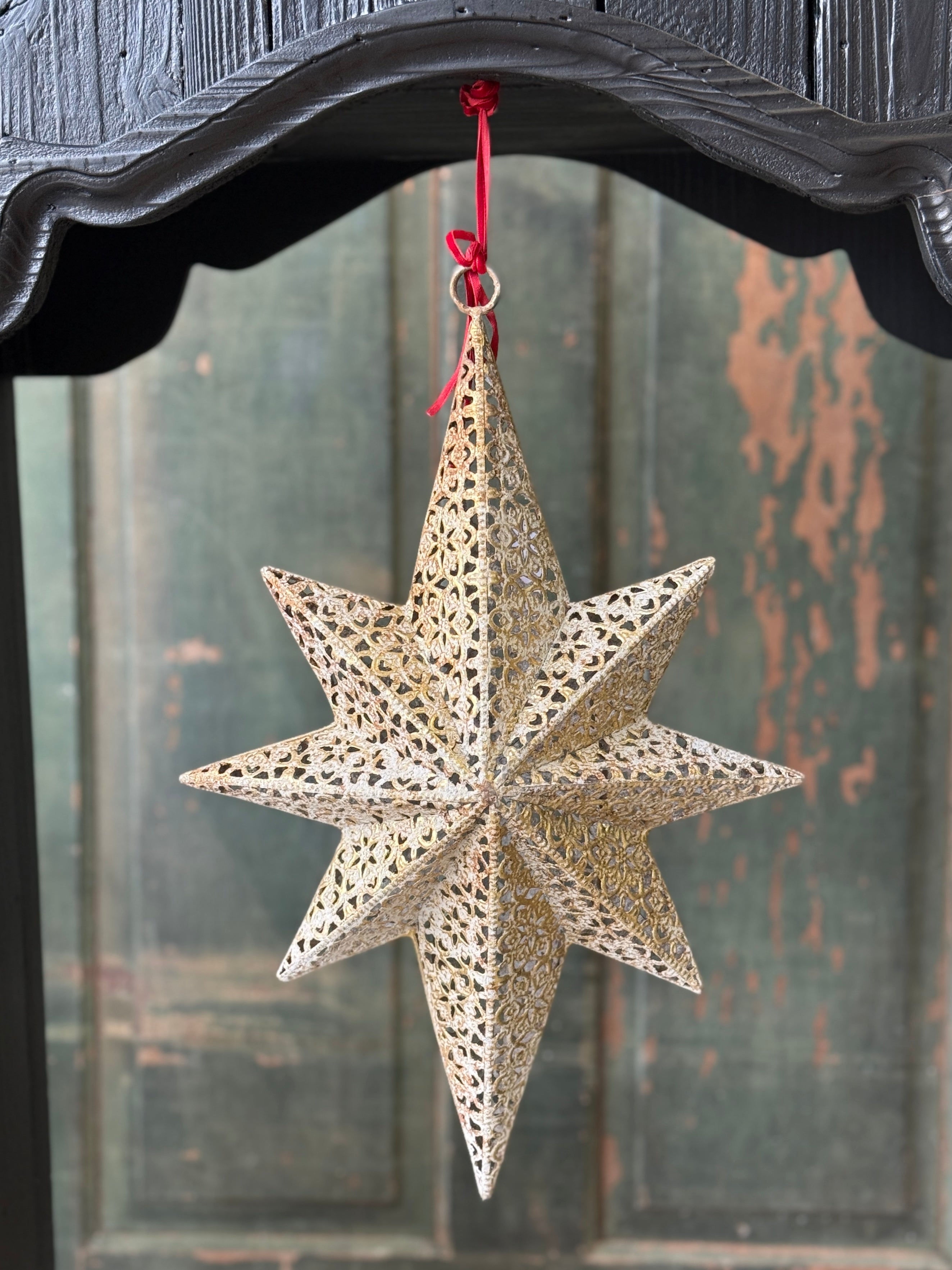 The Wishmaker Stars add an elegant touch with their distressed gilded finish and pretty intricate filigree texture. A slender velvet bow makes the perfect festive hanger for these striking stars. Available in two sizes, each sold separately.