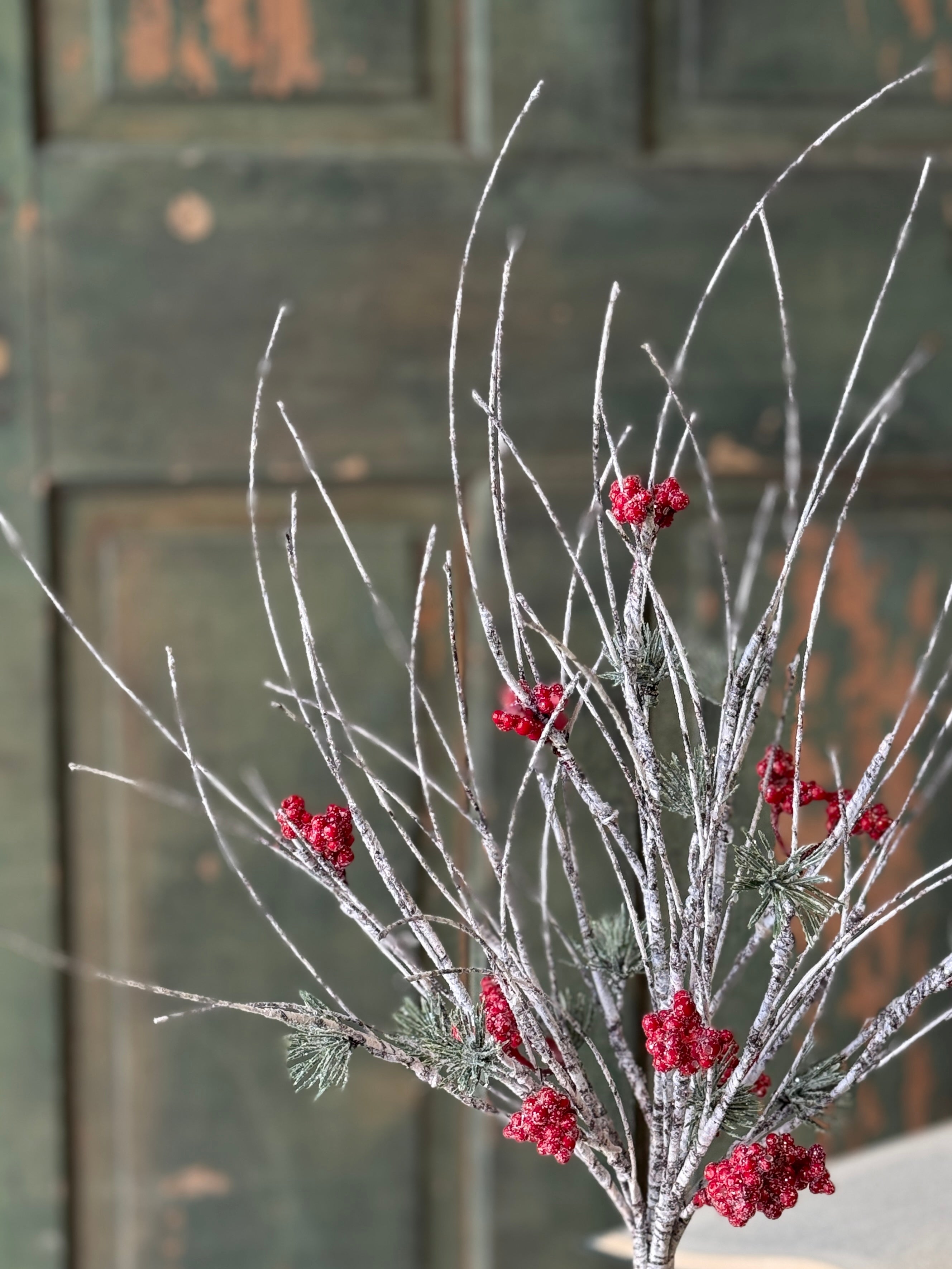 Sprays of faux birch branches are interspersed with sprigs of pine and clusters of bright berries to create a symphony of textures and festive charm. Each bundle contains three stems bound with a raffia tie.
