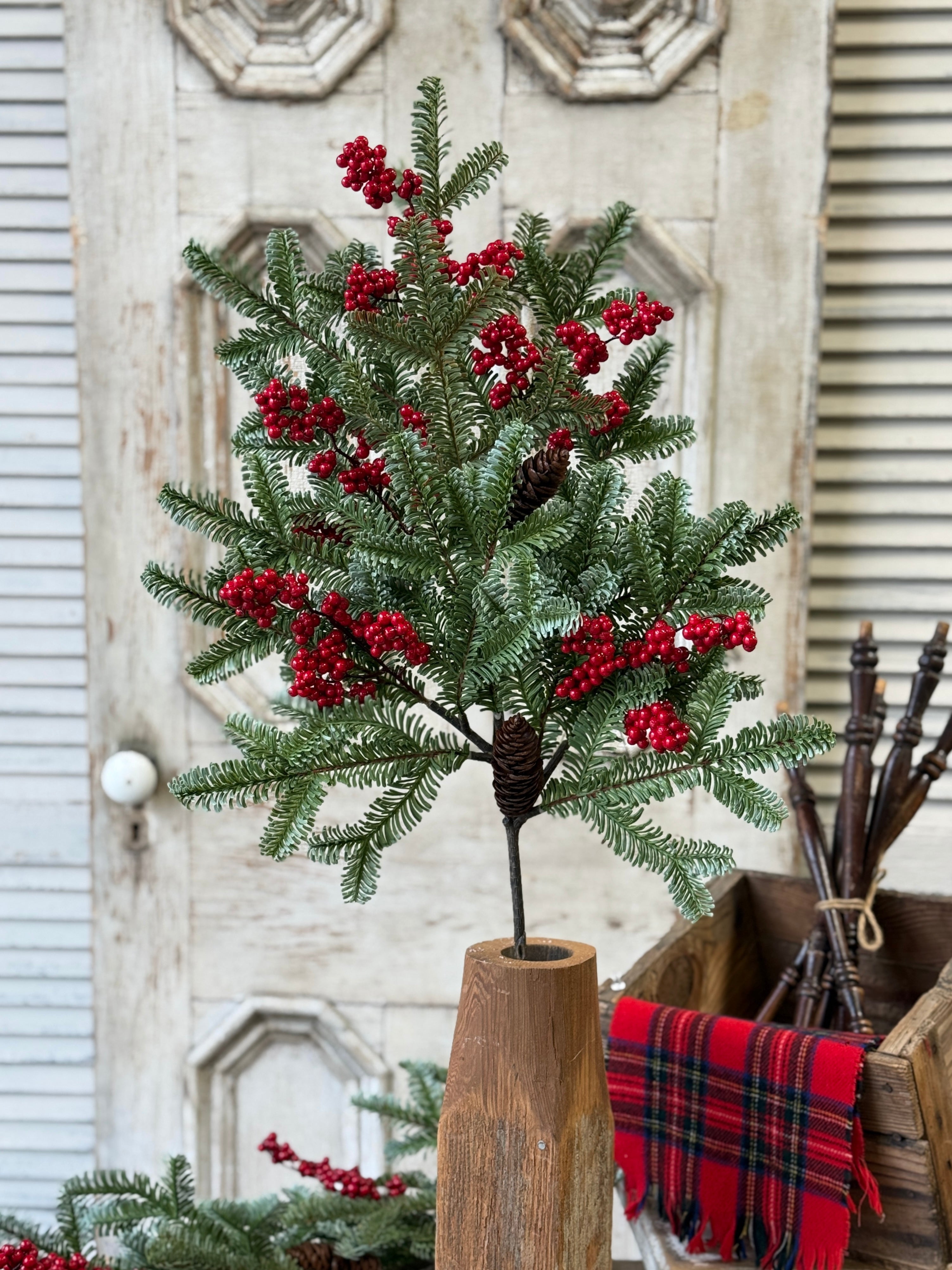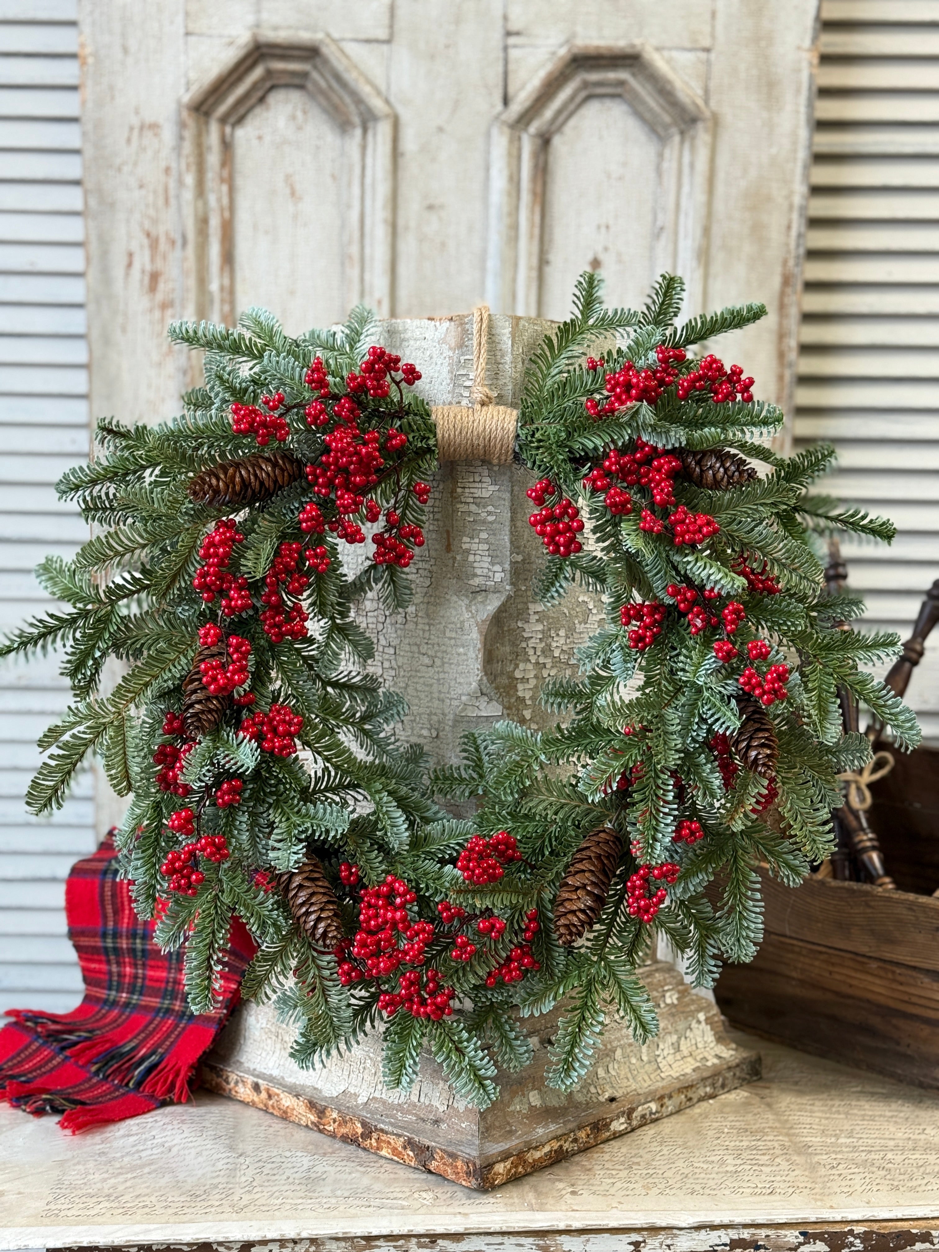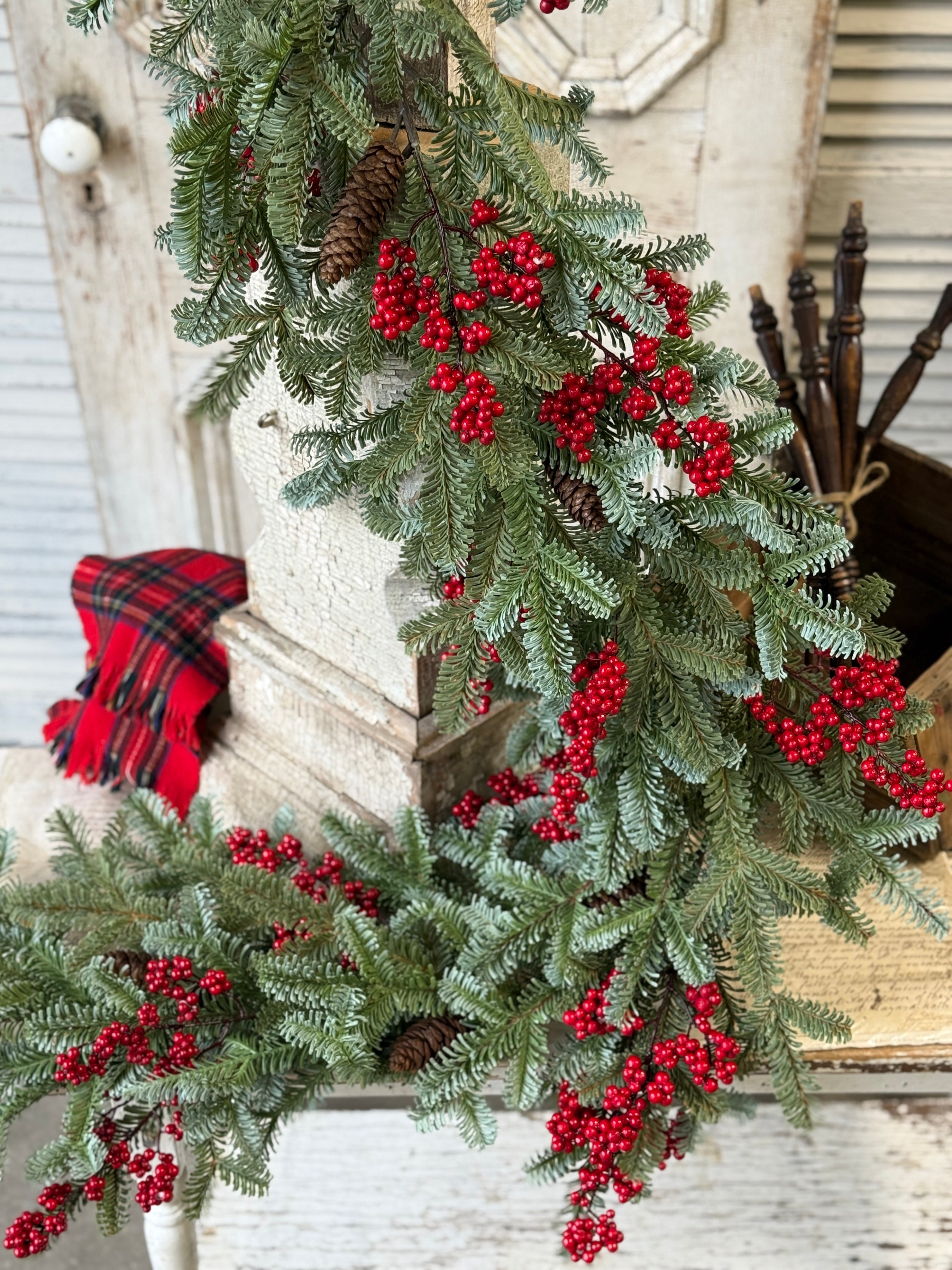 A wonderful collection of spruce peppered with sprigs of red berries and dashed with petite pine cones.