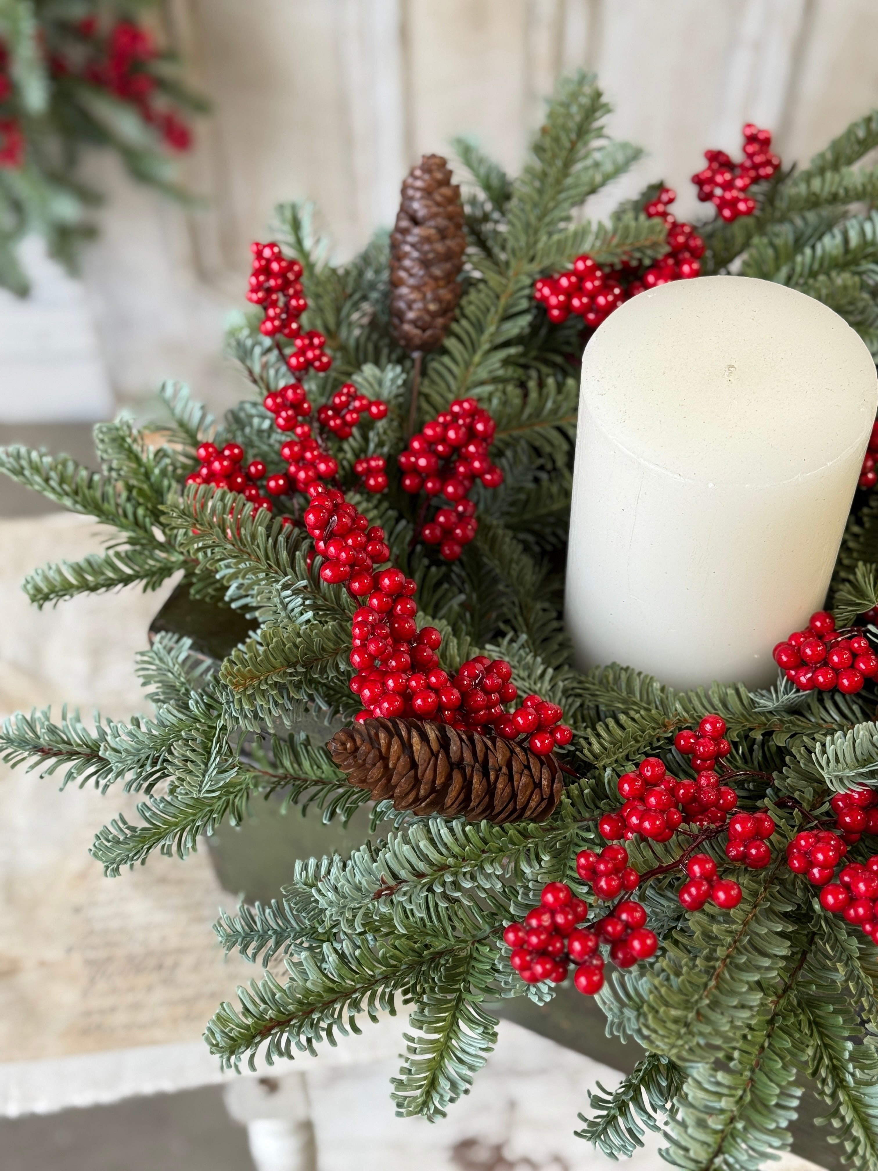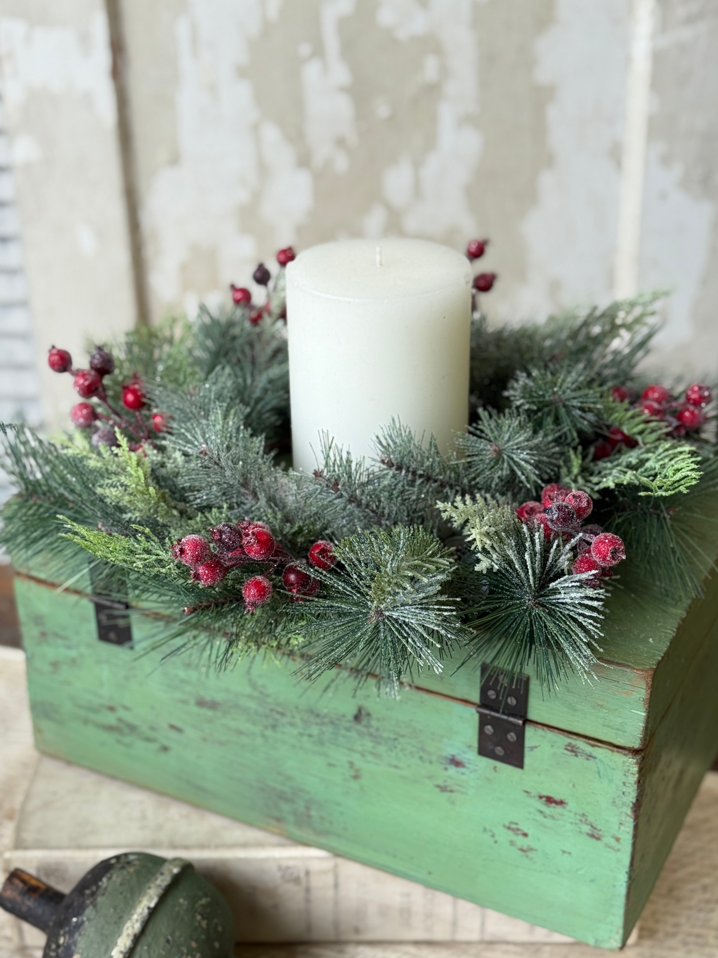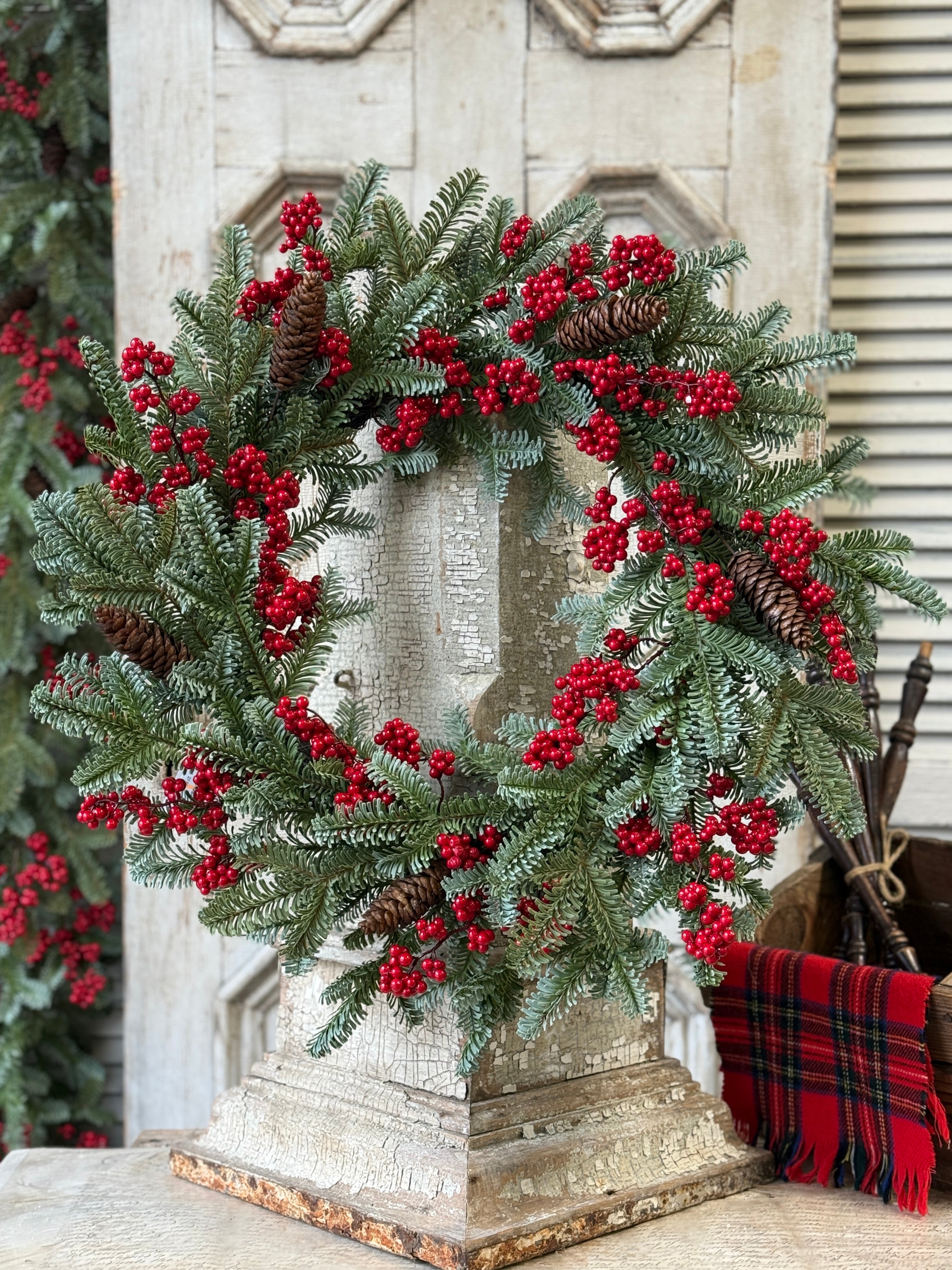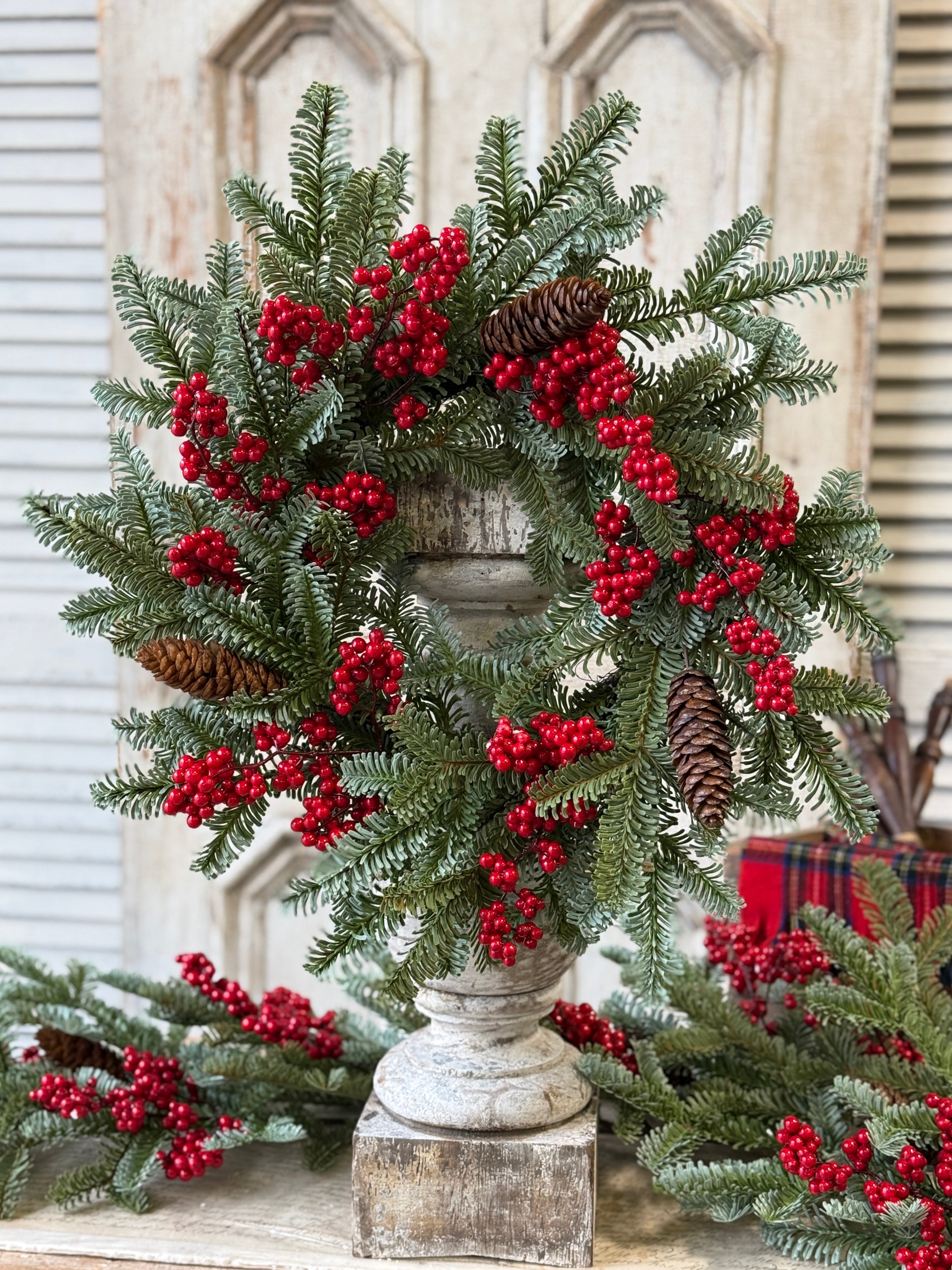 The frosty mixed greenery in this collection sets the stage for eye catching clusters of berries and petite pine cones. Has a wonderfully wintery feel!