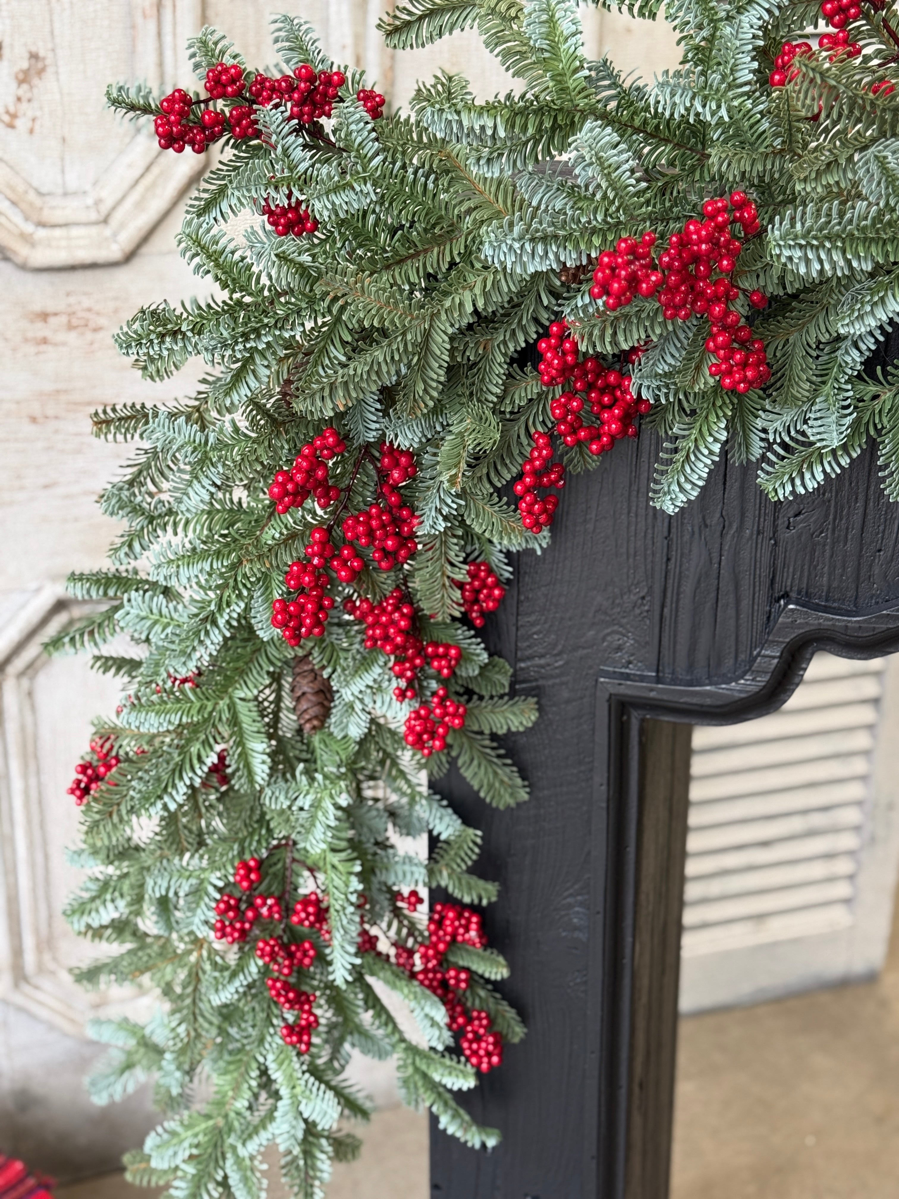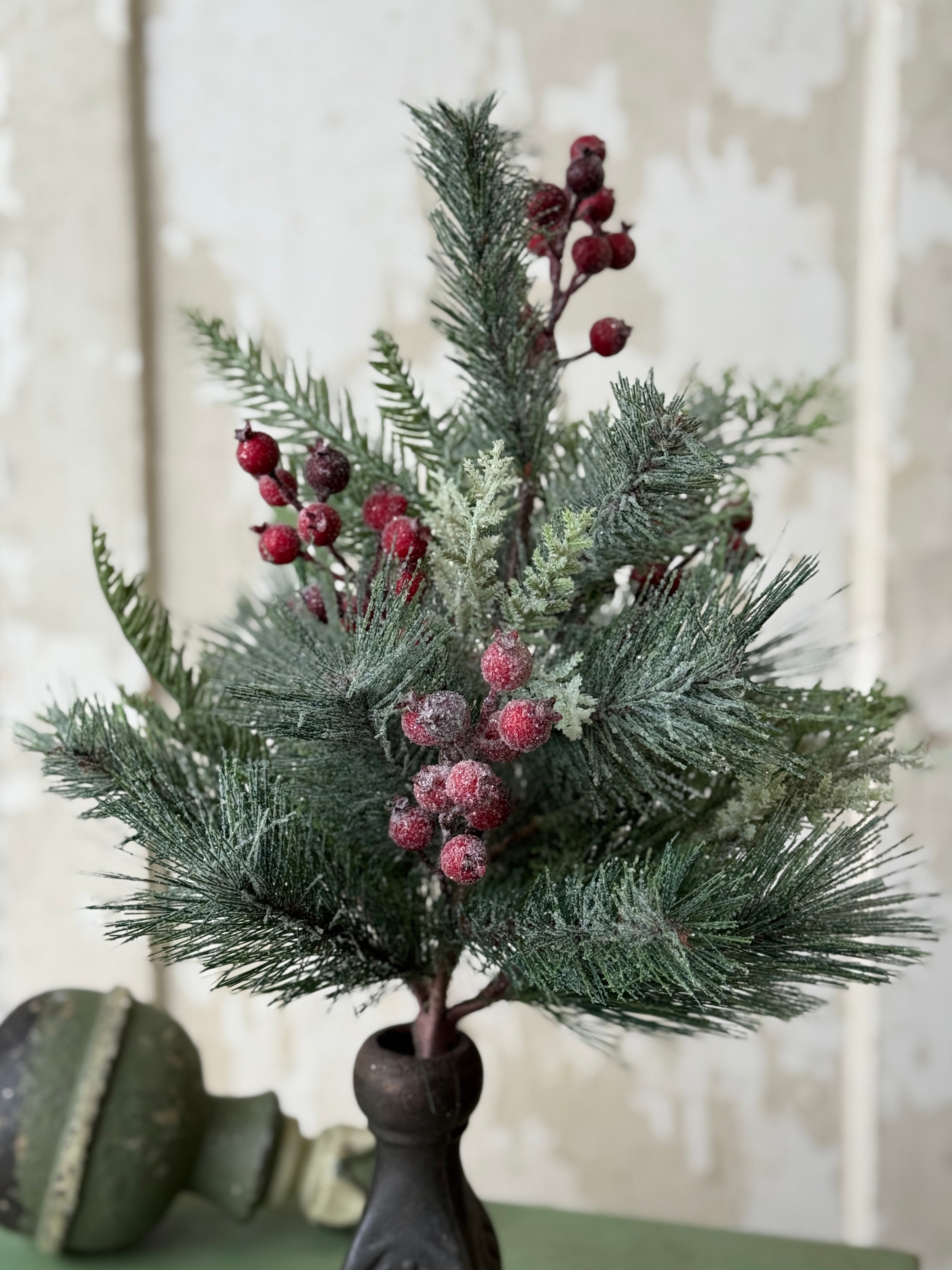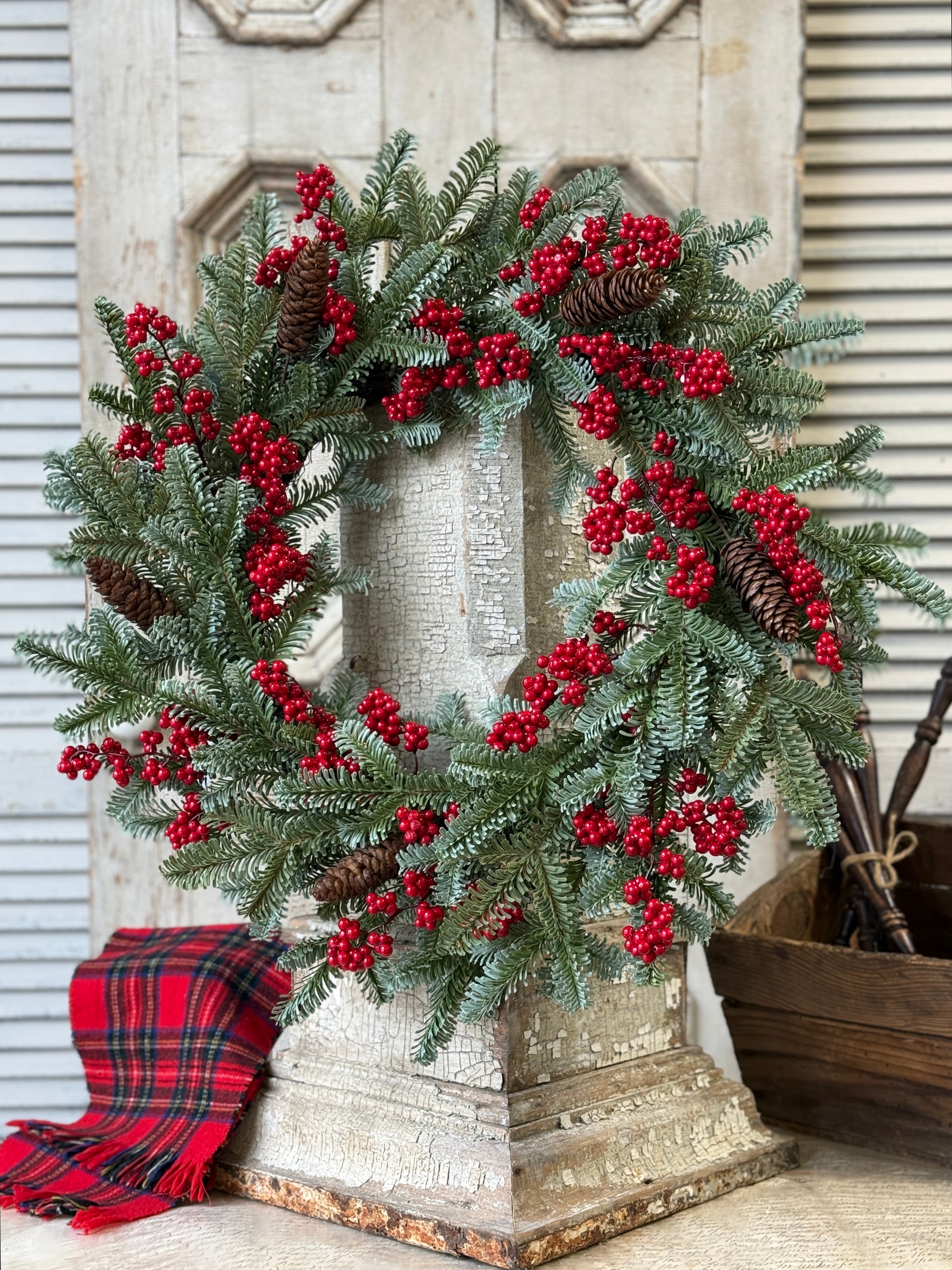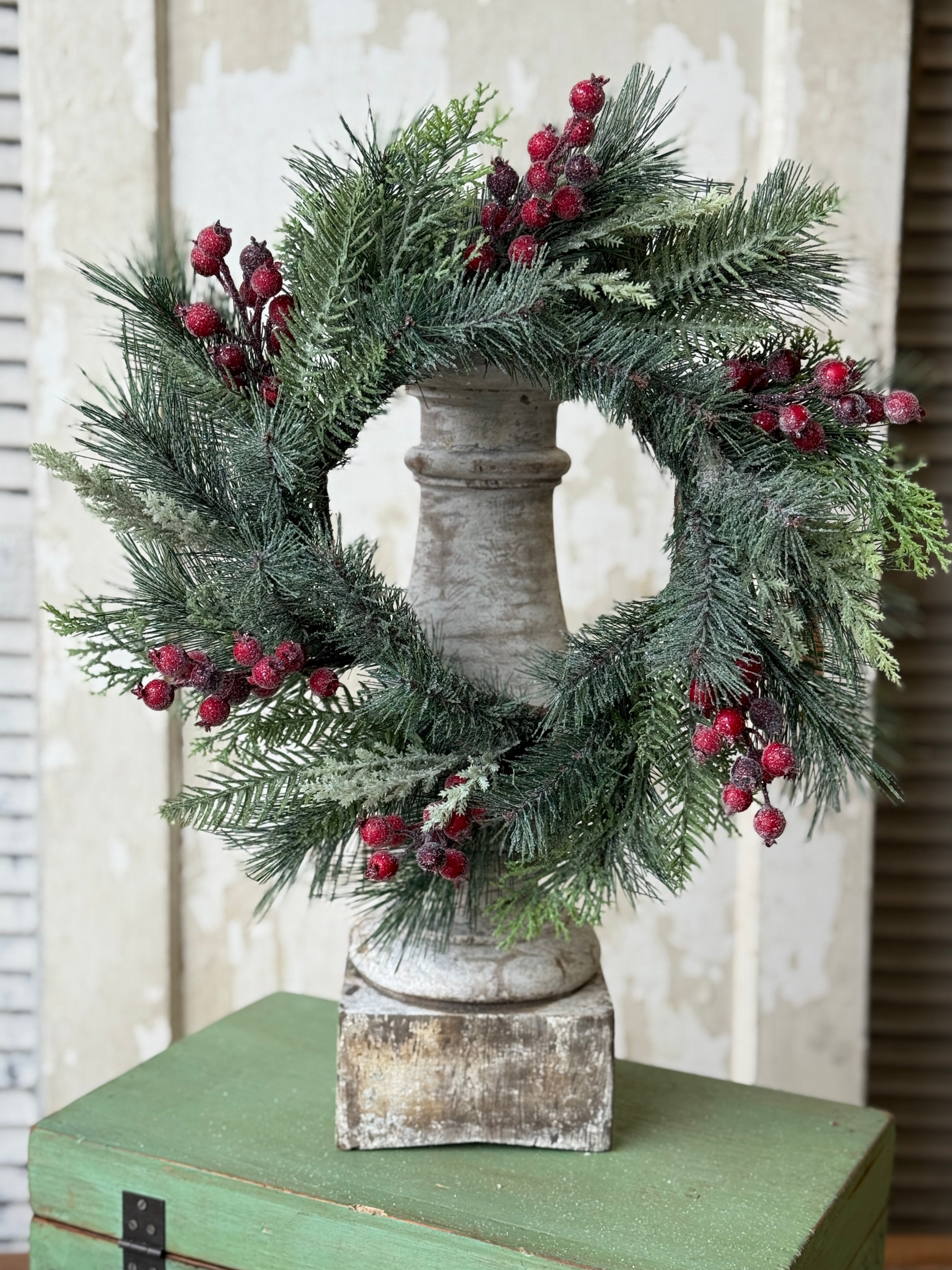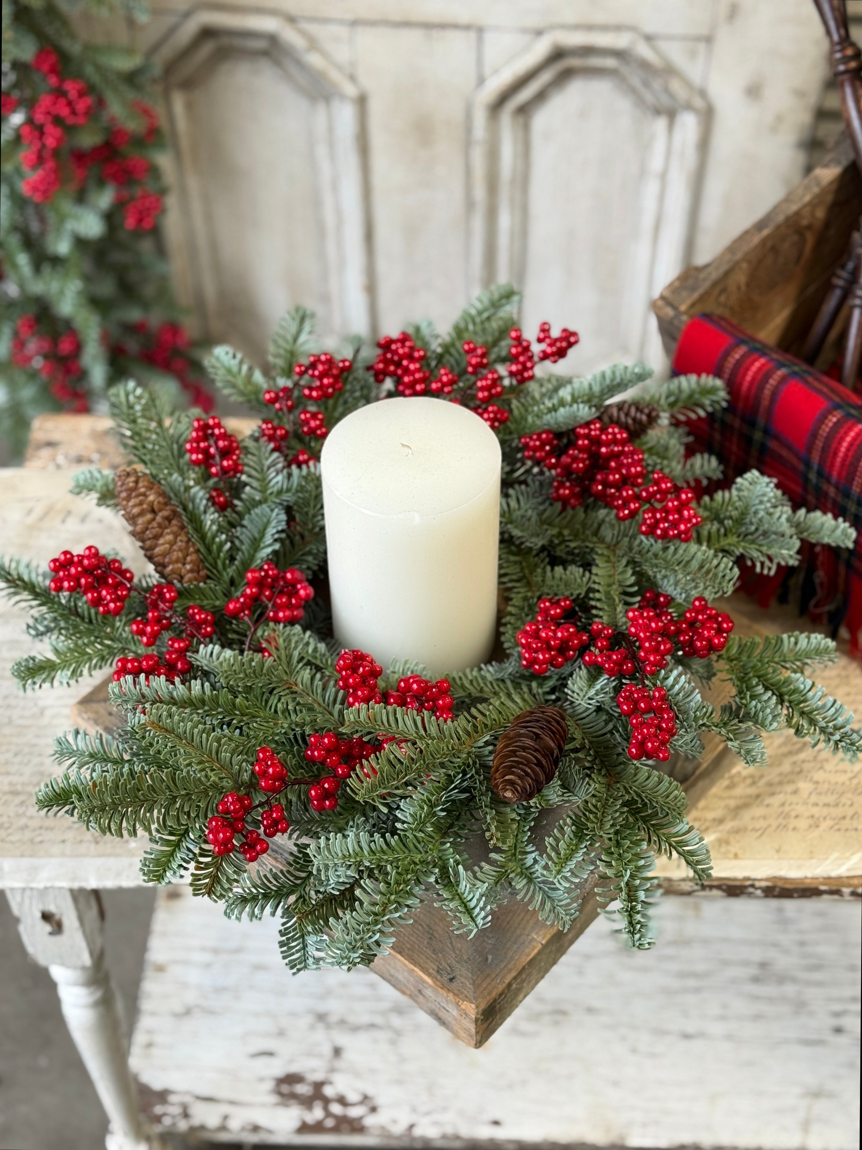 The frosty mixed greenery in this collection sets the stage for eye catching clusters of berries and petite pine cones. Has a wonderfully wintery feel!