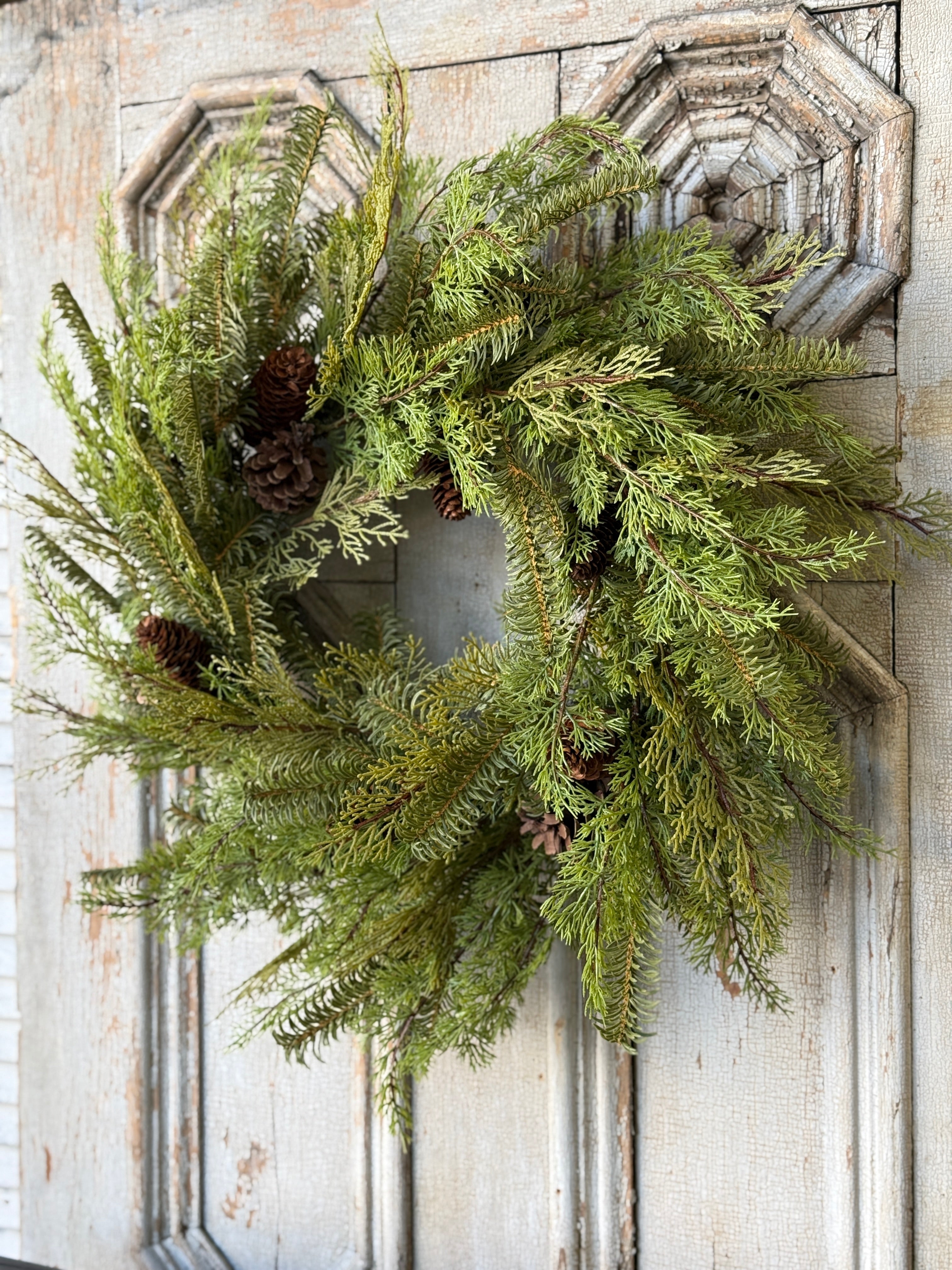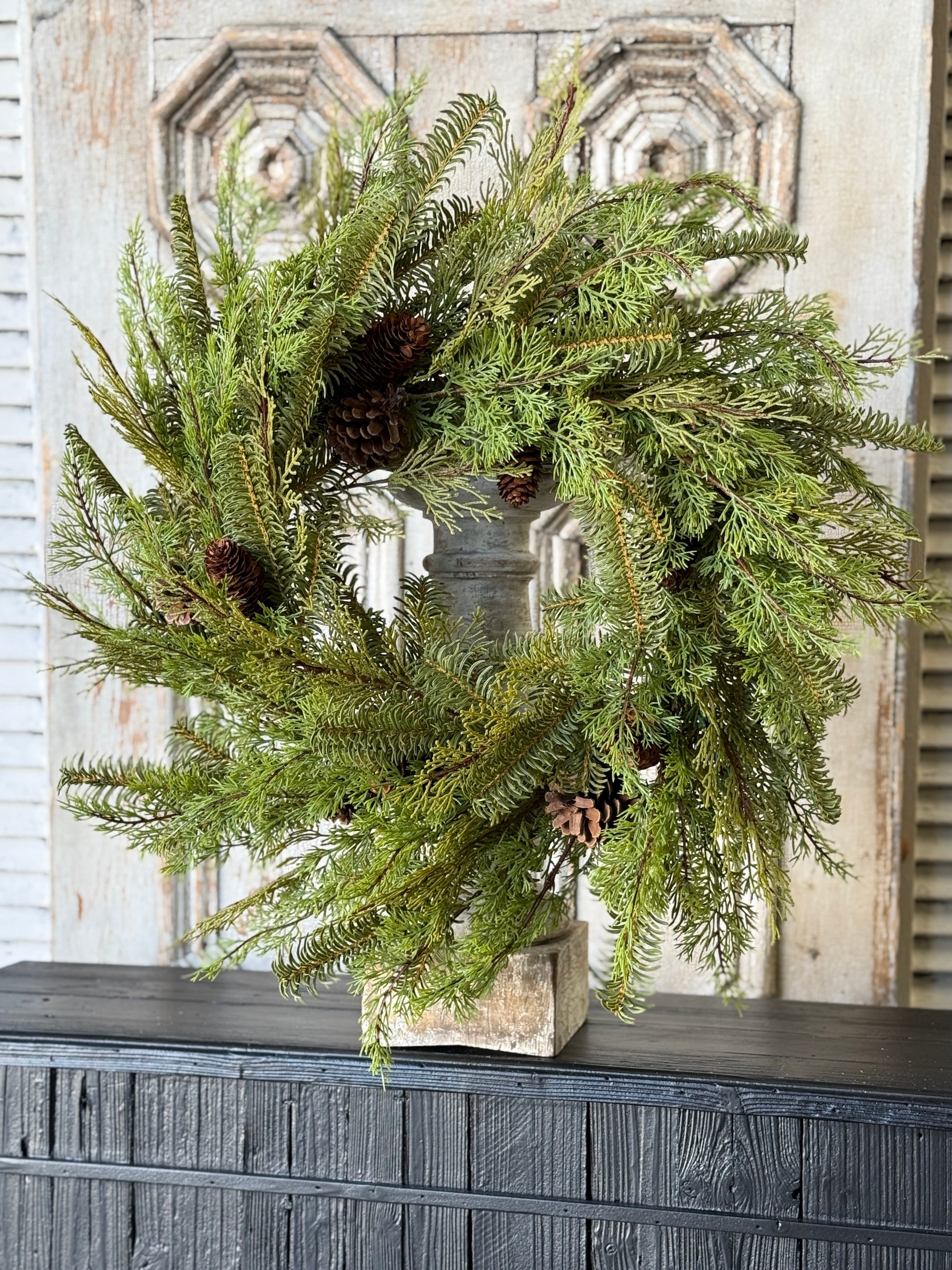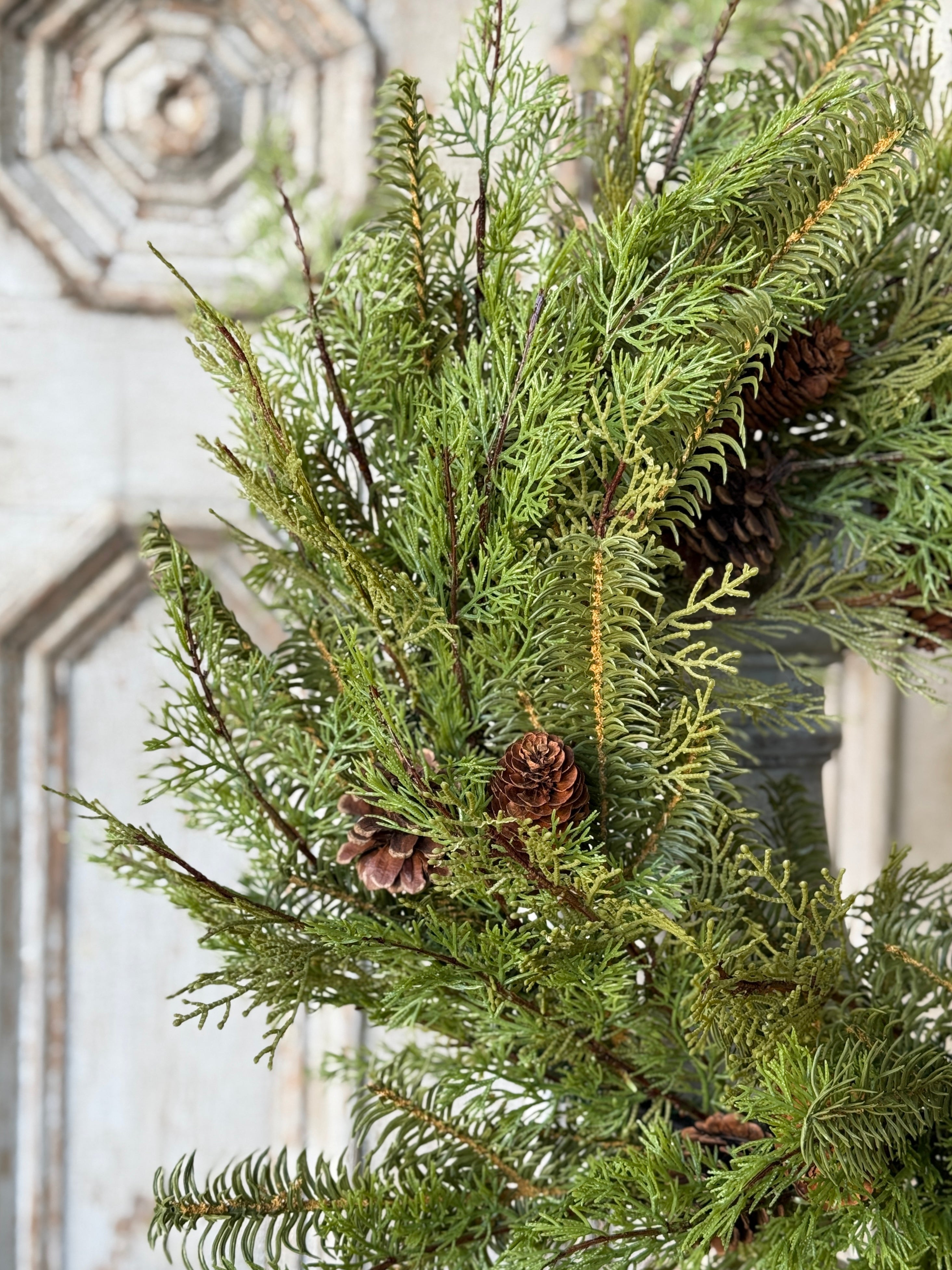 Wonderfully textured mixed greenery in lovely tonal shades of green is dashed with pine cones to create a woodsy collection that can easily be paired with other decor.