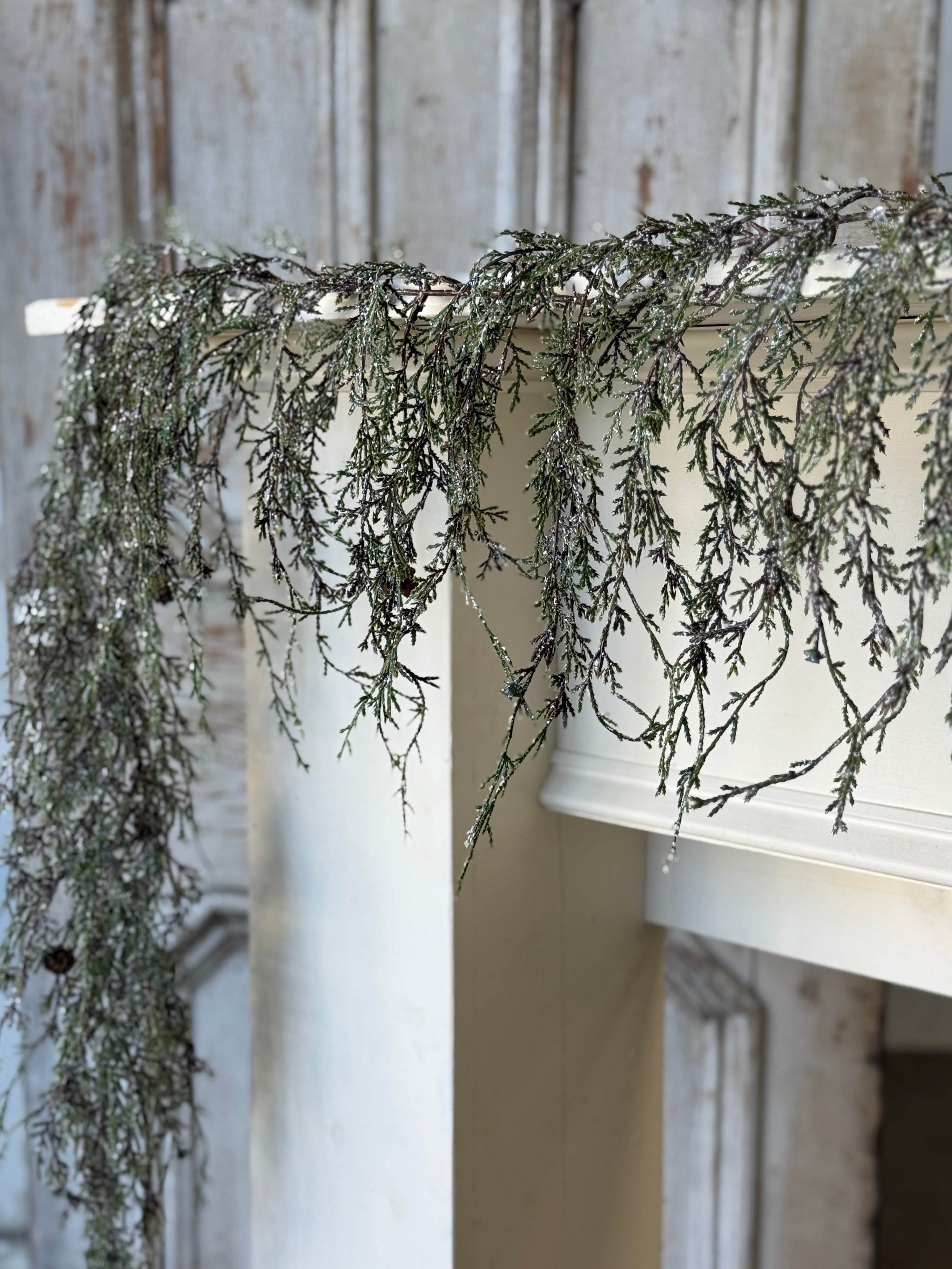 An ultra fine dusting of snow and glitter top these structural juniper branches. Small pine cones are peppered throughout the greenery.