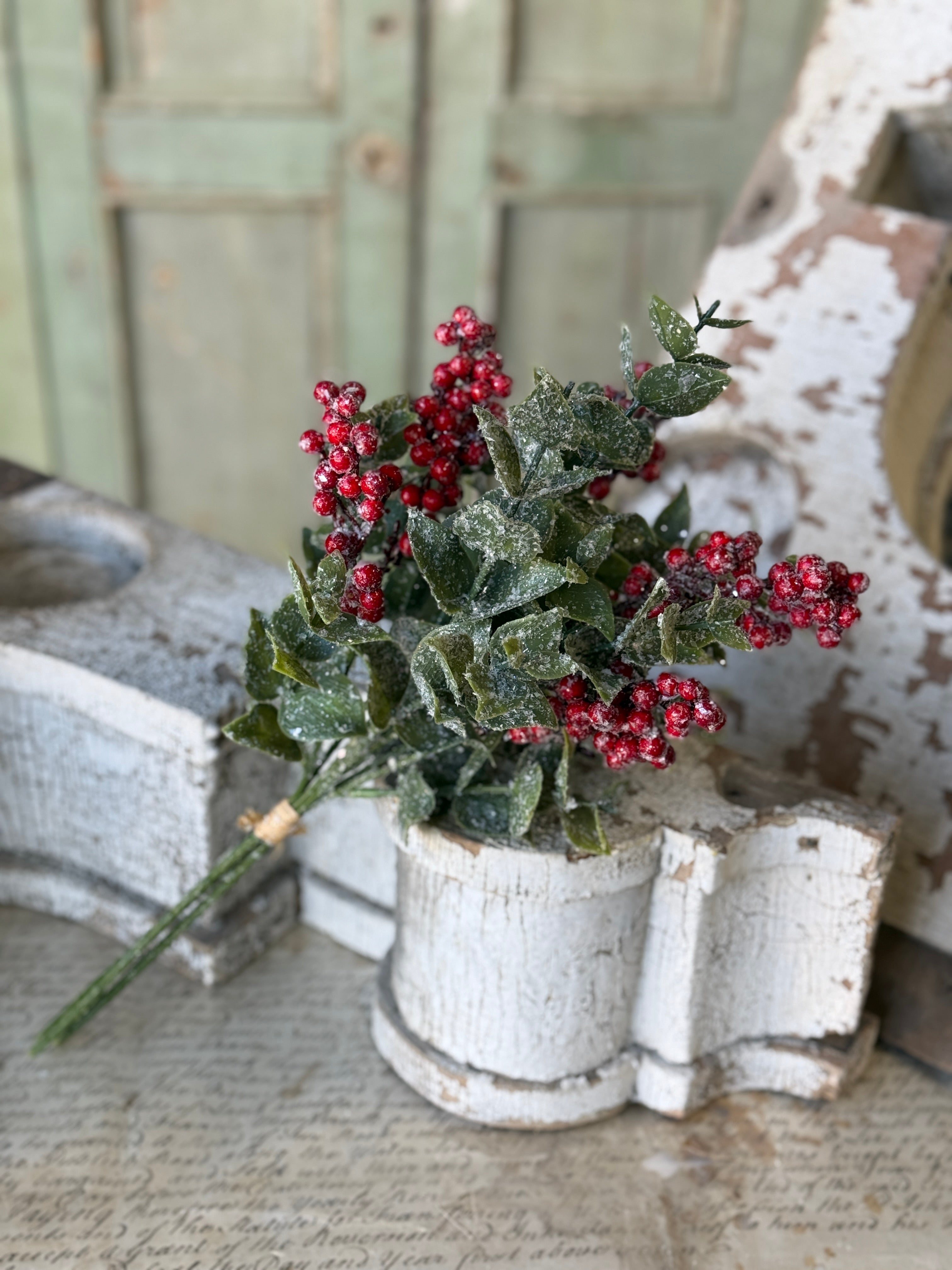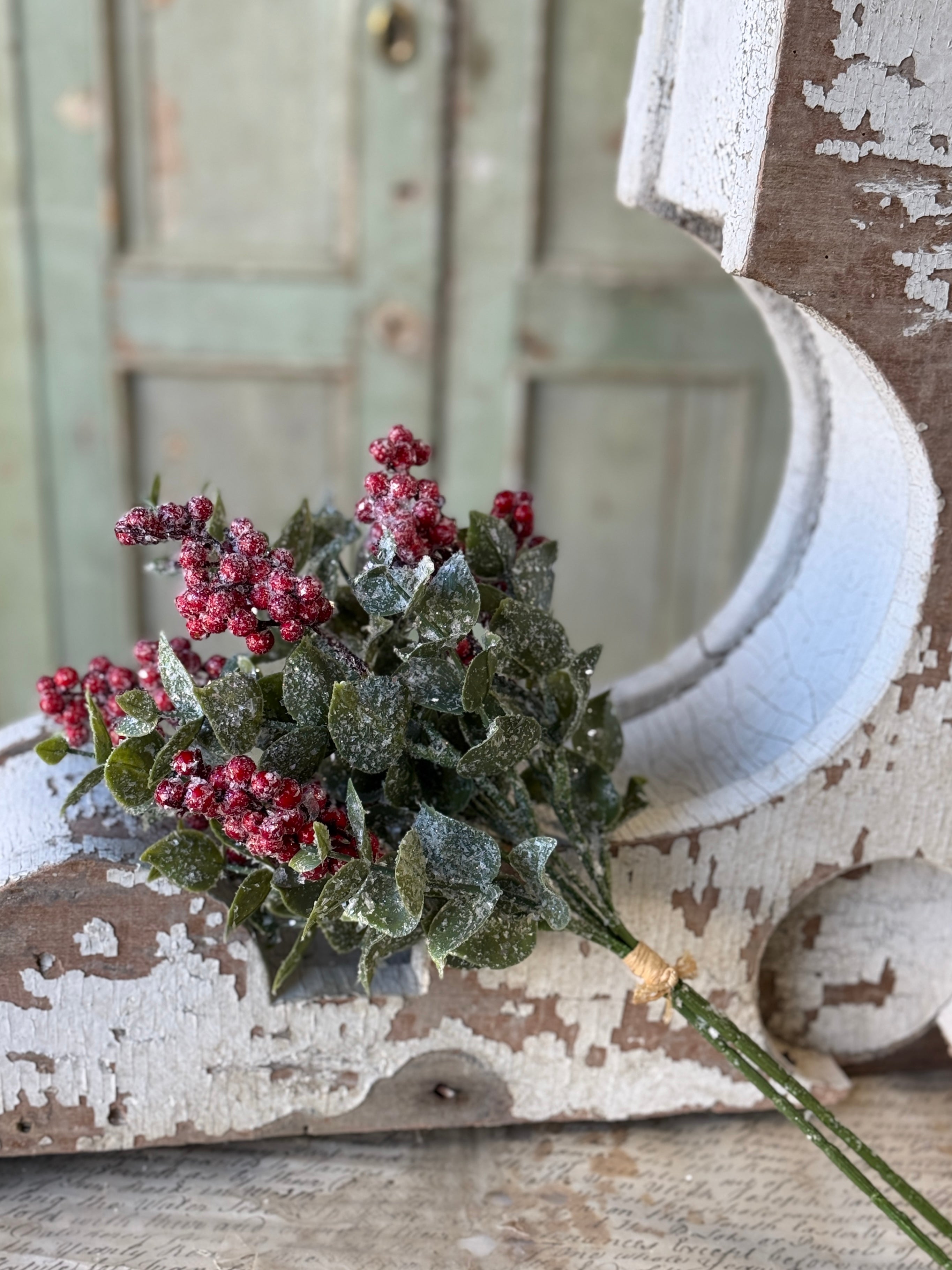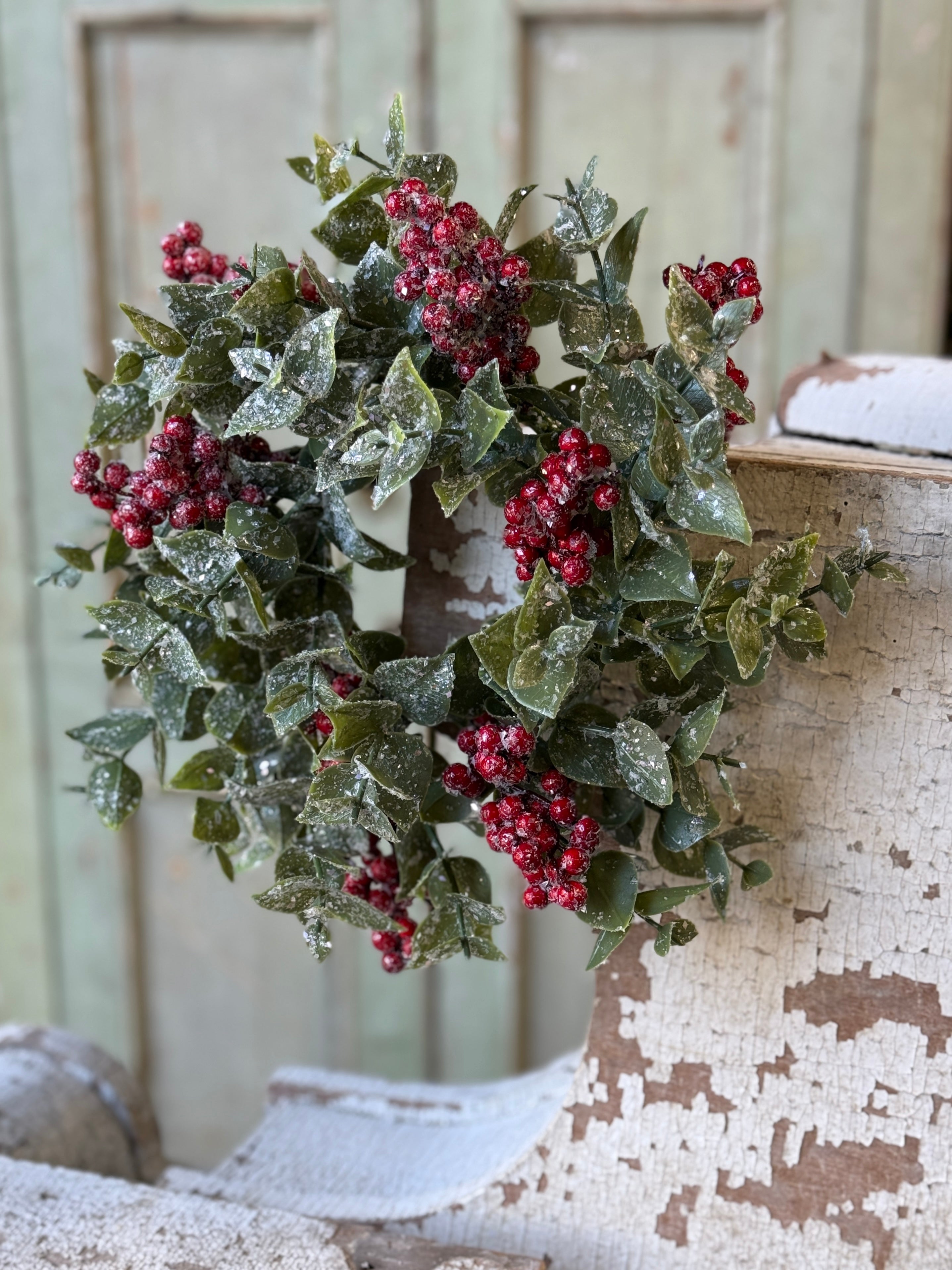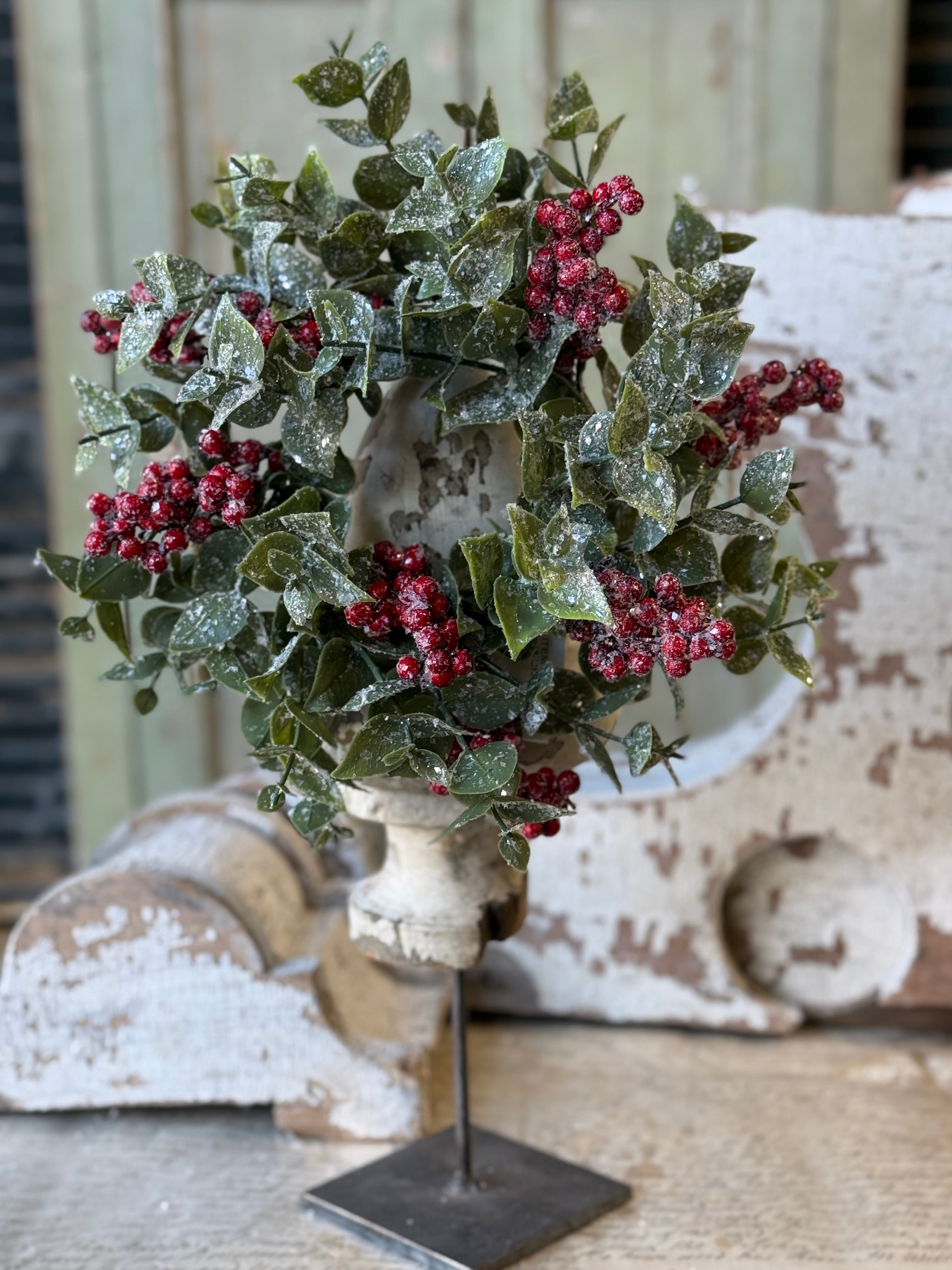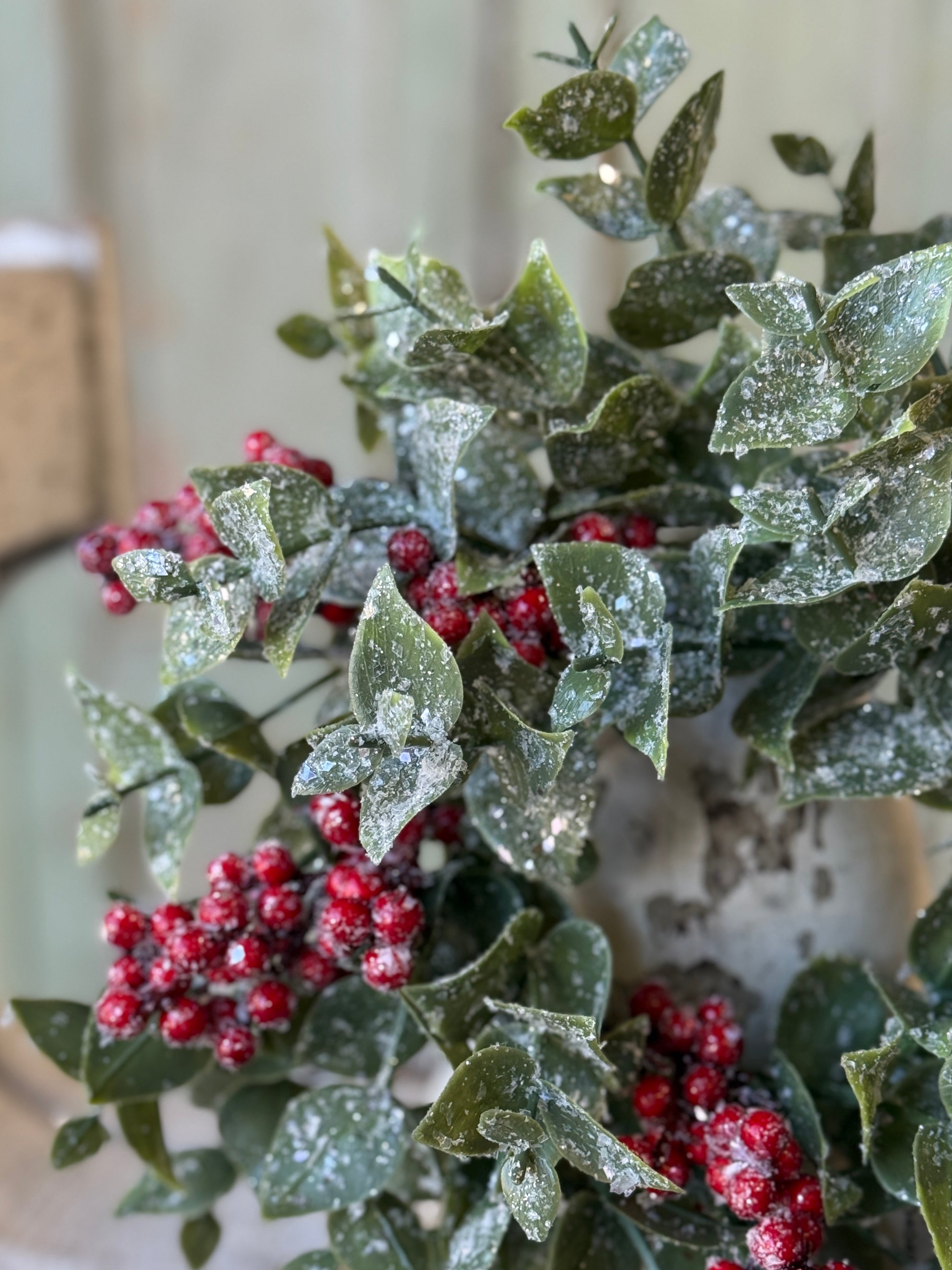 Broad leaved eucalyptus surrounds clusters of showy red berries and is dashed with buffalo snow for a beautiful winter collection that brings on the charm.