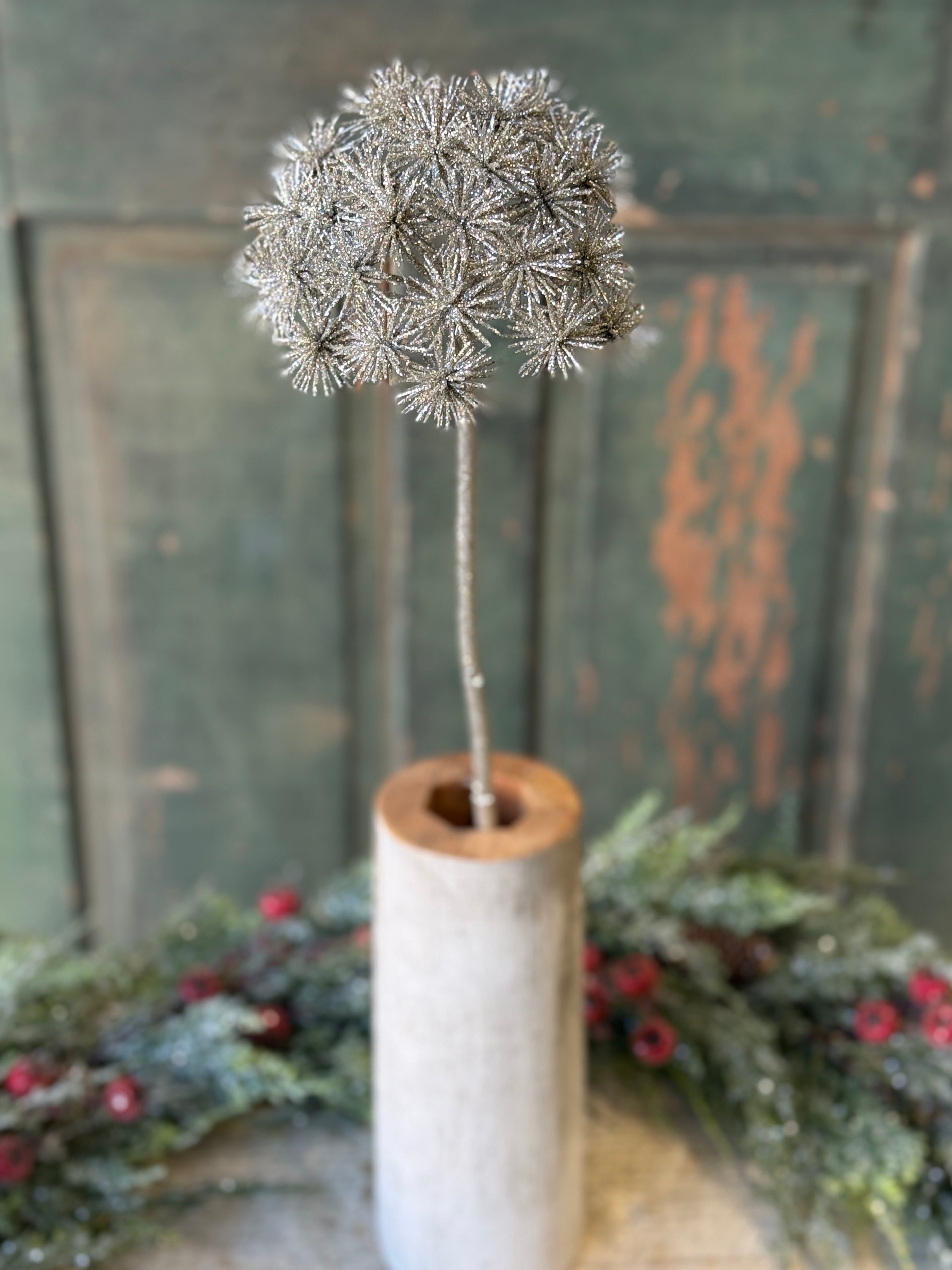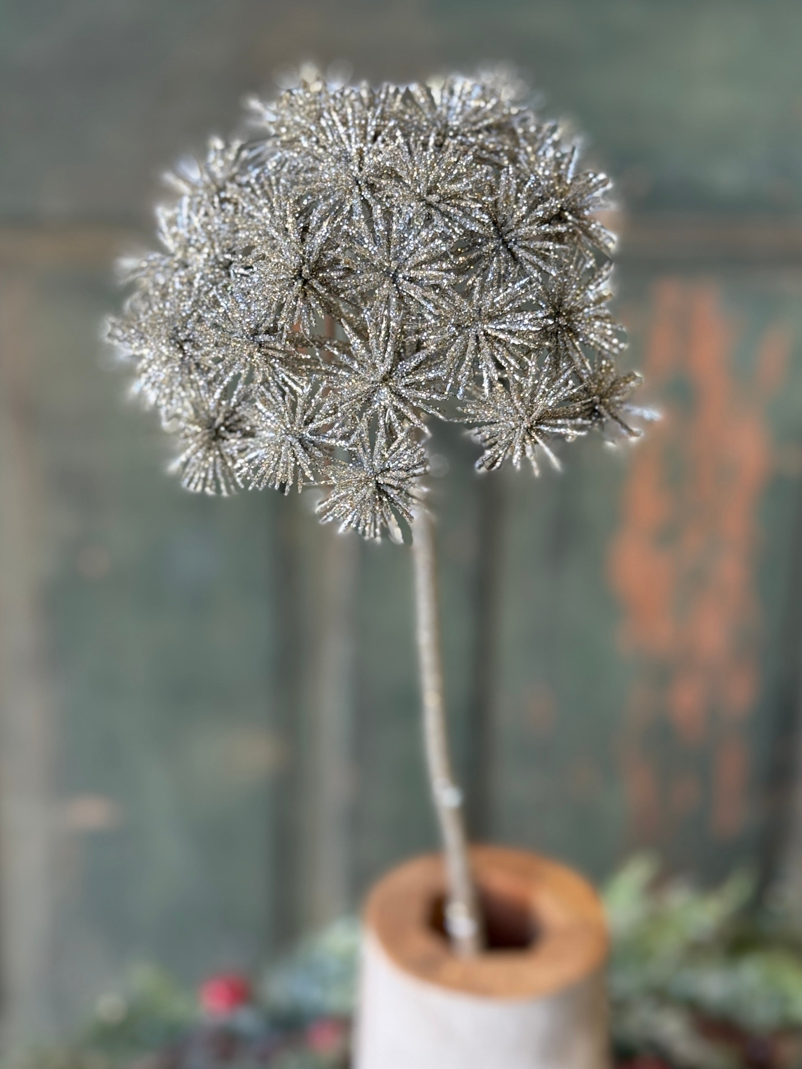Glittered starbursts top stately stems and create a showy and festive addition to any space.