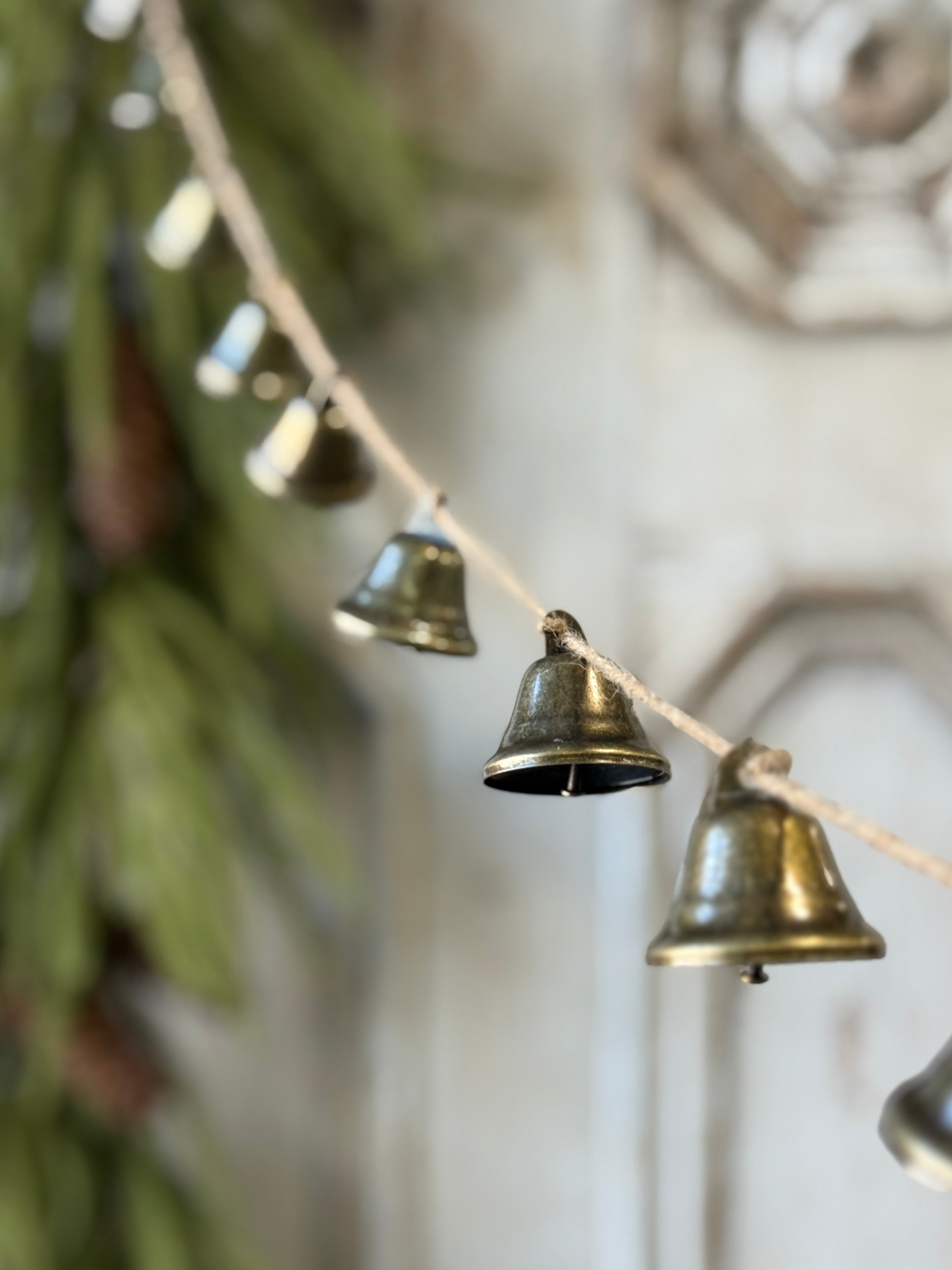 Small antique brass finished bells dance along a rope base for a most charming addition to displays. These bells have a sweet and cheerful chime and are one of the prettiest you could ask for sound-wise. Each bell measures approx. 1.5" tall.