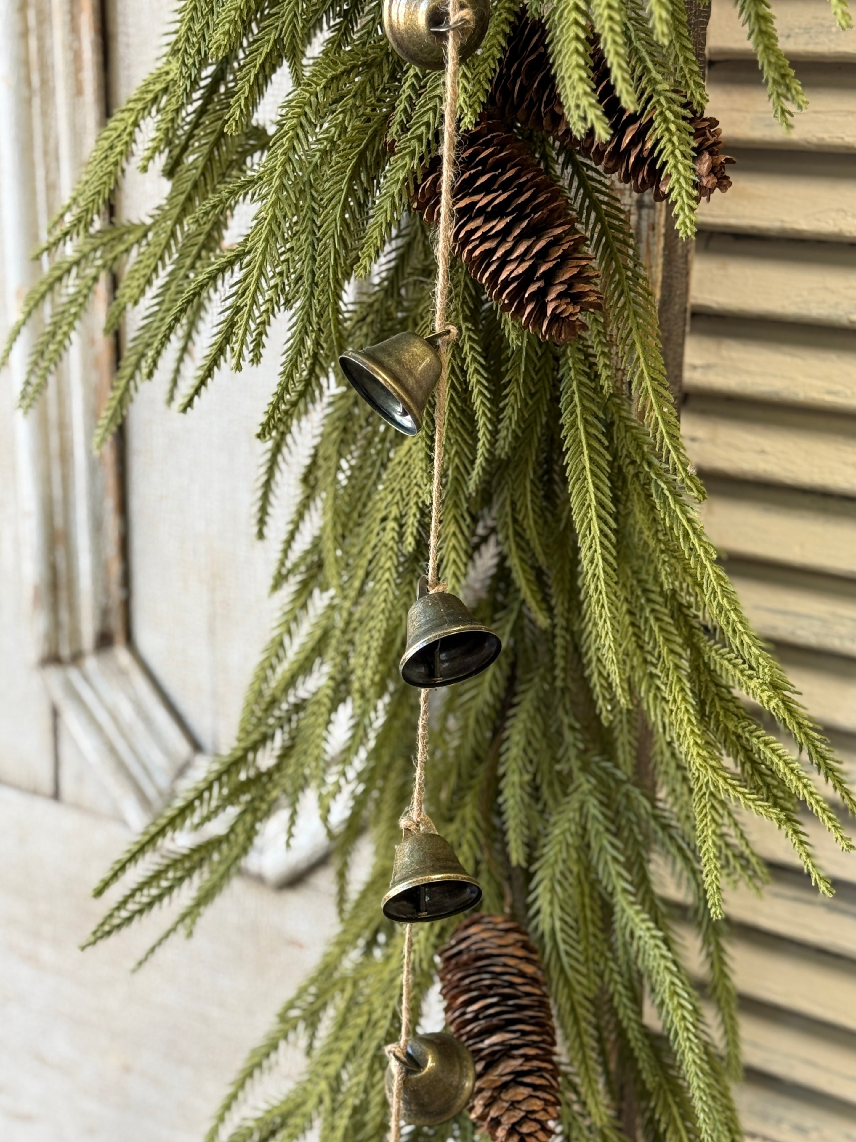 Small antique brass finished bells drape from a clutch of glittering mixed greenery and pine cones. These bells have a sweet and cheerful chime and are one of the prettiest you could ask for sound-wise. Each bell measures approx. 1.5" tall.