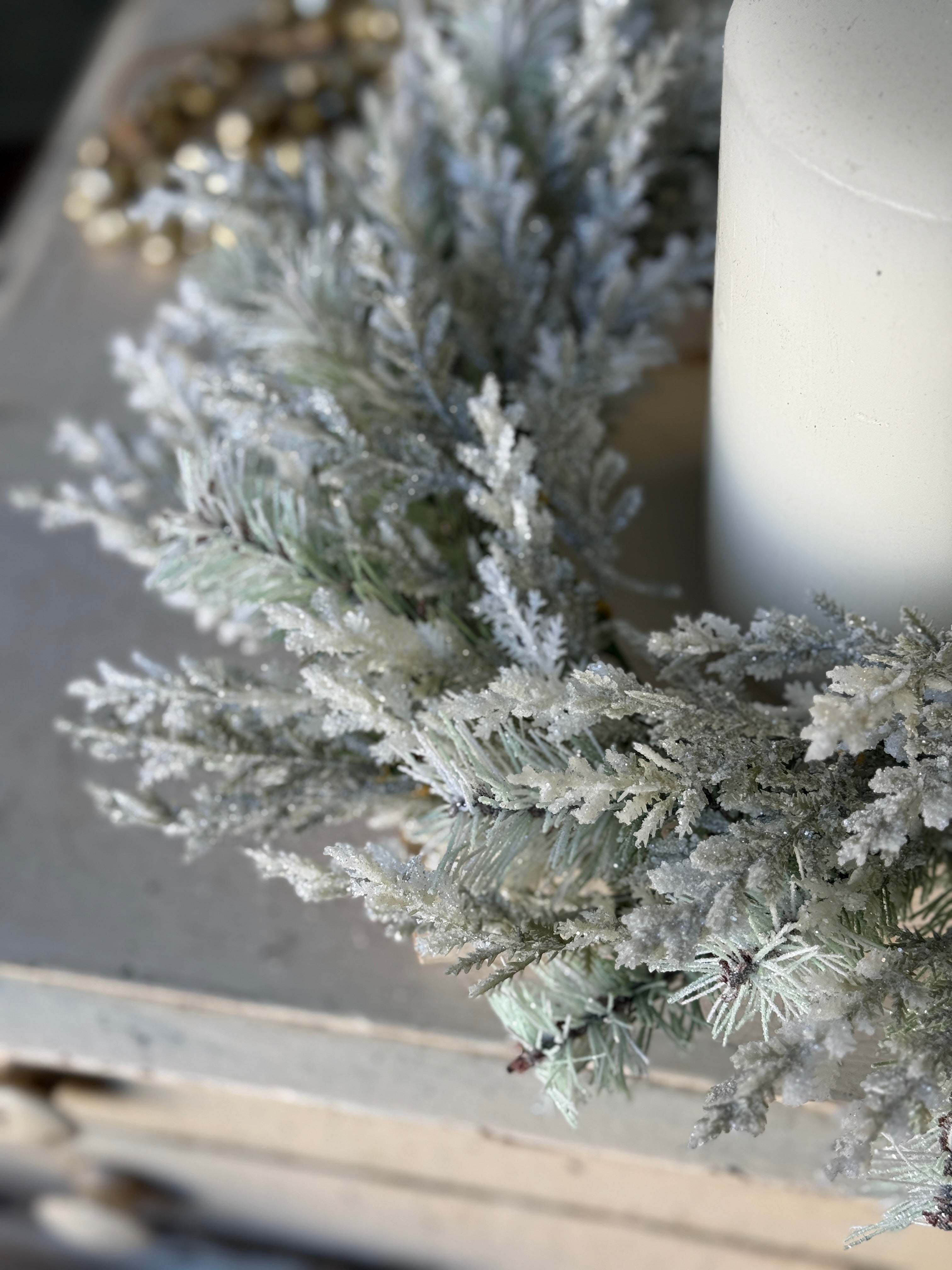 Frosted cedar greenery with a smattering of glitter makes a wintery collection that is easy to style and great for winter long use. Features decorative green berries for extra interest.