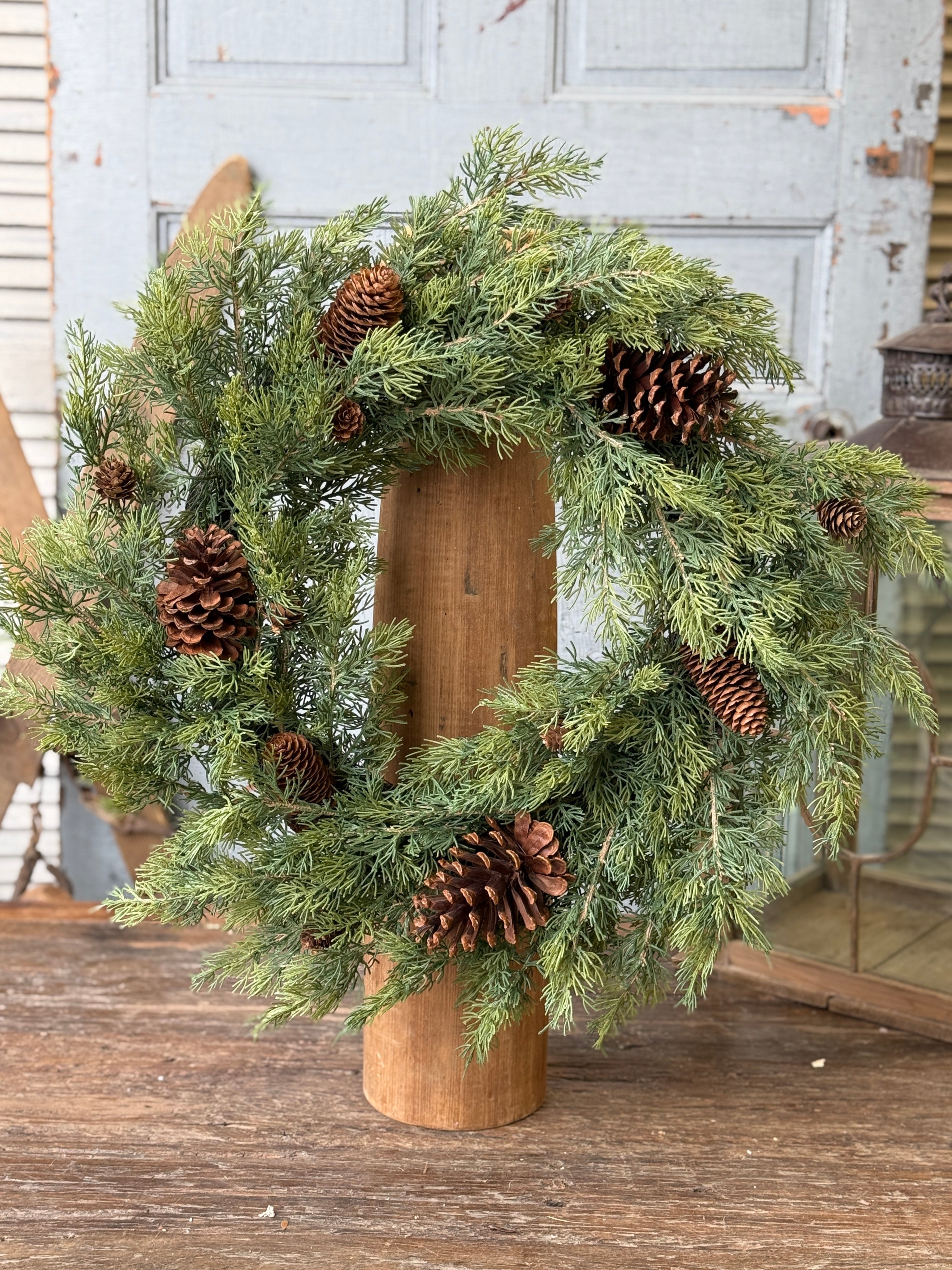 Tendrils of soft touch greenery in a rich green tones are peppered with petite pine cones and small branching accents with seed heads. A gorgeous season spanning collection that is infinitely versatile.