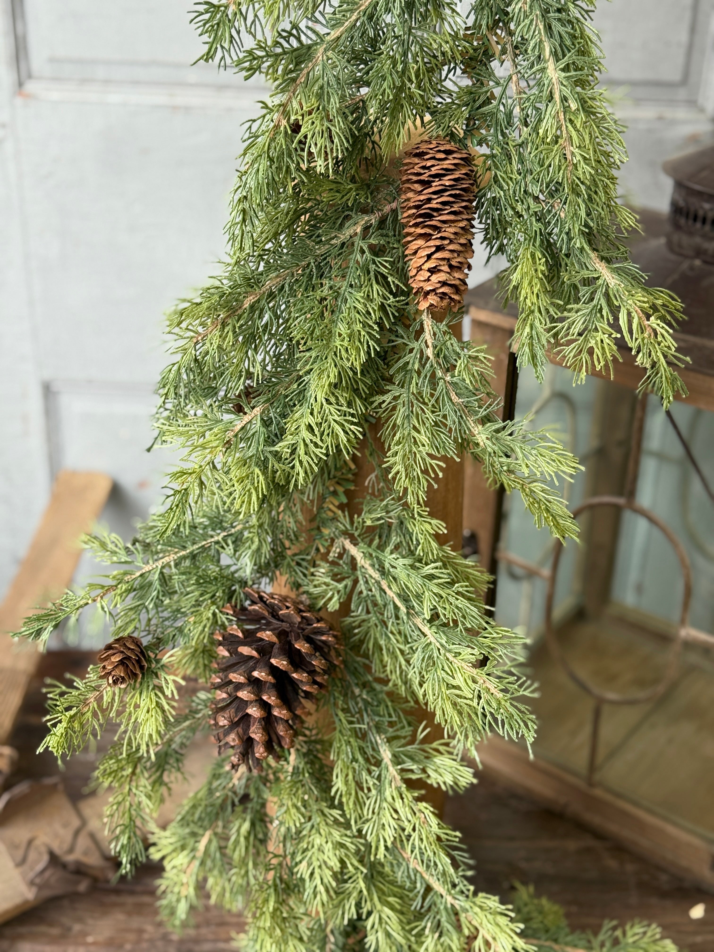 Tendrils of cascading soft touch greenery in tonal shades of green are peppered with baby pine cones. A gorgeous season spanning collection with unsurpassed styling options.