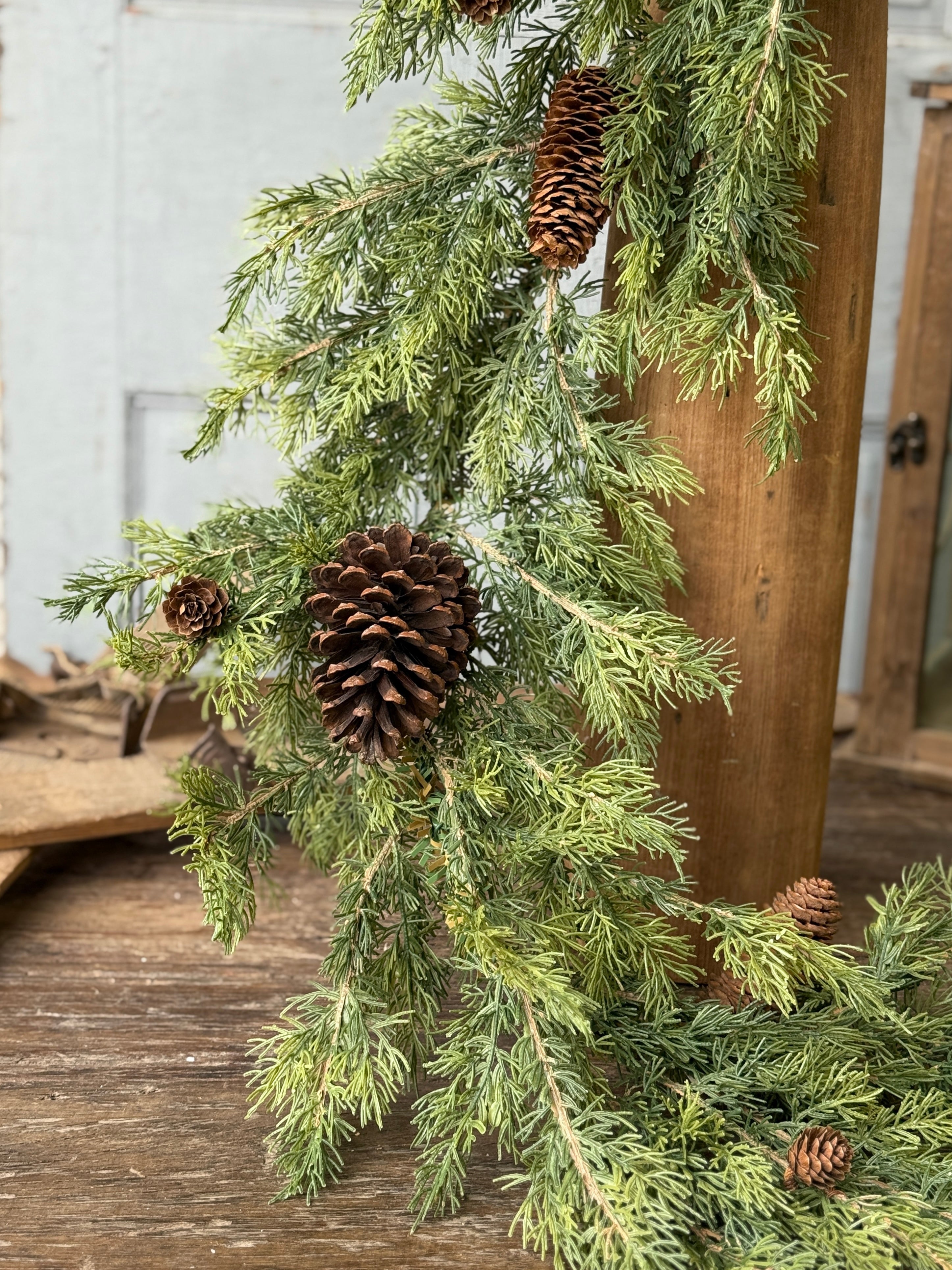 Beautiful dual shades of emerald green pine laced with pine cones makes a wonderfully versatile collection that adds the perfect dash of woodsy charm to displays.