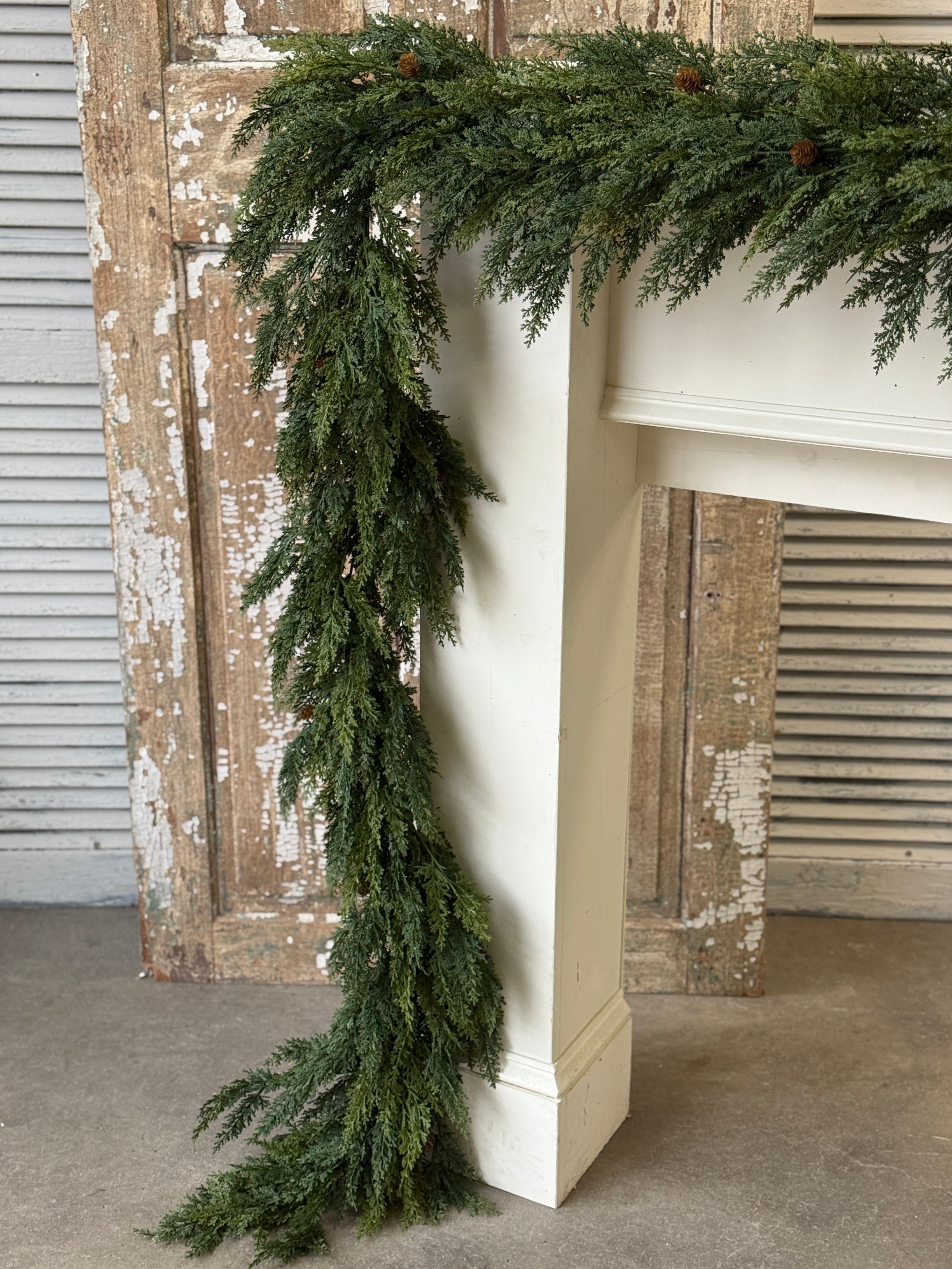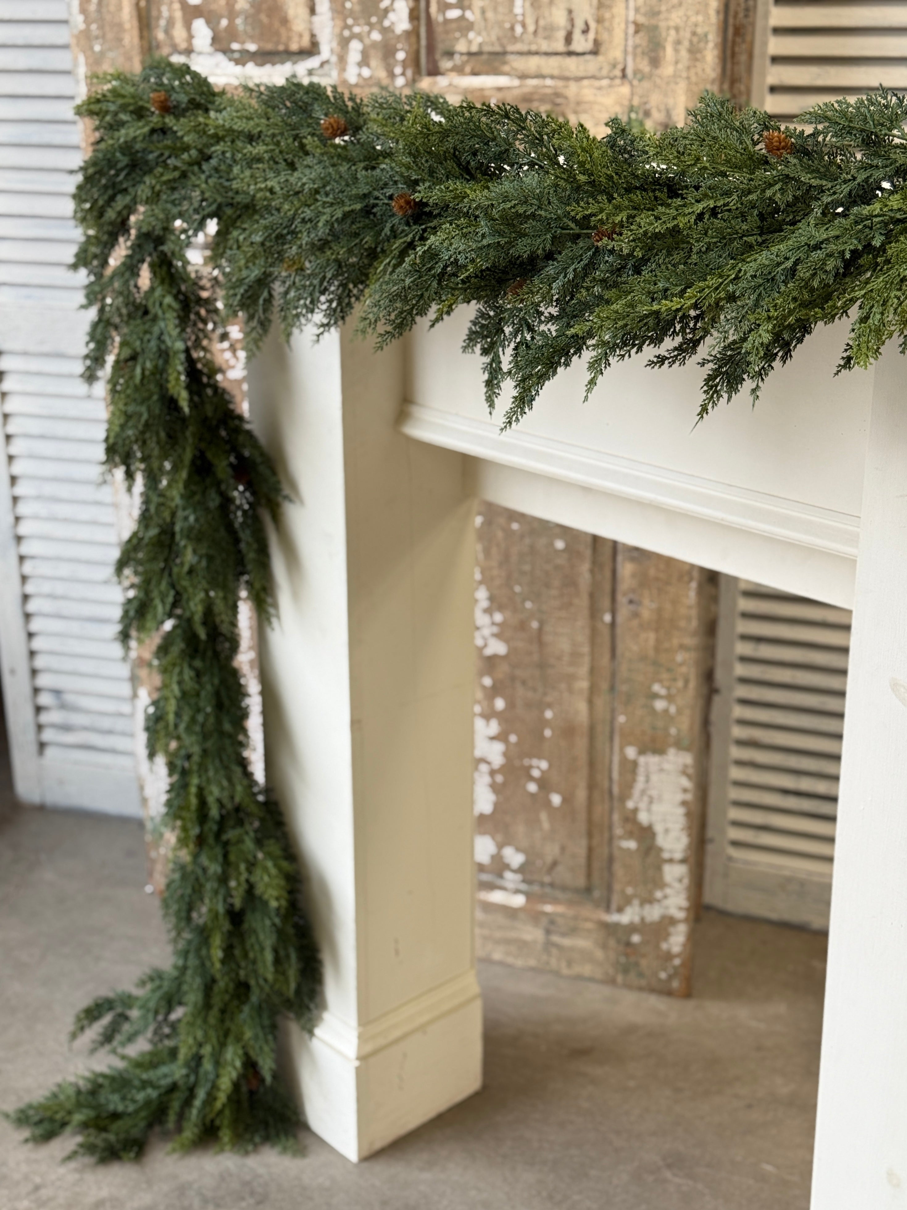 The Woodbridge Cedar is a glorious soft touch greenery collection that is composed of lush, verdant foliage peppered with small pine cones. It makes a fabulous and textural addition to any and every holiday line and is one that is sure to become a favorite. The garland offers 9 FEET of luxe greenery that allows for infinite styling options.