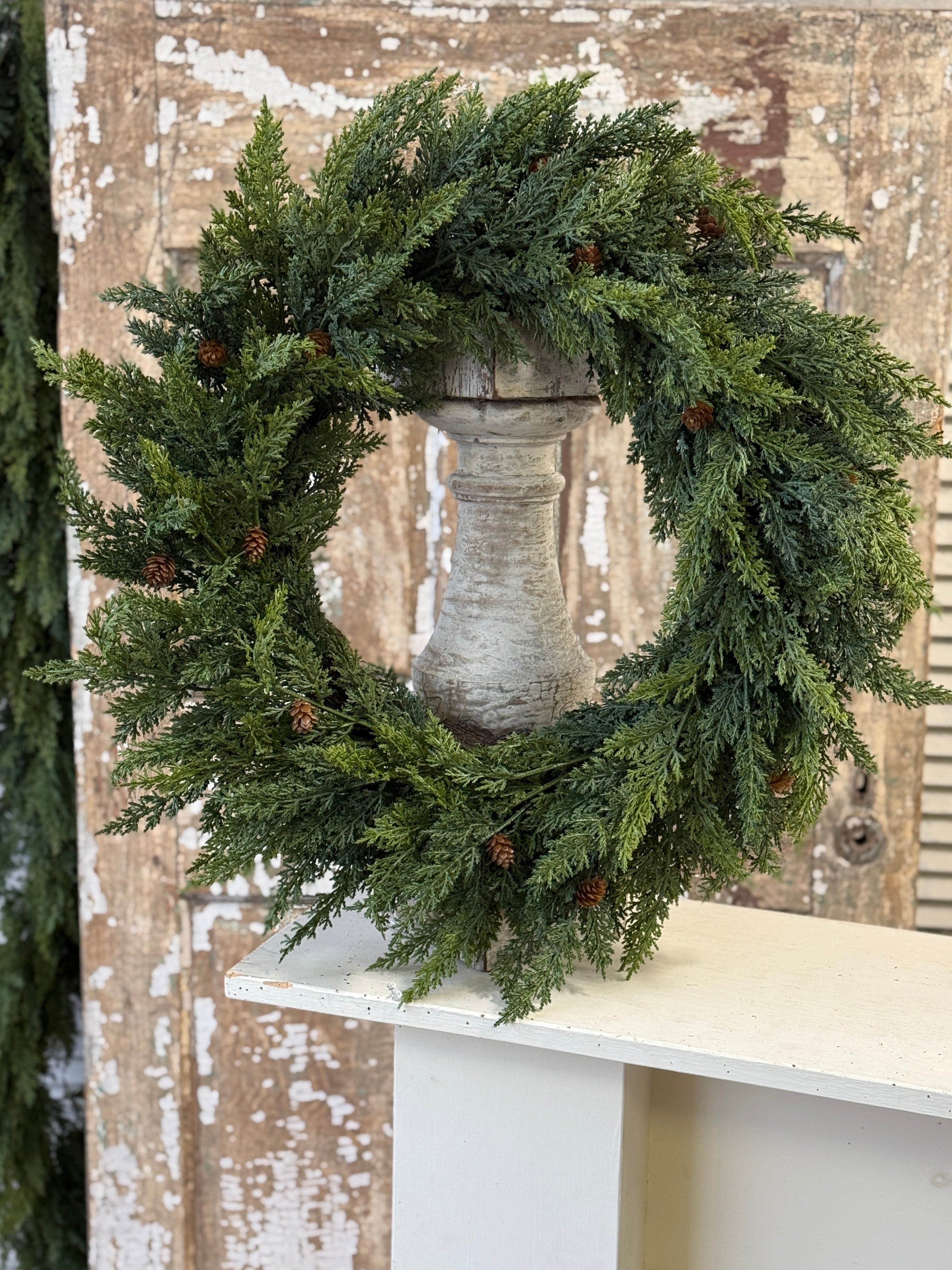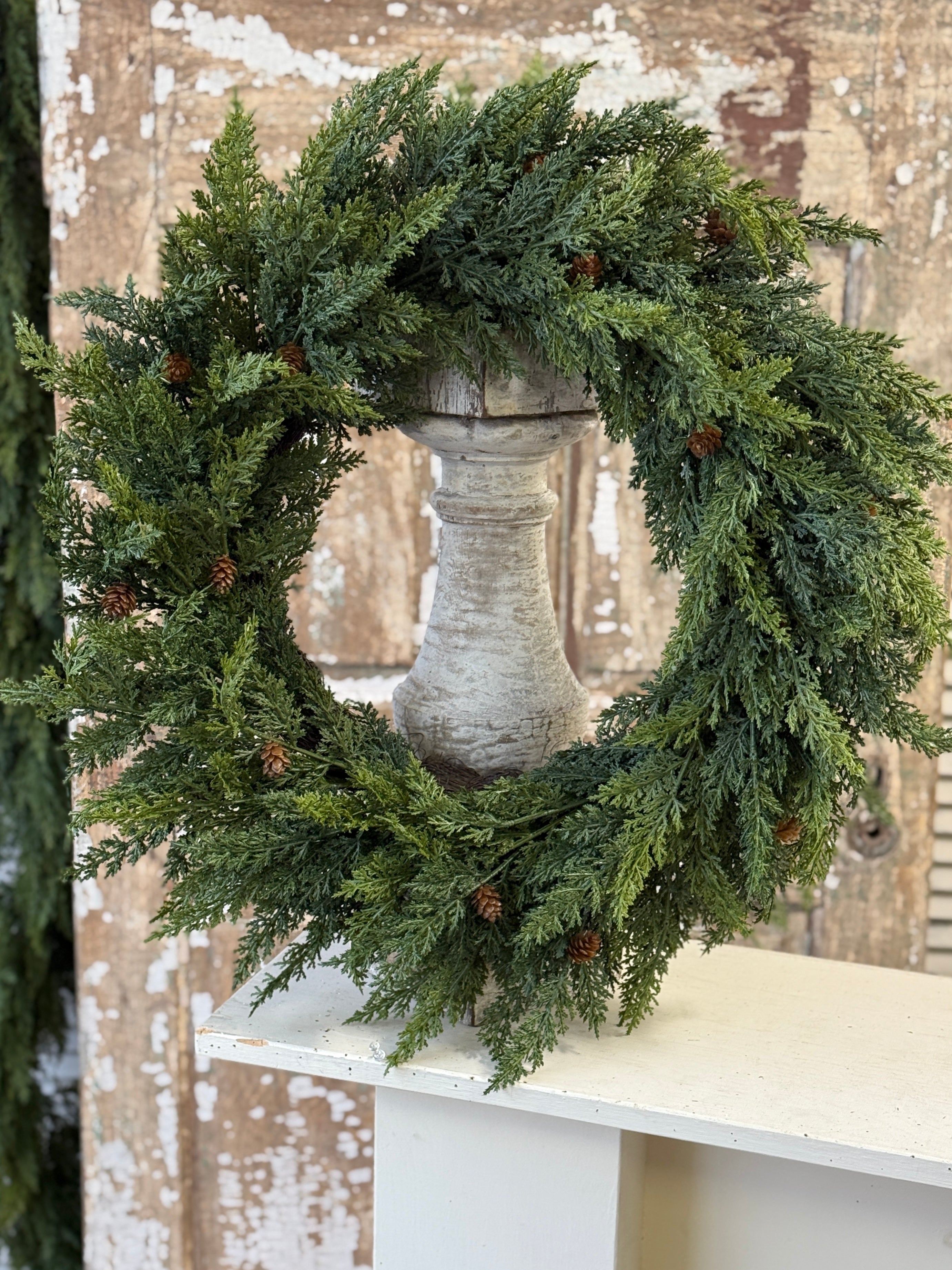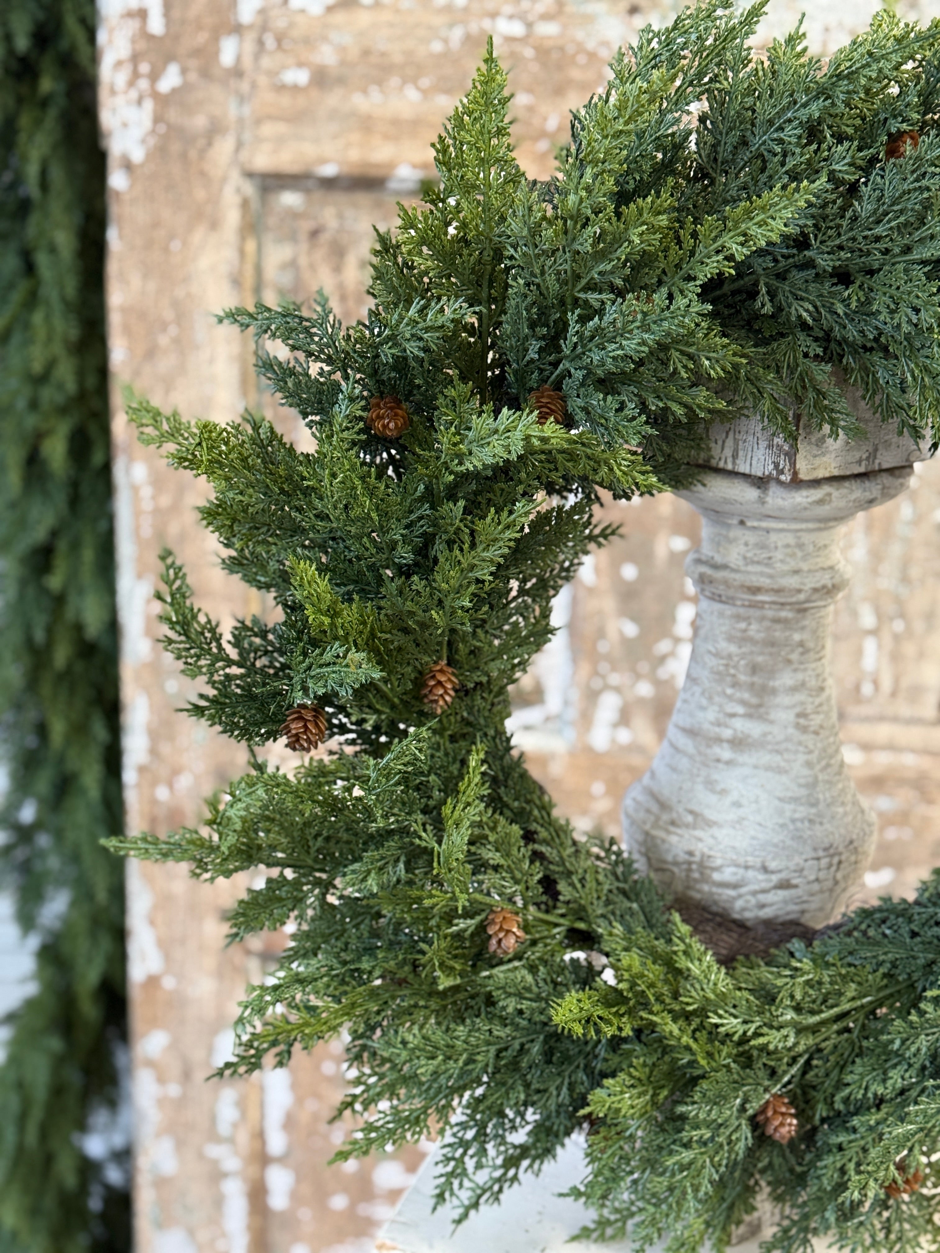 The Tarrytown Cedar collection delivers a woodland feel to vignettes and displays! Attractive shoots of cedar in a lovely vibrant tones are peppered with pines cones for extra charm.