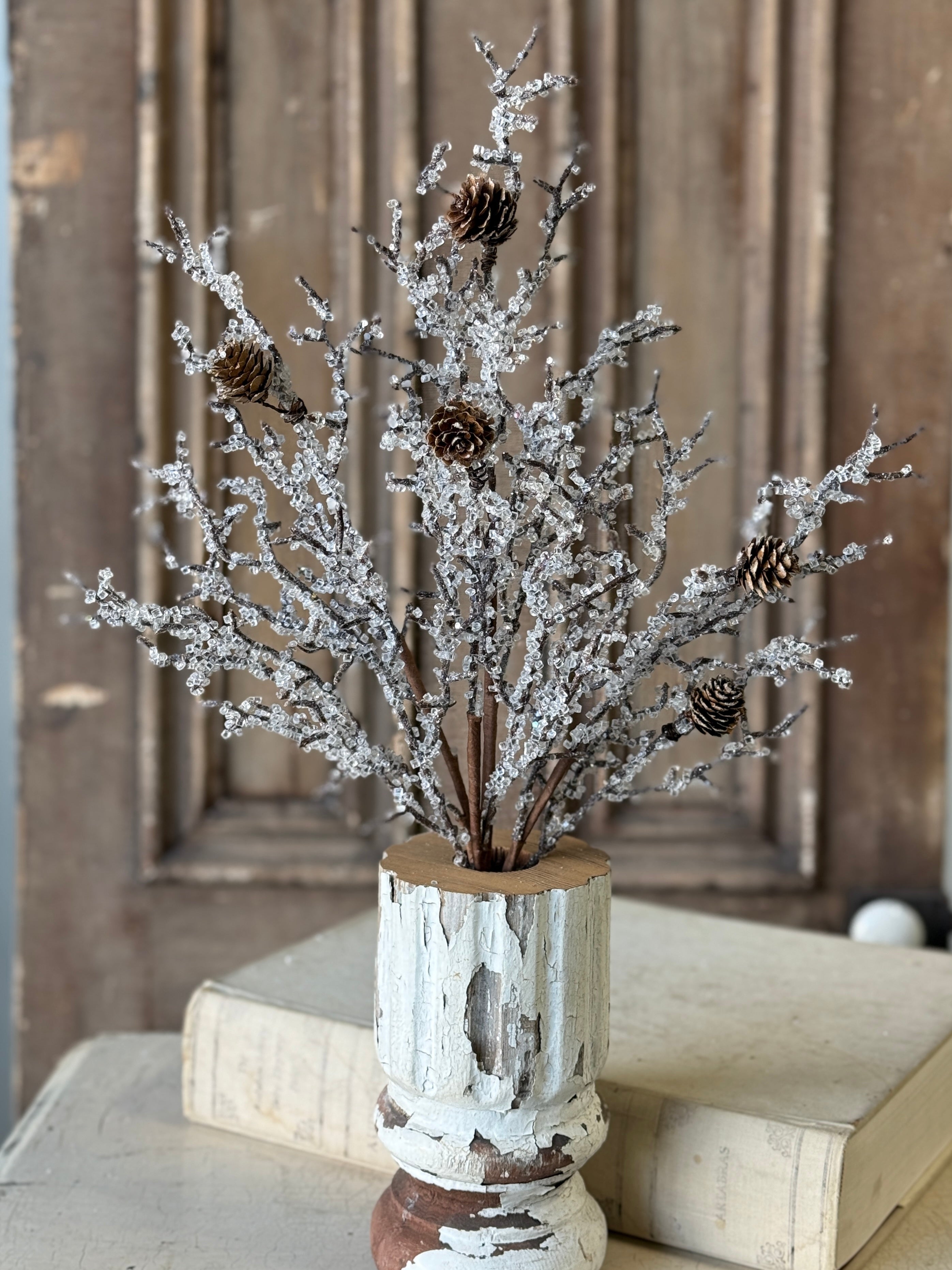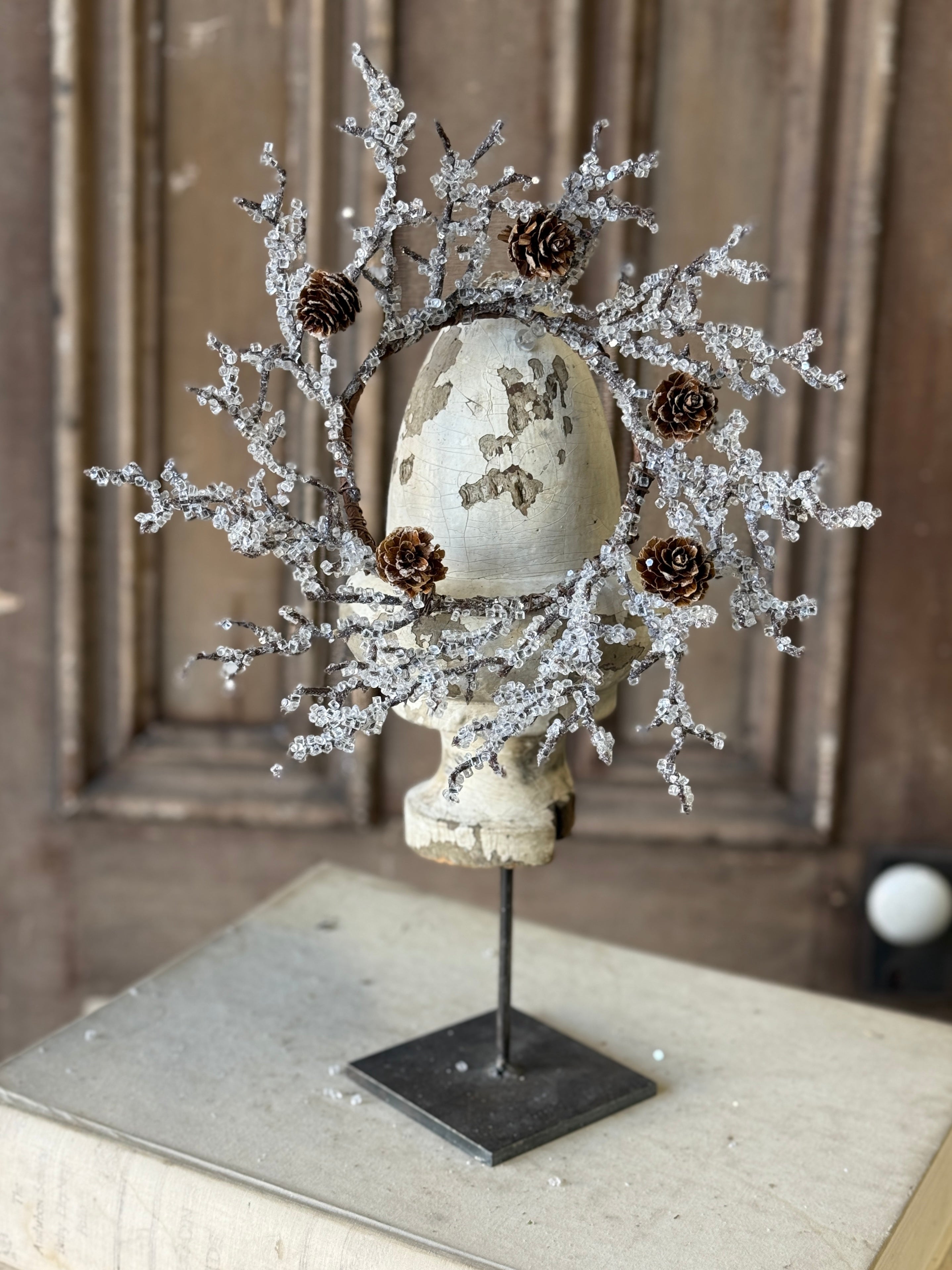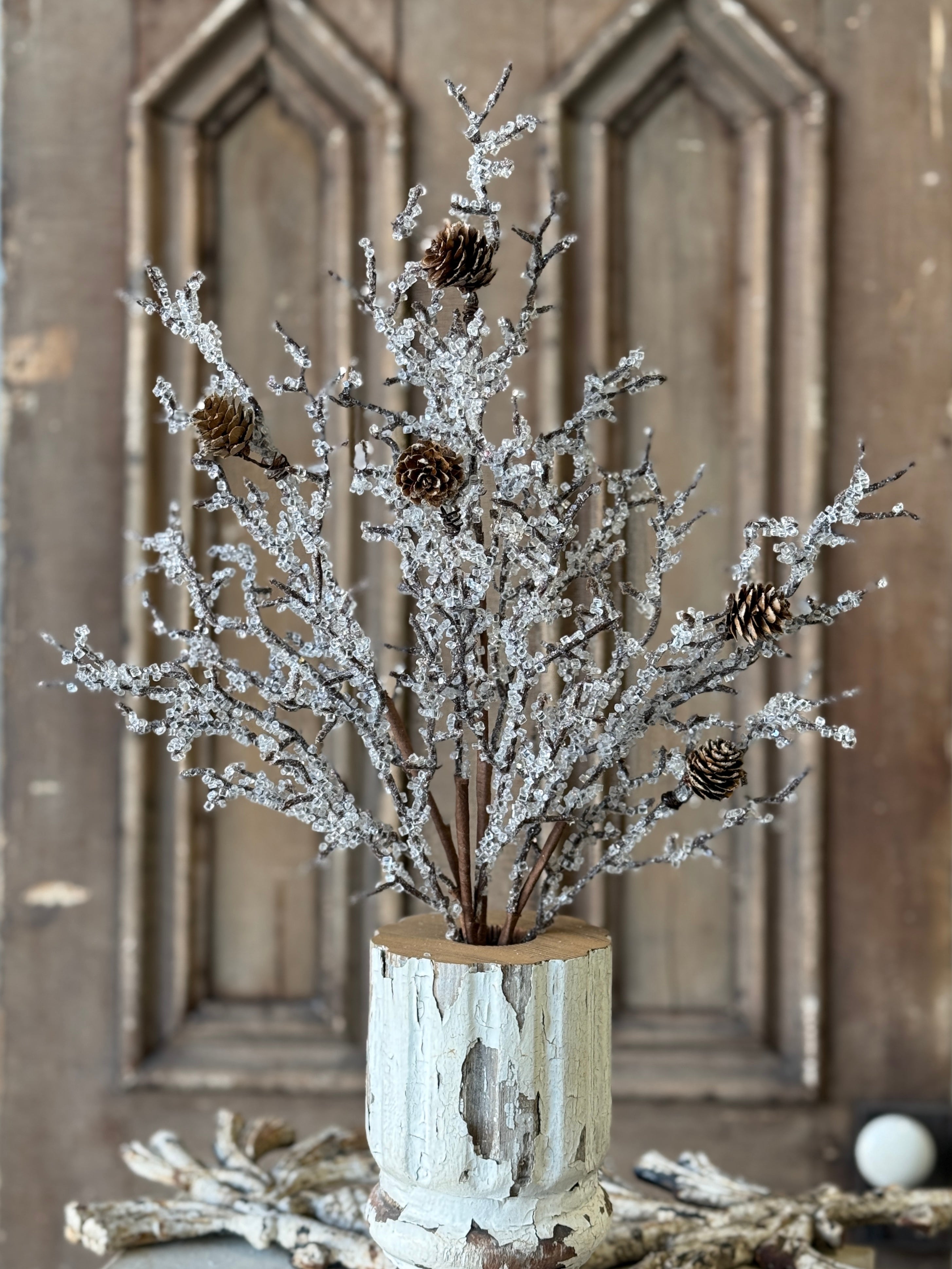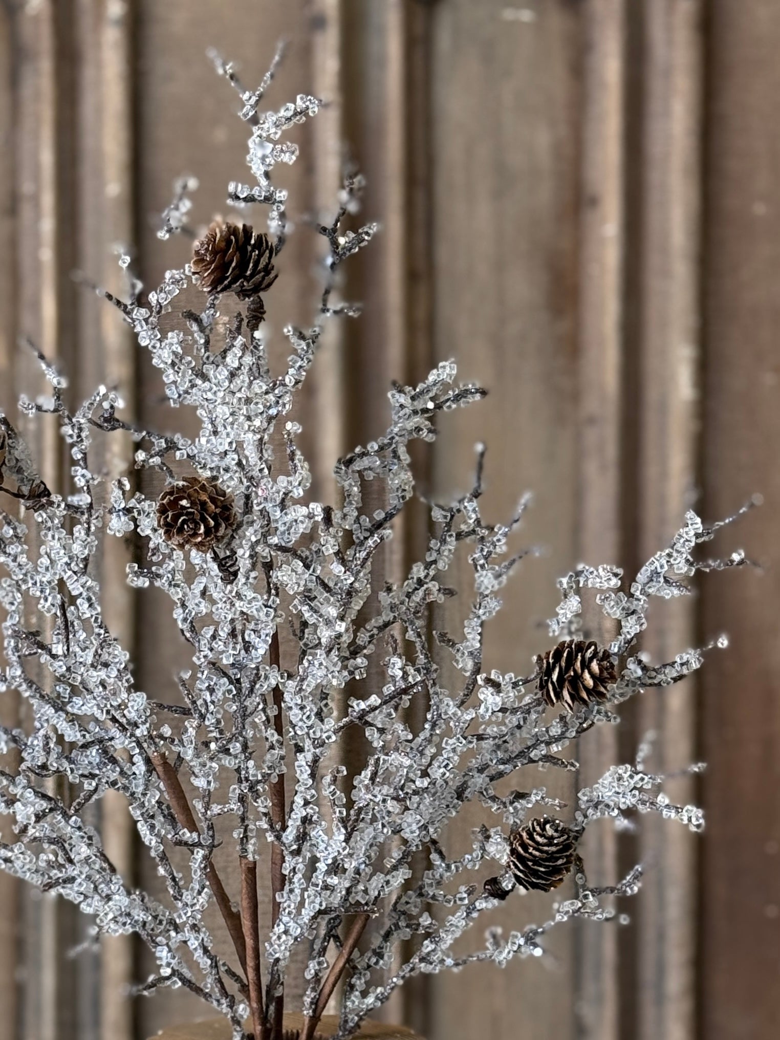 Barren branches woven with ice crystals and laced with small pine cones composes a collection that makes you appreciate the beauty that winter offers.